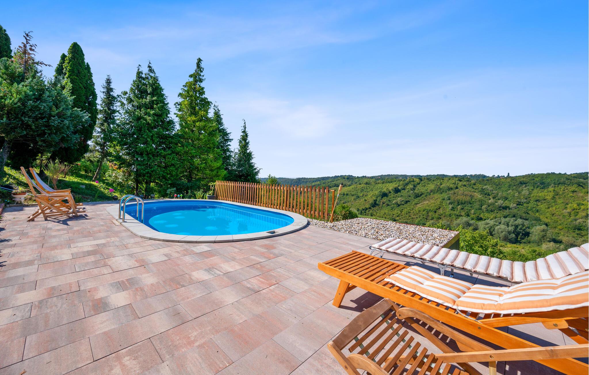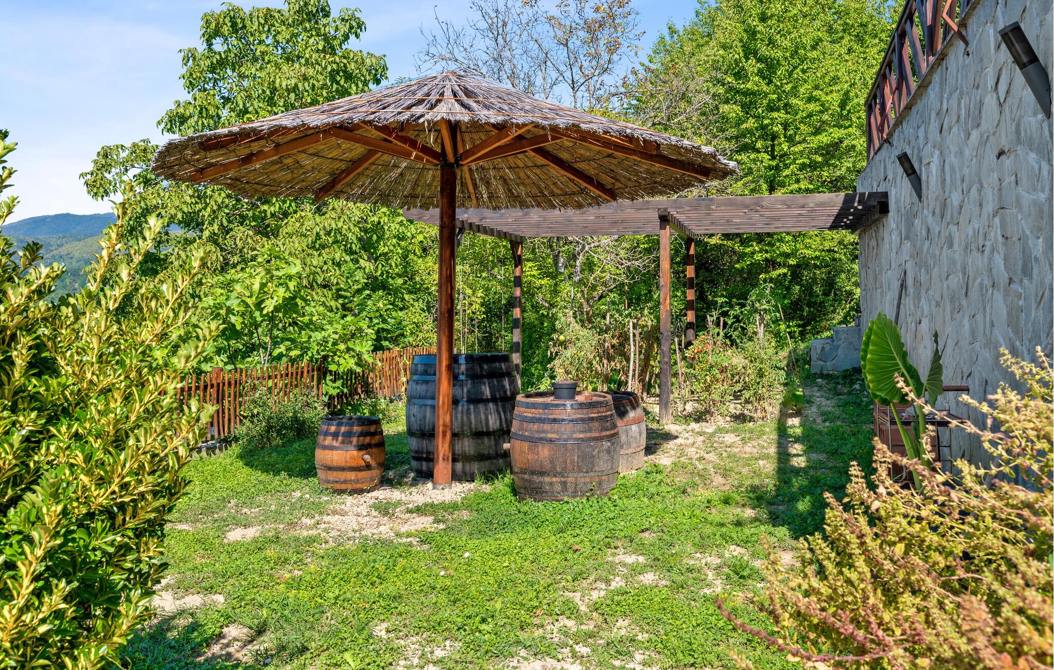 På den store terrasse kan I nyde en fantastisk udsigt over det maleriske landskab. Bakkeejendommen med have i flere niveauer, grillhytte, pool og masser af legeredskaber giver hele familien et perfekt sted at slappe af og nyde.