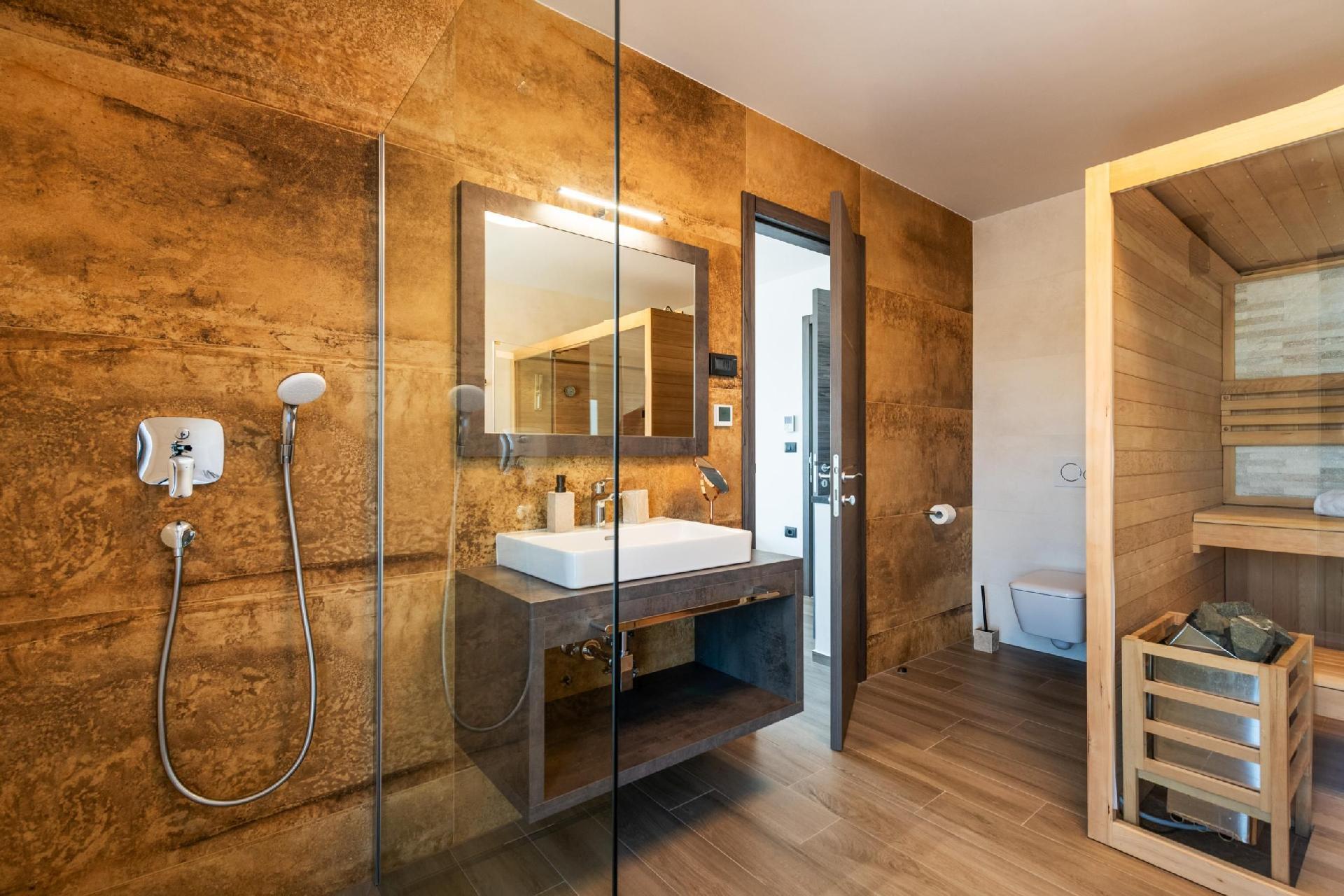 Upstairs, you'll find three more bedrooms. One of them includes a private bathroom with both a shower and hydro-massage bath, a sauna, and access to the balcony. The other two bedrooms each have their own bathroom with a shower and access to the balcony.