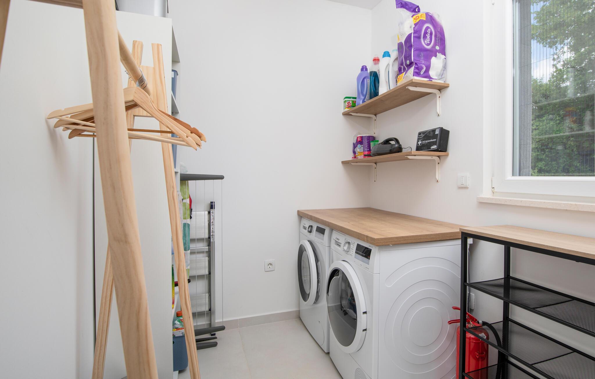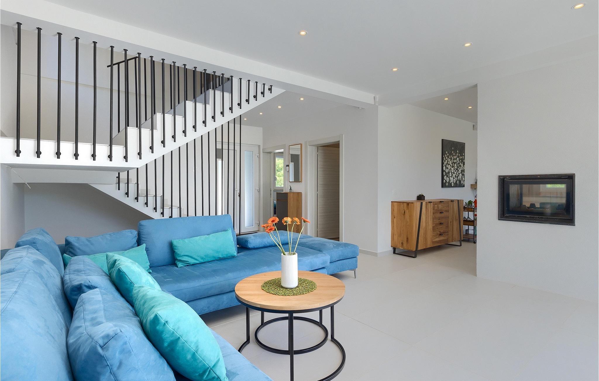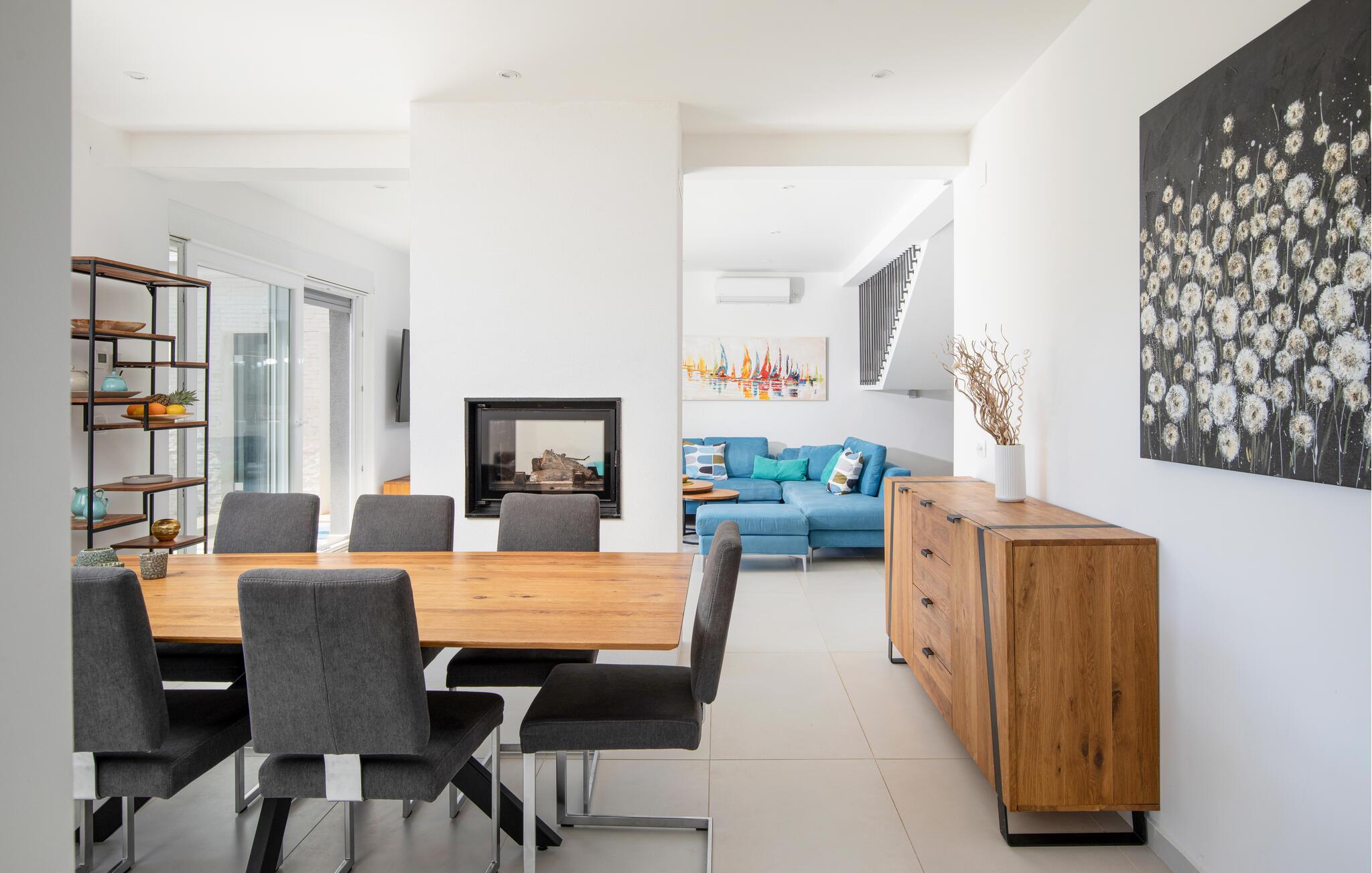 Im Erdgeschoss befinden sich ein durch einen beidseitig einsehbaren Kamin getrenntes und von Sonnenlicht durchflutetes Wohn- und Esszimmer, eine hochmoderne Küche mit hochwertigen Küchengeräten und Bartheke, ein Schlafzimmer mit 2 Einzelbetten und eigenem Badezimmer. mit begehbarer Dusche. Auf derselben Ebene, finden Sie auch noch eine Waschküsche mit Waschmaschine, Trockner und Garderobe.