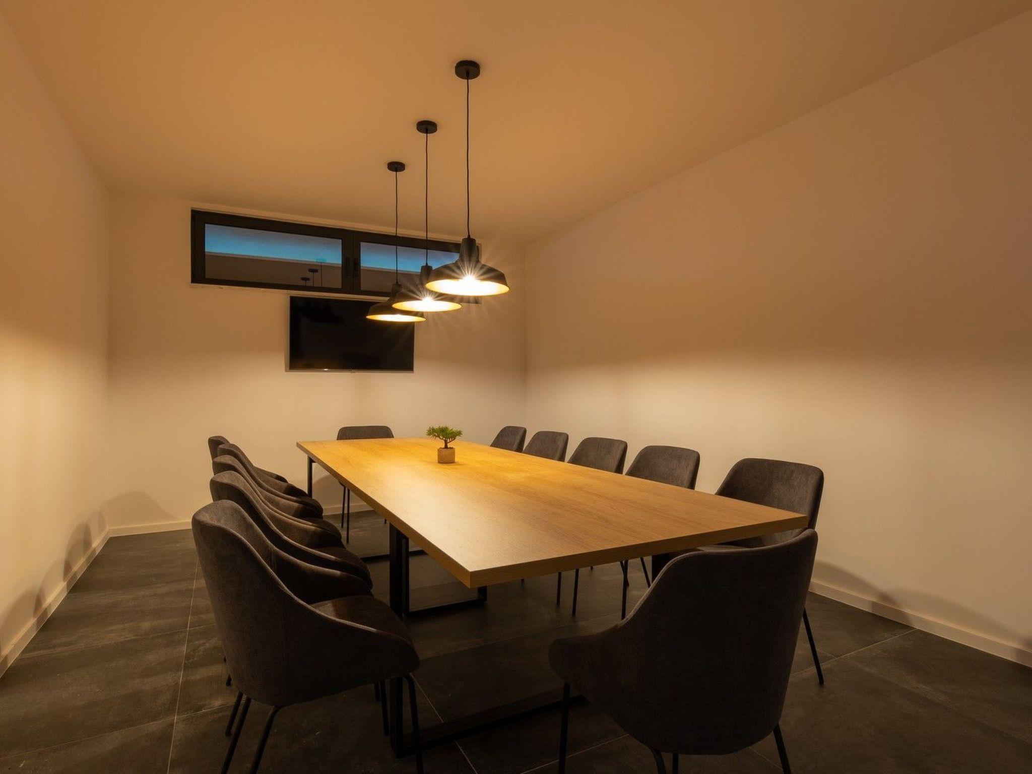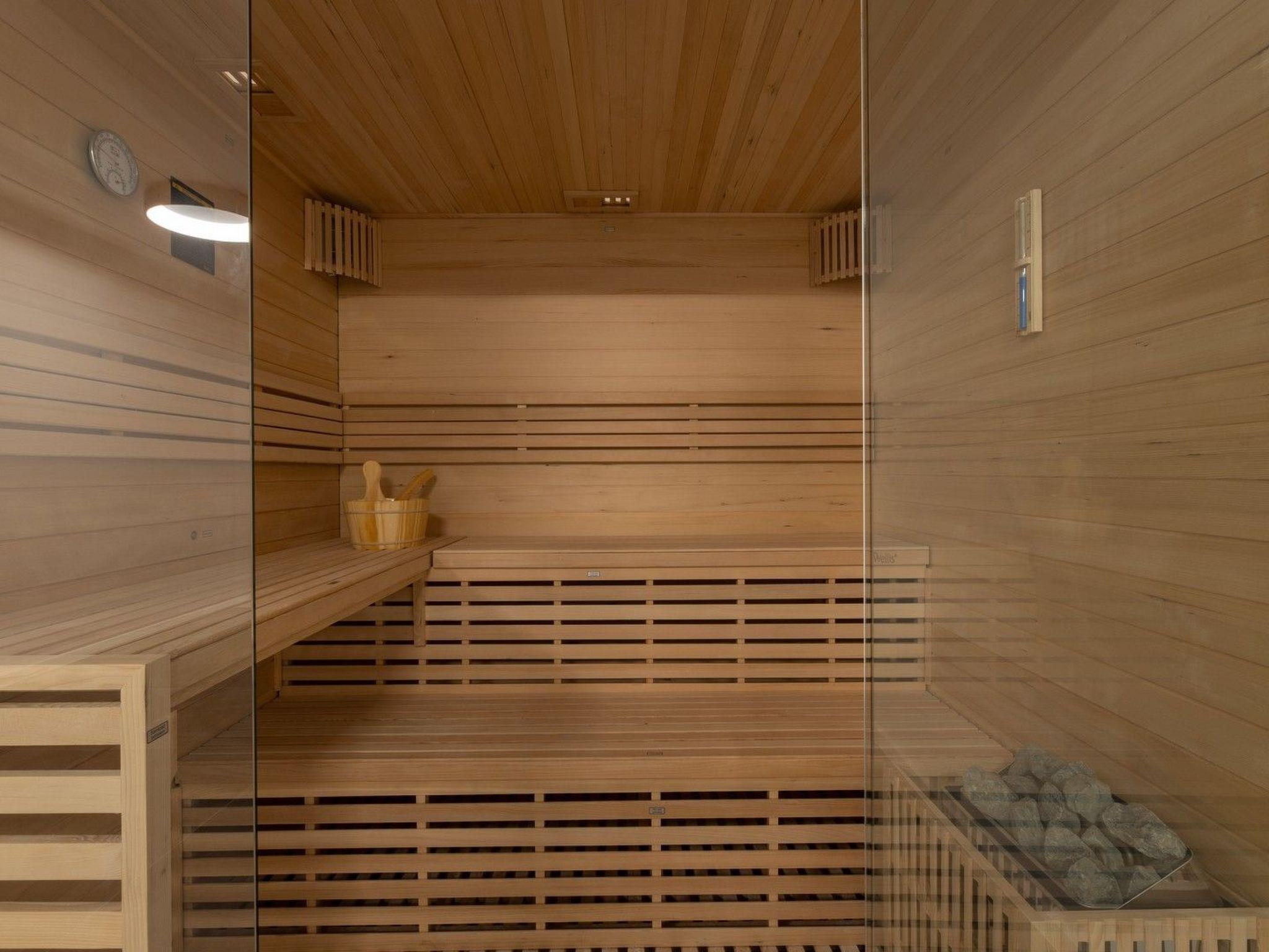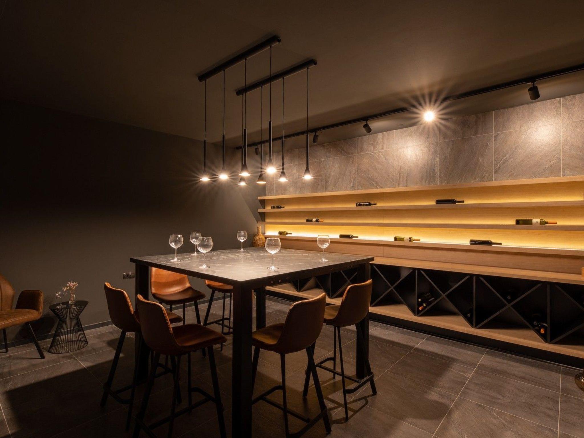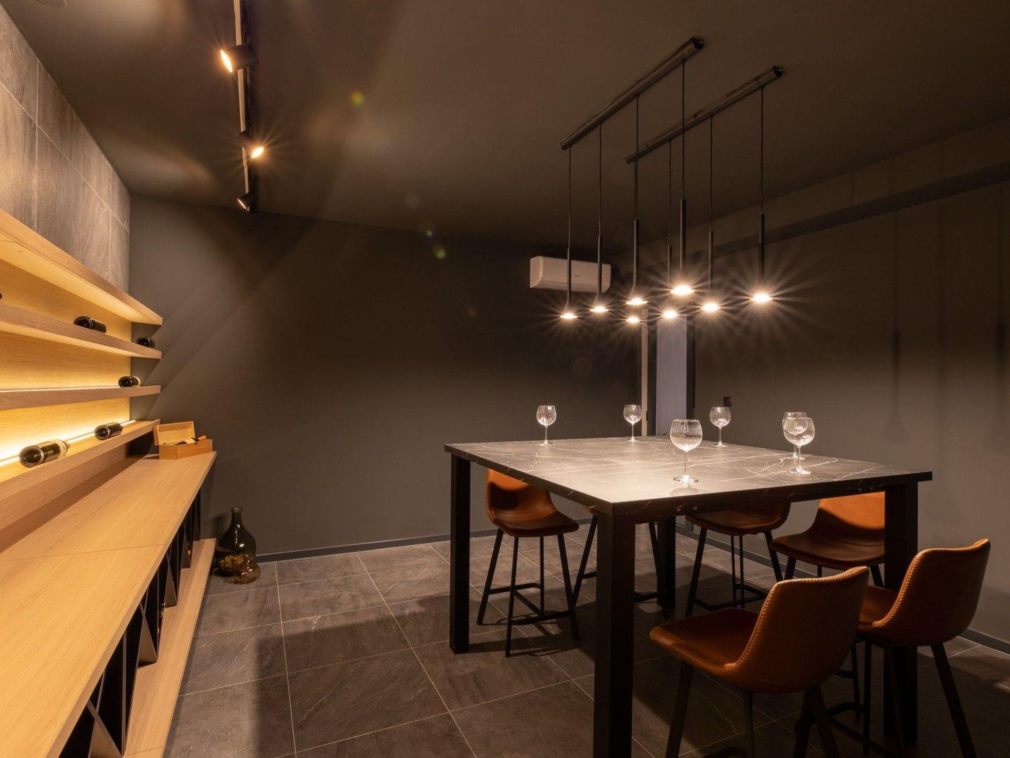 The basement consists of a room with a sauna and gym, a wine cellar, and a meeting room with a kitchen. Access to the wine cellar and meeting room is only available upon request.
