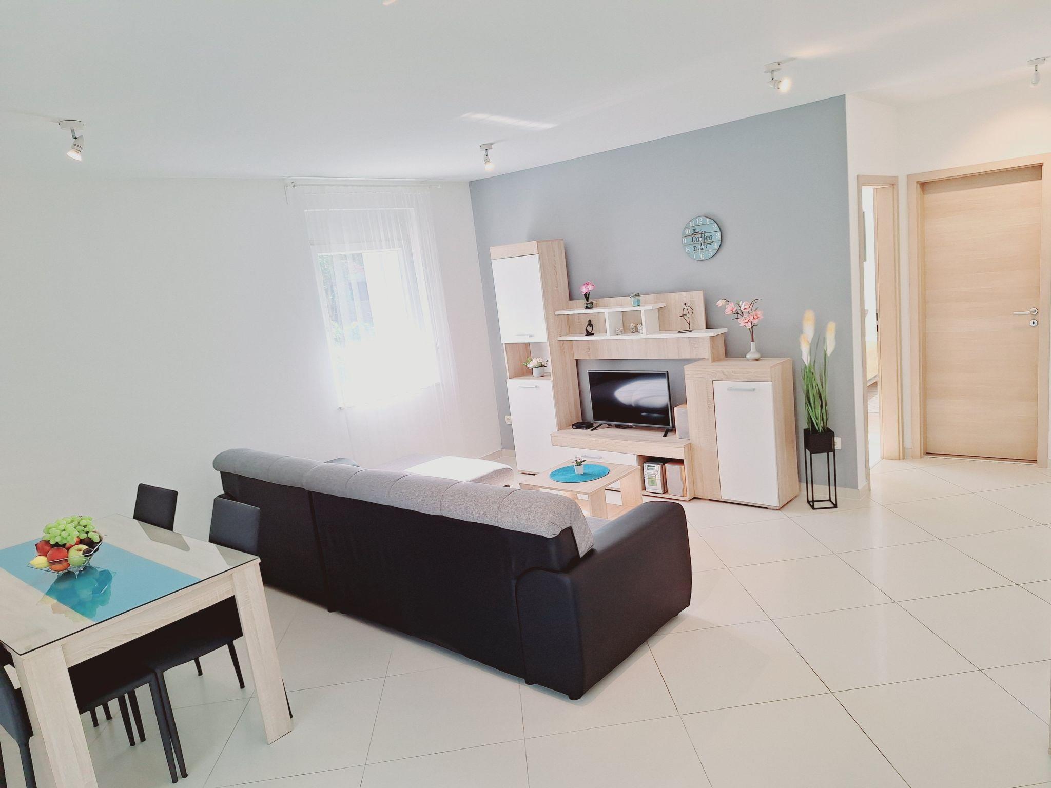 The 48m² apartment can accommodate four people. The centerpiece of the apartment is the spacious living room. It has a comfortable sitting area with a TV and a sofa, which can be converted into a sofa bed (140 x 190cm) for two adults or two children. Right behind the sofa there is a dining space with four chairs. Opposite there is the open kitchen, equipped with a stove, oven, fridge, dishwasher, toaster and kettle. The tiled daylight bathroom provides a shower, WC, washbasin with cupboard underneath, washing machine and an illuminated mirror. The comfortable bedroom has a double bed (160 x 200cm) with two bedside tables and reading lamps, as well as a big wardrobe.