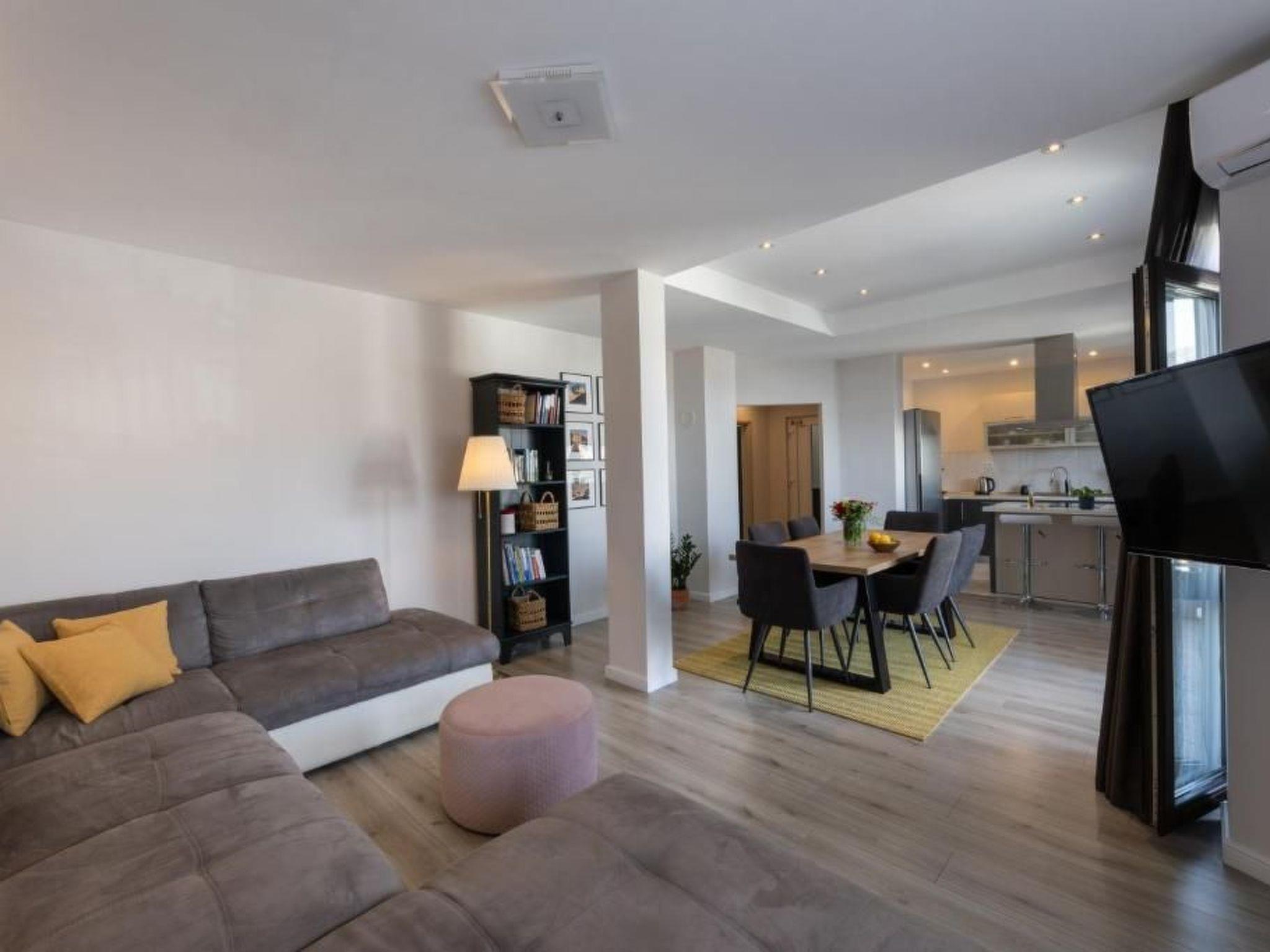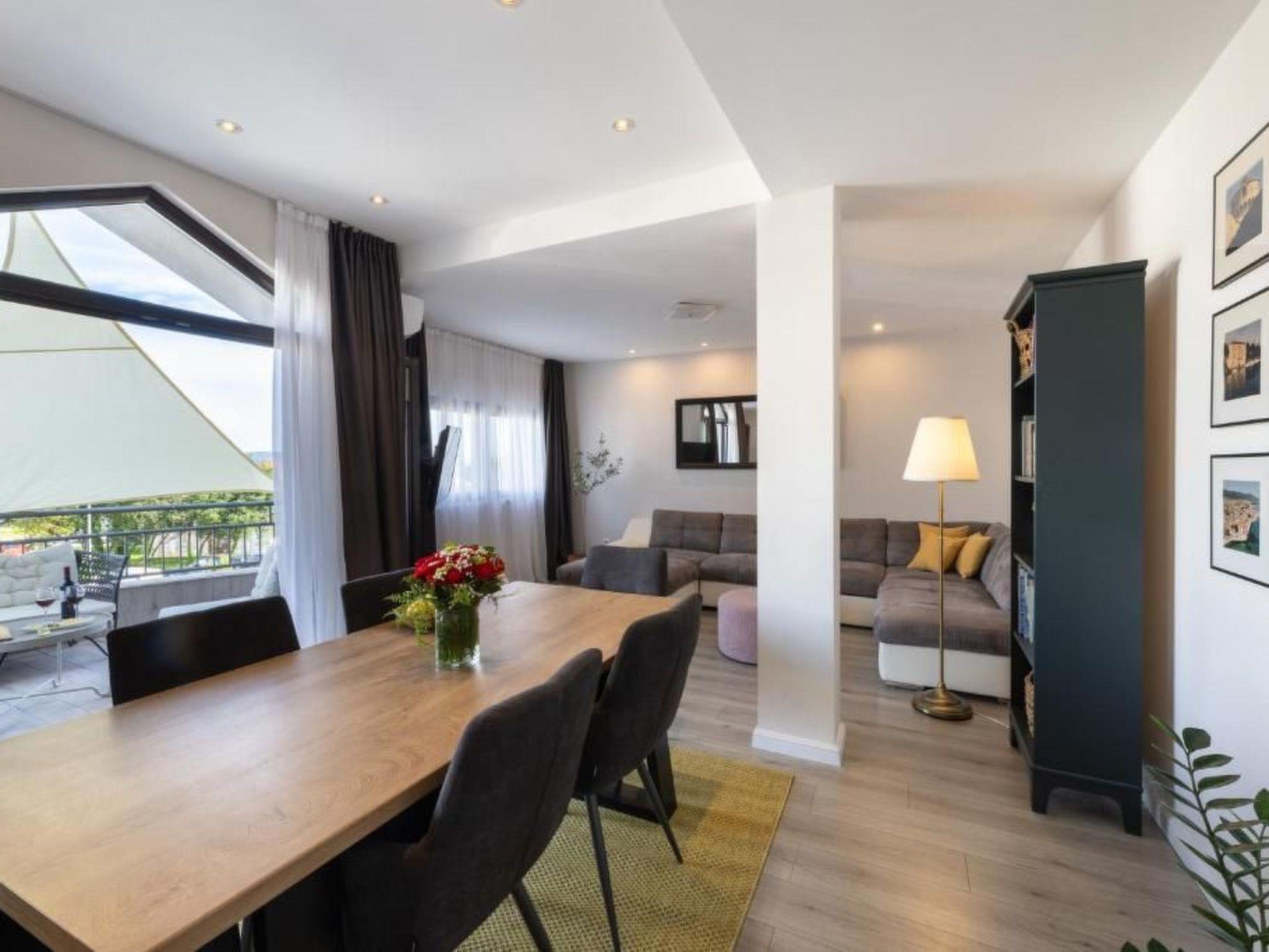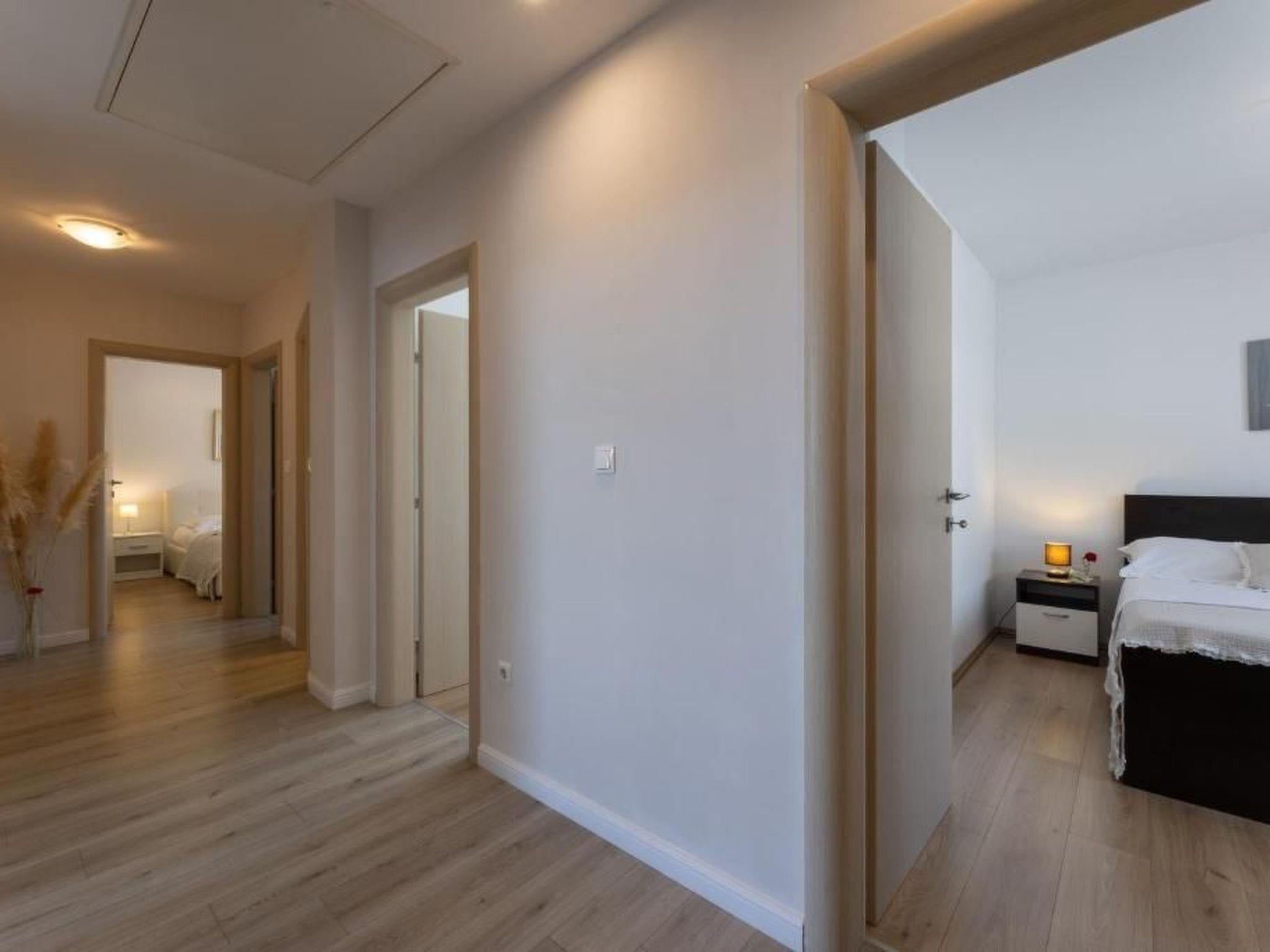 First bedroom contains 1 double bed, its own shower, makeup table and exit to balcony. Second bed contains one single bed and exit to balcony and third bed contains one double bed. There is also one full bathroom and 1 half bathroom (toilet with a sink), laundry area, TV, air conditioning and exit to balcony with a sea view. Also, there is a fully modern equipped kitchen, dining area and a comfortable living room with flat screen TV, library and cozy sofa bed.