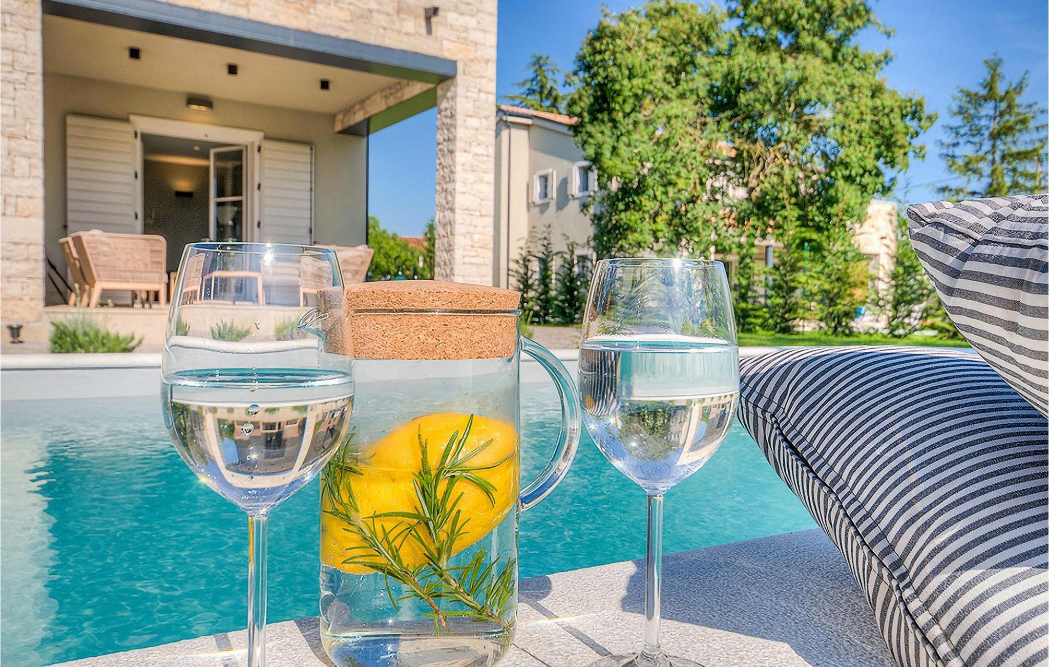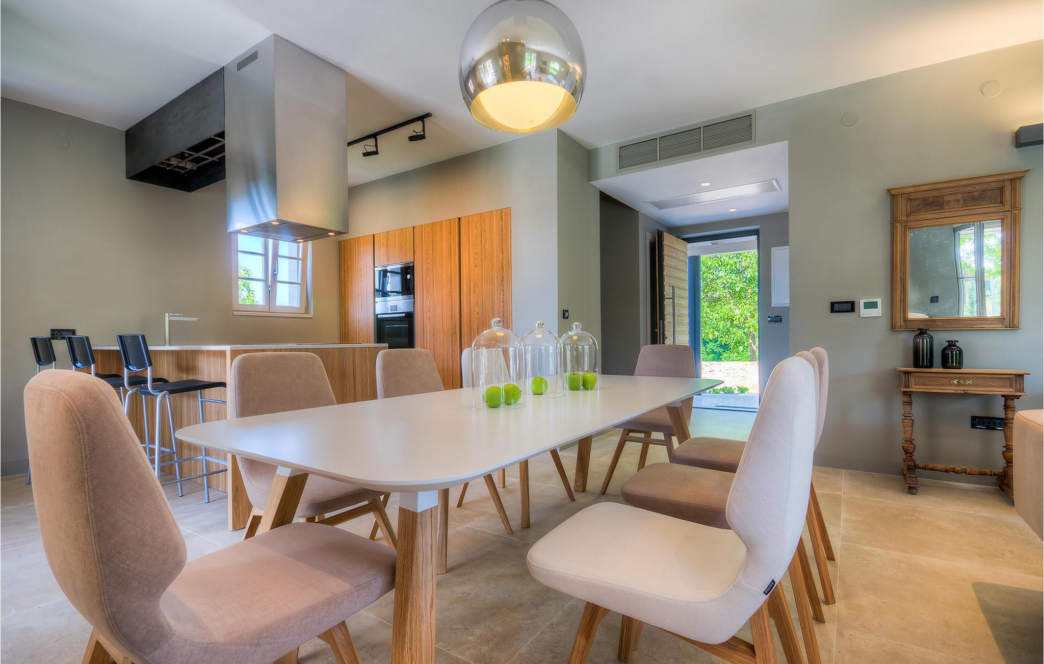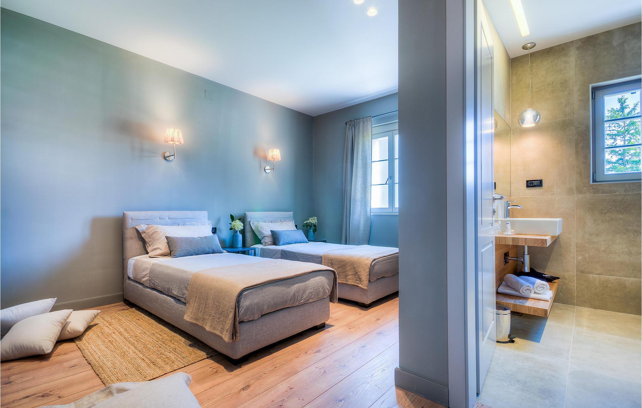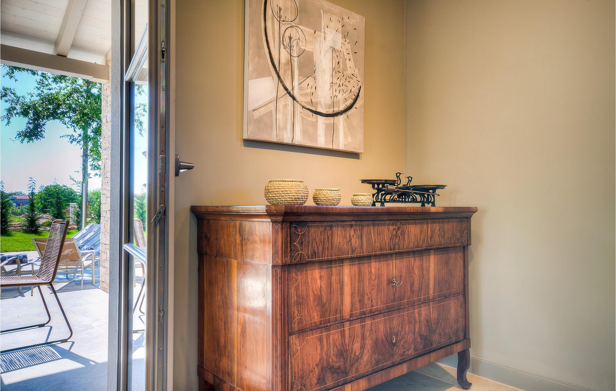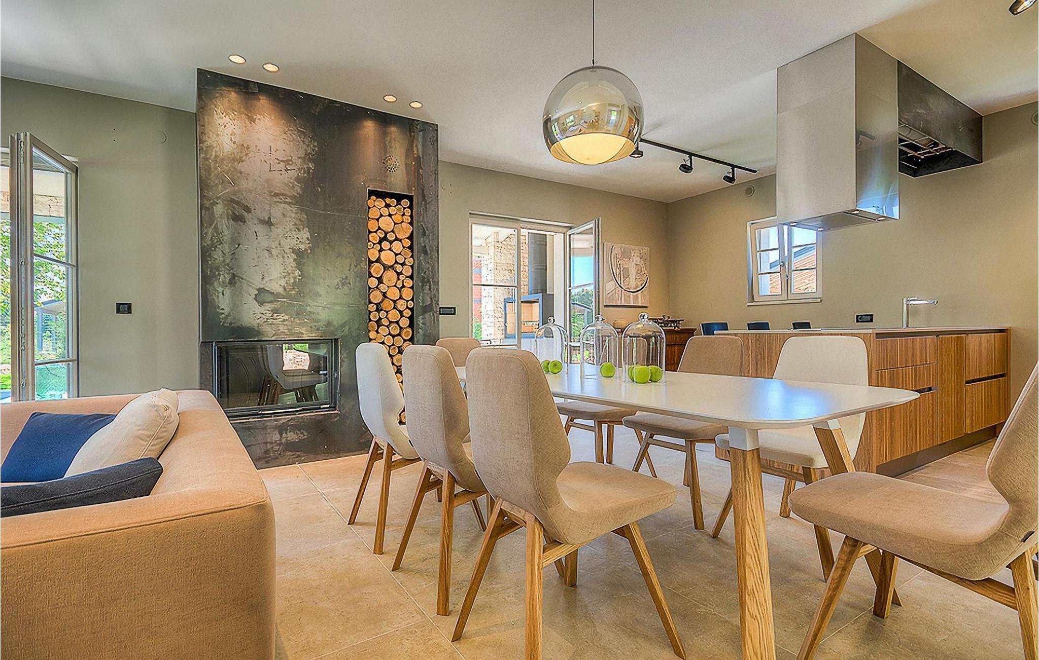 Hvis du ønsker at opleve noget særligt, nedsænket dybt i det billedskønne Istriske landskab i komfort og stil, kunne den dejlige Villa Mia ikke være et bedre valg. Beliggende i en smukt velholdt rummelig have med velplejede græsplæner med cypresser og en indbydende swimmingpool med solterrasse, kan denne pragtfulde ejendom ikke undgå at imponere. De fritlagte stenvægge, smukke skodder og en hyggelig veranda med indbygget grill, al fresco spisestue og loungeområde giver et dejligt førstehåndsindtryk, mens interiøret mere end lever op til dets regning. Udsøgt designet overalt med en blanding af højkvalitets moderne og vintage møbler, iøjnefaldende belysning og store franske vinduer, der holder rummene særligt lyse og luftige, huset har en varm, afslappende følelse, der omfatter både traditionel og moderne smag. I stueetagen dominerer et smukt, aflangt rum opdelt i opholds-, spise- og køkkenområder med en elegant designet pejs og en behagelig sofa til at synke ned i og udveksle historier om dagens aktiviteter. Et af de fire udsøgt møblerede soveværelser ligger i stueetagen, mens de tre andre er fordelt på øverste etage, og alle nyder godt af at have et fladskærms-tv og et smukt indrettet badeværelse. Der er også en smuk balkon på første sal, hvorfra du kan nyde den fantastiske udsigt over landskabet. Villa Mia kan varmt anbefales, ikke kun som en base for at opdage Istriens indiskutable charme, men også for familier, der ønsker at have det sjovt og slappe af i luksuriøse omgivelser. Beliggende lige mellem de tre charmerende små middelalderbyer Žminj, Svetvincenat og Kanfanar, kunne denne ejendom ikke være bedre designet og placeret til en ferie, der kombinerer dovne dage med dolce far niente med sightseeing i nogle af de smukkeste områder i Istrien. De maleriske middelalderbyer på en bakketop, traditionelle landlige landsbyer, hvor tiden har stået stille, og landskaber af uovertruffen skønhed er ideelle til naturskønne køreture, cykling og gåture. Lækkert traditionelt køkken og vin i verdensklasse, som denne region er kendt for, tilføjer de sidste ingredienser til en mindeværdig ferie. Uanset hvor du går, vil lokalbefolkningen tilbyde en vidunderlig varm velkomst i denne fascinerende region. Du kan også købe dagligvarer direkte fra de lokale producenter. Og hvis du er i humør til en anderledes slags action, er det krystalklare Adriaterhav med sine smukke strande, samt de travle turist-hot spots kun en kort køretur væk.