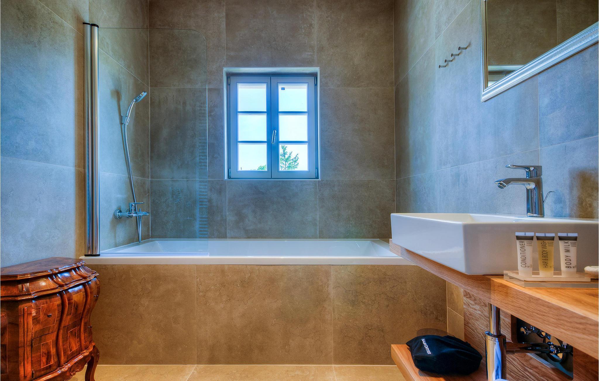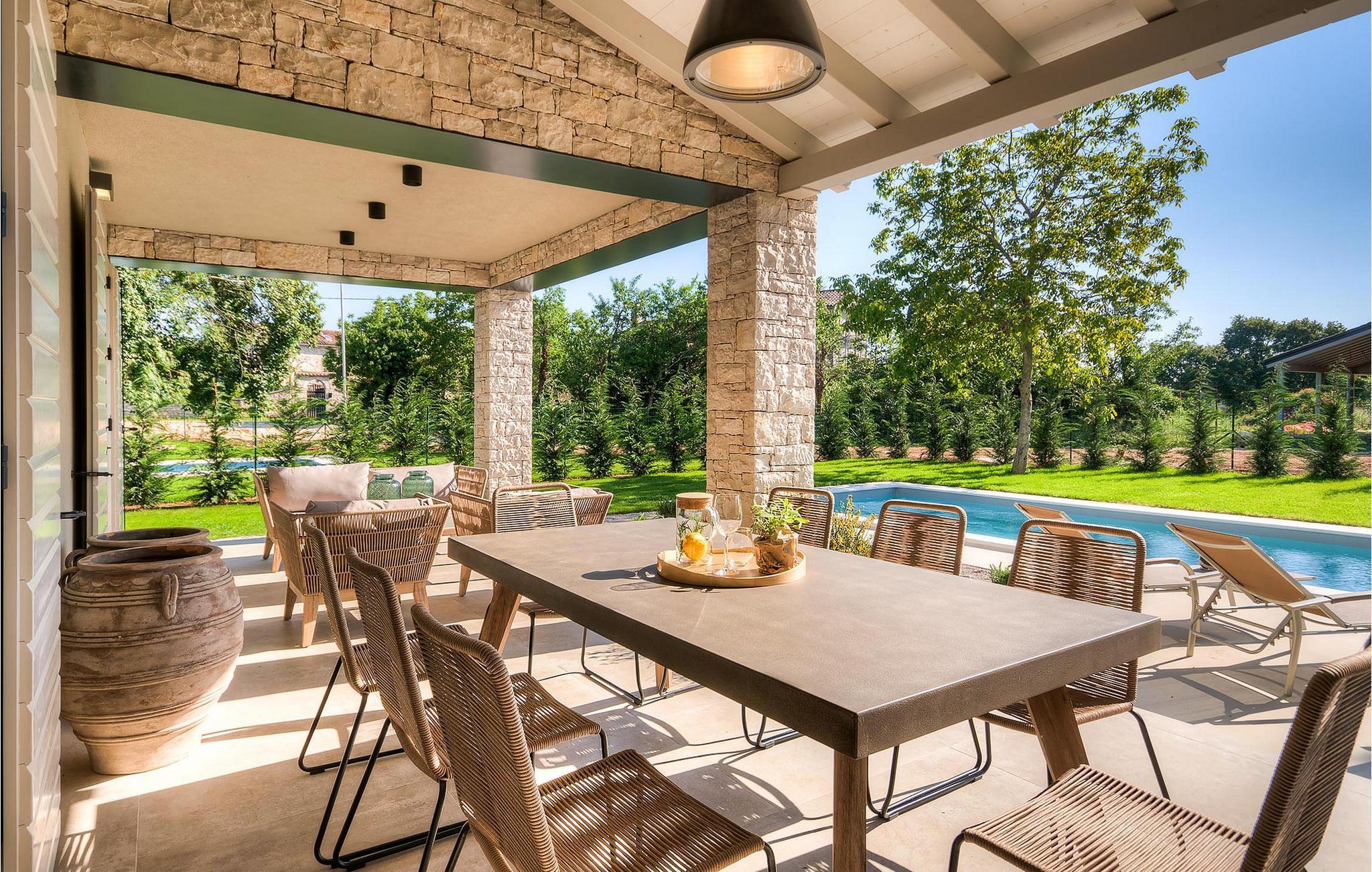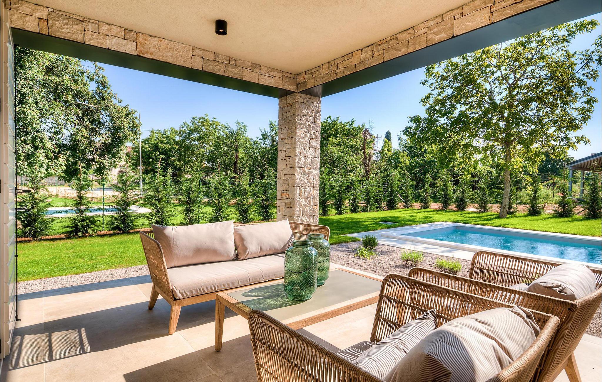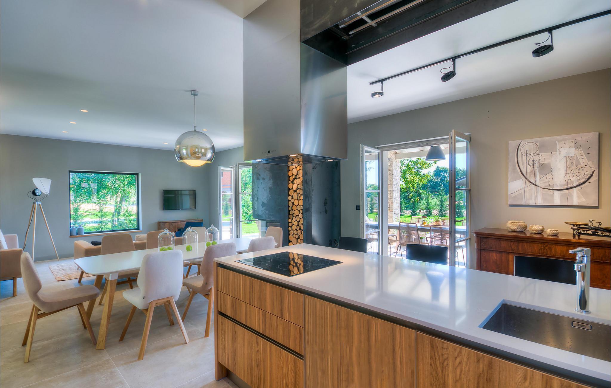 Hvis du ønsker at opleve noget særligt, nedsænket dybt i det billedskønne Istriske landskab i komfort og stil, kunne den dejlige Villa Mia ikke være et bedre valg. Beliggende i en smukt velholdt rummelig have med velplejede græsplæner med cypresser og en indbydende swimmingpool med solterrasse, kan denne pragtfulde ejendom ikke undgå at imponere. De fritlagte stenvægge, smukke skodder og en hyggelig veranda med indbygget grill, al fresco spisestue og loungeområde giver et dejligt førstehåndsindtryk, mens interiøret mere end lever op til dets regning. Udsøgt designet overalt med en blanding af højkvalitets moderne og vintage møbler, iøjnefaldende belysning og store franske vinduer, der holder rummene særligt lyse og luftige, huset har en varm, afslappende følelse, der omfatter både traditionel og moderne smag. I stueetagen dominerer et smukt, aflangt rum opdelt i opholds-, spise- og køkkenområder med en elegant designet pejs og en behagelig sofa til at synke ned i og udveksle historier om dagens aktiviteter. Et af de fire udsøgt møblerede soveværelser ligger i stueetagen, mens de tre andre er fordelt på øverste etage, og alle nyder godt af at have et fladskærms-tv og et smukt indrettet badeværelse. Der er også en smuk balkon på første sal, hvorfra du kan nyde den fantastiske udsigt over landskabet. Villa Mia kan varmt anbefales, ikke kun som en base for at opdage Istriens indiskutable charme, men også for familier, der ønsker at have det sjovt og slappe af i luksuriøse omgivelser. Beliggende lige mellem de tre charmerende små middelalderbyer Žminj, Svetvincenat og Kanfanar, kunne denne ejendom ikke være bedre designet og placeret til en ferie, der kombinerer dovne dage med dolce far niente med sightseeing i nogle af de smukkeste områder i Istrien. De maleriske middelalderbyer på en bakketop, traditionelle landlige landsbyer, hvor tiden har stået stille, og landskaber af uovertruffen skønhed er ideelle til naturskønne køreture, cykling og gåture. Lækkert traditionelt køkken og vin i verdensklasse, som denne region er kendt for, tilføjer de sidste ingredienser til en mindeværdig ferie. Uanset hvor du går, vil lokalbefolkningen tilbyde en vidunderlig varm velkomst i denne fascinerende region. Du kan også købe dagligvarer direkte fra de lokale producenter. Og hvis du er i humør til en anderledes slags action, er det krystalklare Adriaterhav med sine smukke strande, samt de travle turist-hot spots kun en kort køretur væk.