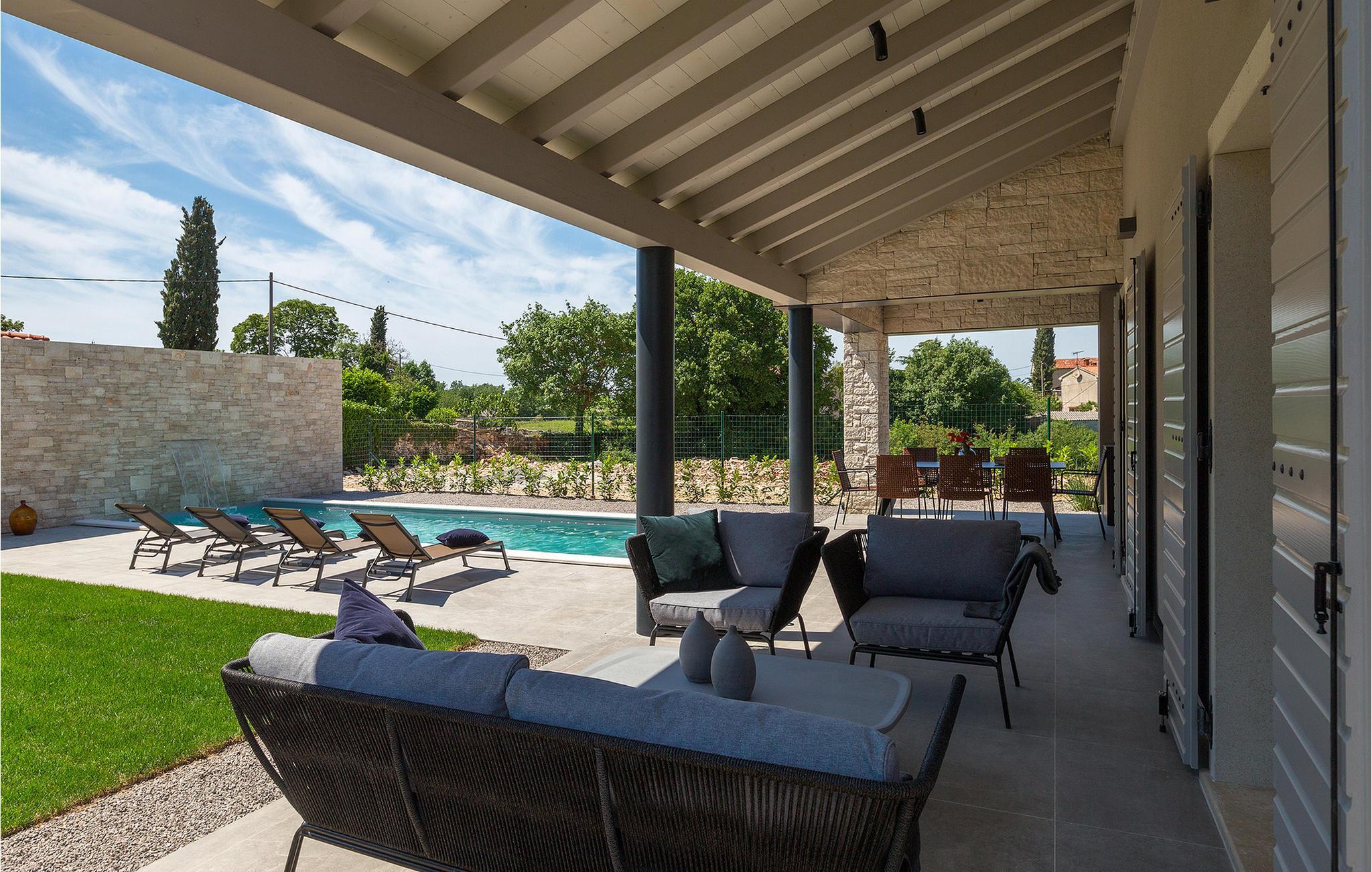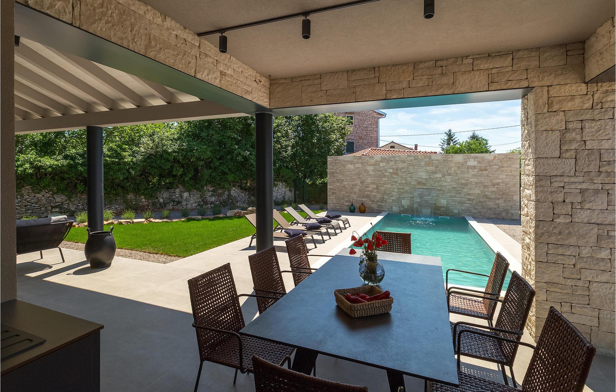 Villa Sivati ist die genau richtige Unterkunft für einen Urlaub mit Komfort und Stil. Mit dem einladenden Pool und der schönen Sonnenterrasse, wird Sie dieses traumhafte Anwesen ganz bestimmt faszinieren. Die gemütliche Veranda hat einen eingebauten Grill, sowie al fresco Ess- und Loungebereich, während der Innenbereich geschmackvoll gestaltet mit einer Mischung aus modernen und Vintage-Möbeln, attraktiver Beleuchtung und großen Fenstertüren, die die Zimmer besonders hell und luftig halten. Das Haus versorgt eine warme, entspannende Atmosphäre, die sowohl traditionellen als auch modernen Geschmäckern zuspricht. Das Erdgeschoss ist ein großzügiger, offener Raum verteilt in Wohn-, Ess- und Kochbereiche mit einem eleganten Kamin und bequemen Sofas. Eines der vier stilvoll eingerichteten Schlafzimmer befindet sich im Erdgeschoss, während die anderen drei über die obere Etage verteilt sind, jedes mit TV, Klimaanlage und eigenem wunderschön eingerichteten Badezimmer. Der erste Stock verfügt noch über einen hübschen Balkon, von wo aus Sie die herrliche Aussicht über die umgebende Landschaft genießen können.Gerade zwischen den bezaubernden kleinen mittelalterlichen Ortschaften von Žminj, Svetvincenat und Kanfanar gelegen, könnte diese wunderschöne Villa nicht besser gestaltet werden für einen Urlaub, der faule Tage von dolce far niente mit Besichtigungstouren in einer der schönsten Gebieten Istriens kombiniert. Die malerischen, mittelalterlichen Hügelstädtchen, traditionelle Dörfer, wo Zeit stillgestanden ist, sowie Landschaften der einzigartigen Schönheit sind ideal für Aussichtsfahrten, Radtouren und Wandern. Hervorragende traditionelle Küche und erstklassige Weine für welche diese Region weltbekannt ist, fügen die letzten Zutaten zu einem unvergesslichen Urlaub hinzu. Direkt von den lokalen Herstellern können Sie auch Lebensmittel kaufen. Und wenn Sie in der Stimmung für etwas Anderes sind, ist die Adria mit ihren wunderschönen Stränden, sowie die besuchten touristischen Hotspots nur eine kurze Autofahrt entfernt.