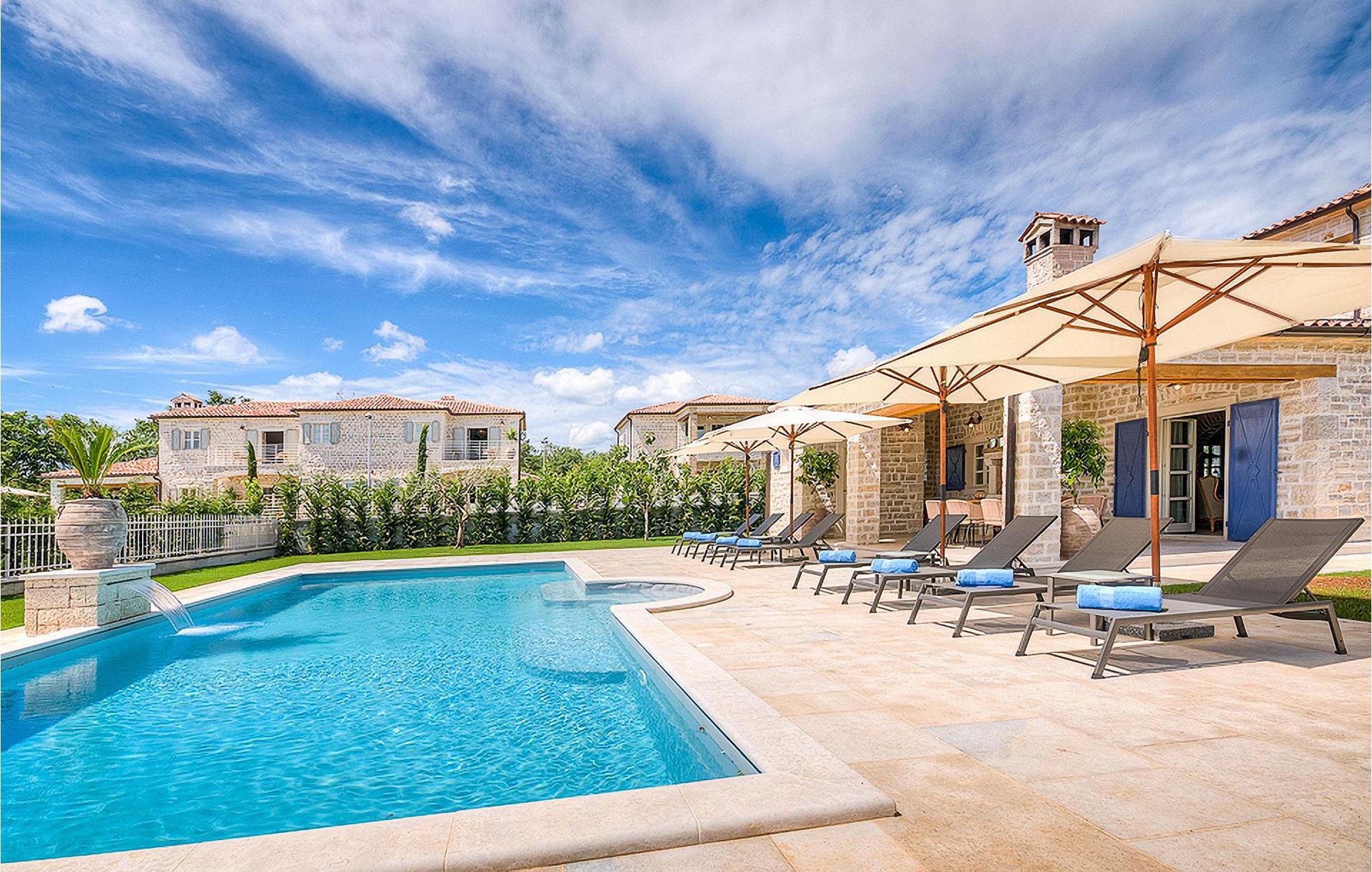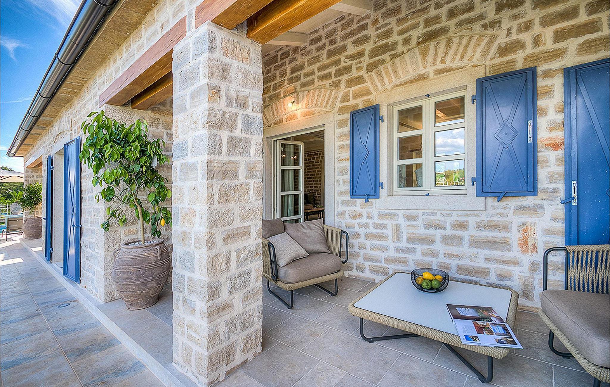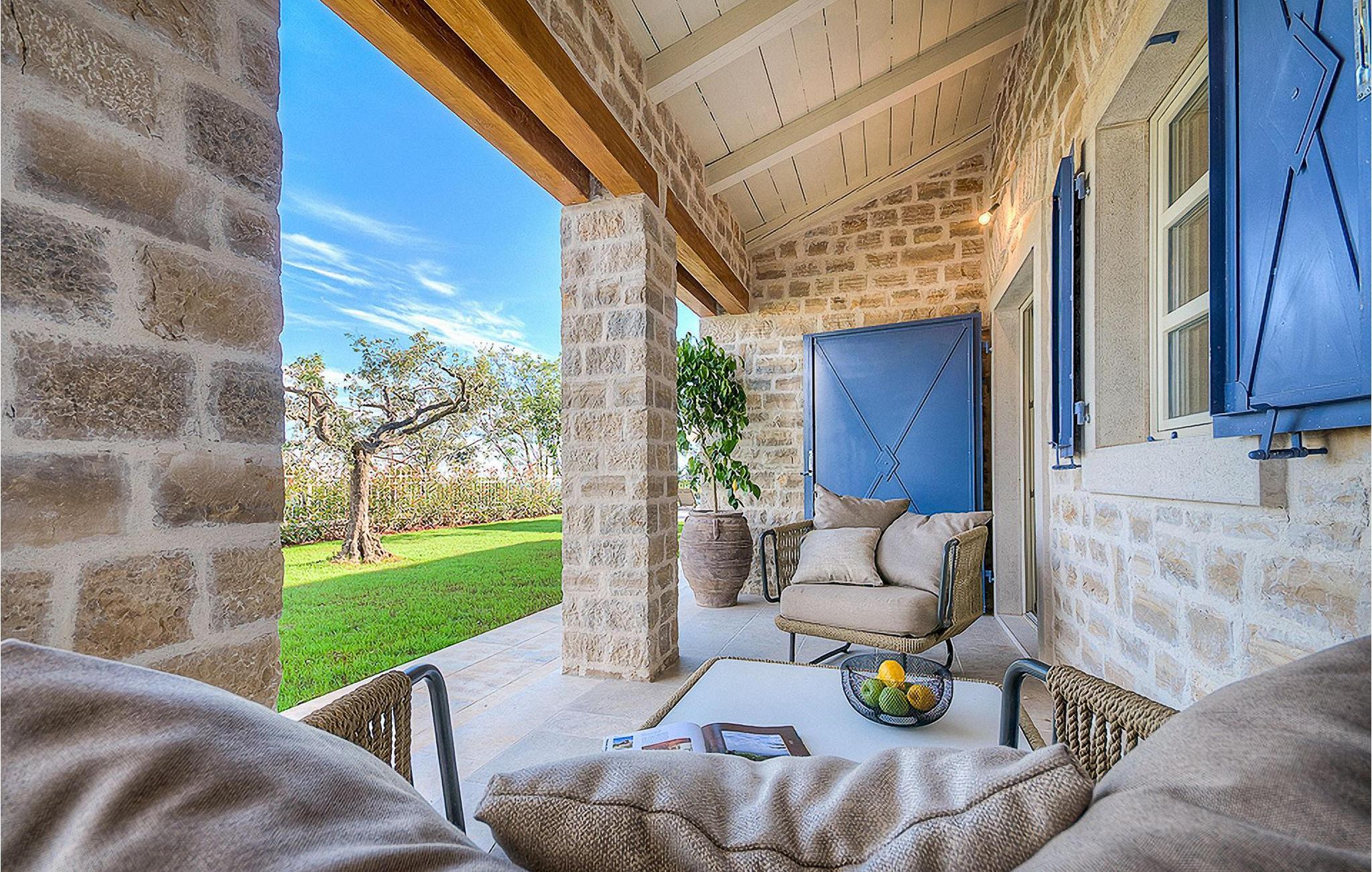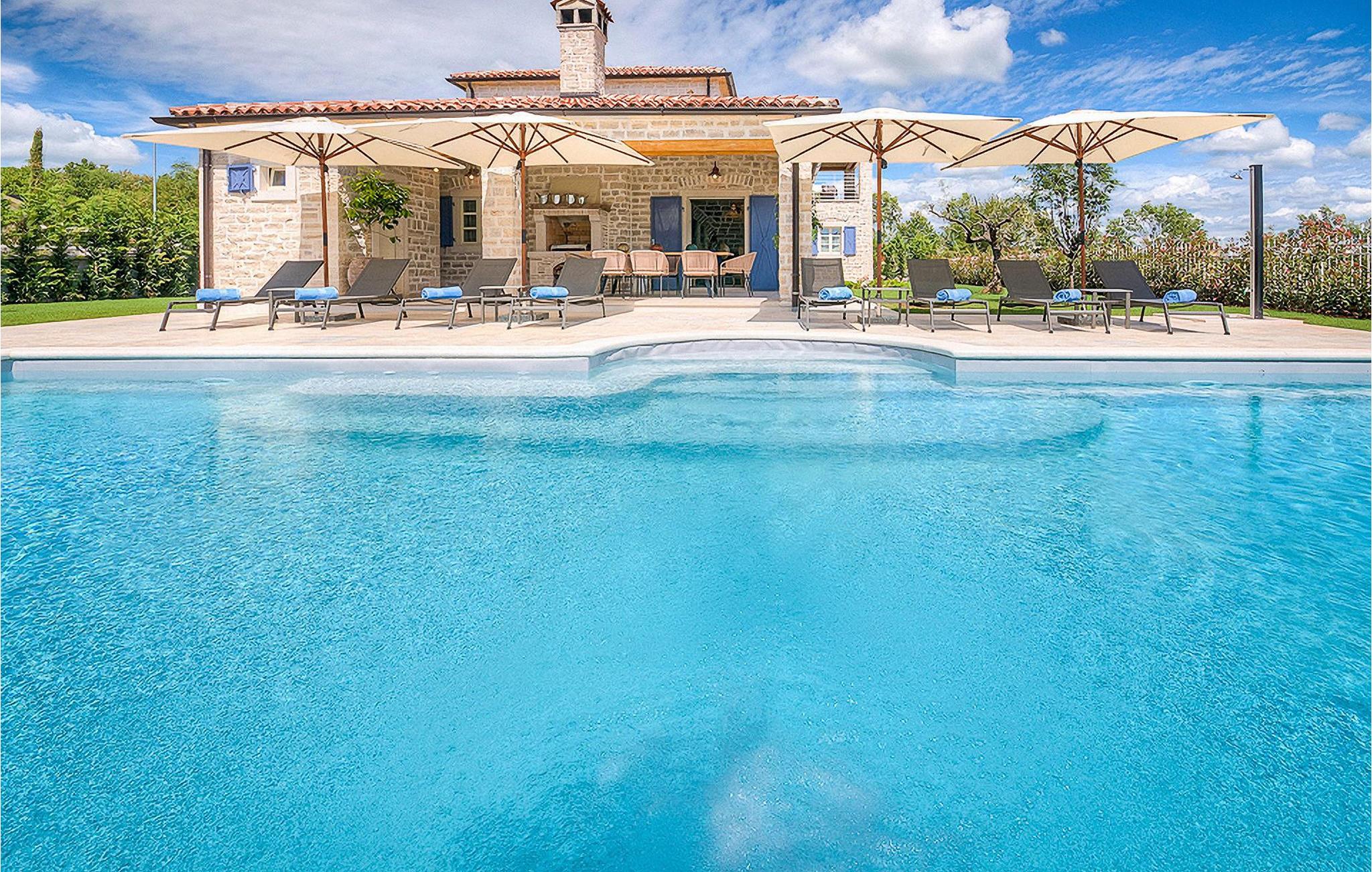 Denne smukke villa, sammen med Villa Nevia, Villa Elena og Villa Zoe, ligger i et luksusprojekt med 5600 m2 privat jord, der tilbyder gæsterne af disse 4 villaer en økologisk have med årstidens grøntsager, udendørs fitness, 2 tennisbaner, 2 petanquebaner, samt baner til håndbold, fodbold, basketball og volleyball. For en ægte istrisk fornemmelse er der også 3 boskariner, hvide grå langhornede istriske kvæg, et symbol på regionen. Elegant, sofistikeret og fremragende beliggende midt i det maleriske istriske landskab, men alligevel inden for rækkevidde af solrige strande og livlige badebyer, tilbyder Villa Elli luksuriøs indkvartering, hvor du øjeblikkeligt kan slappe af og nyde hvert minut af din ferie. Stueetagen er udelukkende dedikeret til overdådig bolig, med et vidunderligt langt værelse opdelt af buegange i opholds- og spise-/madlavningsområder med franske døre, der bringer overfloden af varmt istrisk lys indenfor. Fritlagt murværk, bjælkelofter og en smuk åben pejs skaber en varm og behagelig atmosfære, mens en blanding af moderne og vintage møbler og udsøgt indretning giver dig komfort af høj kvalitet. Tre soveværelser er fordelt over den øverste etage, mens det fjerde åbner direkte til det indbydende private poolområde, som udgør et fantastisk sted at slappe af, herunder en dejlig overdækket, autentisk grill med spisebord, der gør et vidunderligt tilflugtssted fra solen eller det perfekte sted at nyde dine udendørs måltider. Du kommer aldrig til at mangle ting at gøre og steder at besøge, hvilket gør denne smukke villa til en god base for din ferie i Istrien. Villa Elli er beliggende i den centrale del af Istrien-halvøen, nær den lille by Kanfanar. Den gamle arkitektur i byen og de omkringliggende landsbyer er velbevaret, og vinmarker og oliven dominerer dette område med varmt middelhavsklima. Kanfanar og dets omkringliggende landskab er kendt, ikke kun for deres historiske og kulturelle arv, men for ægte istrisk køkken. Istrien er et unikt og fortryllet sted, der har budt velkommen til besøgende og bosættere fra alle dele af verden, så længe vi har nedtegnet historie. Byen Pula med dets romerske amfiteater og Brijuni nationalpark med en 18-hullers golfbane ligger kun 30 minutters kørsel derfra. Det er et fantastisk sted at nyde maden, historien og trods alt at slappe af. En bil anbefales.