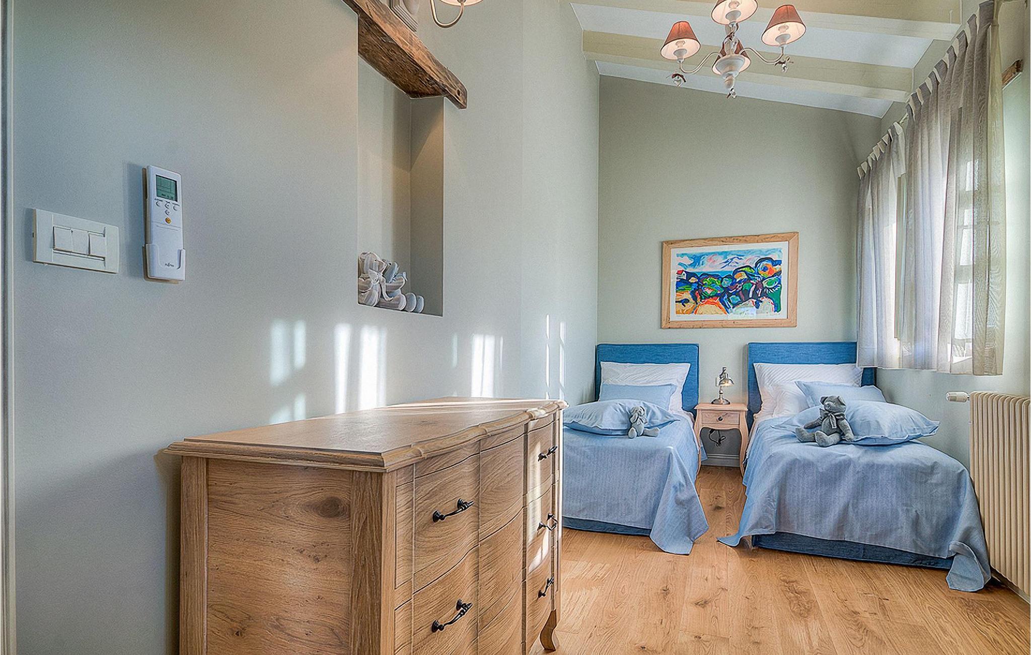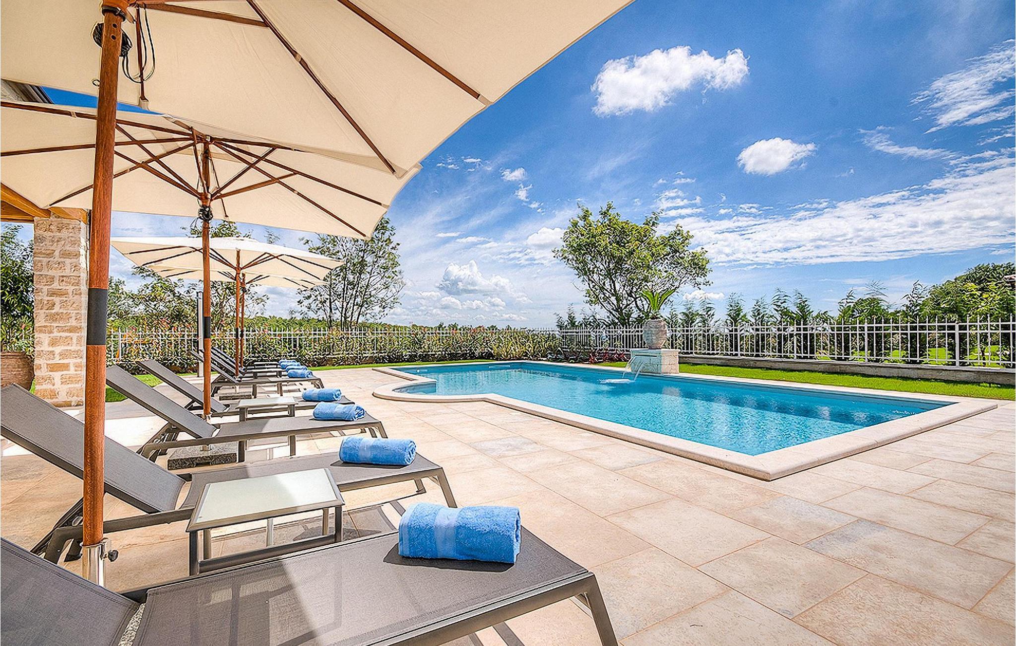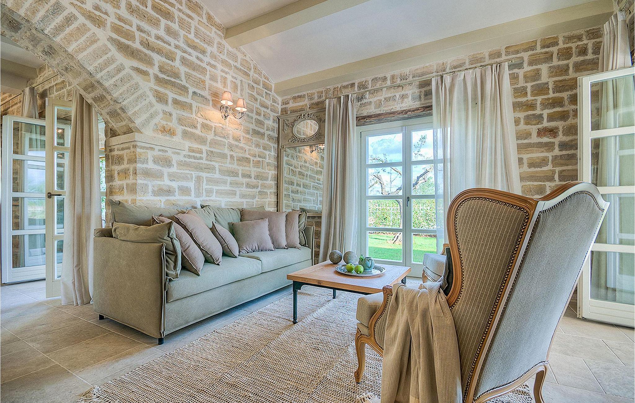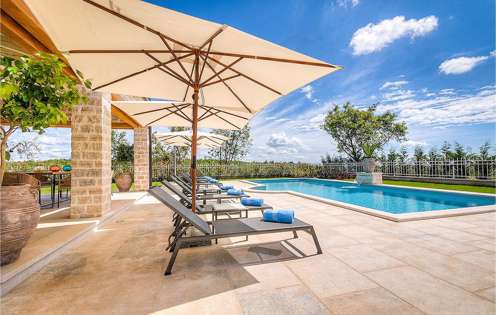 Denne smukke villa, sammen med Villa Nevia, Villa Elena og Villa Zoe, ligger i et luksusprojekt med 5600 m2 privat jord, der tilbyder gæsterne af disse 4 villaer en økologisk have med årstidens grøntsager, udendørs fitness, 2 tennisbaner, 2 petanquebaner, samt baner til håndbold, fodbold, basketball og volleyball. For en ægte istrisk fornemmelse er der også 3 boskariner, hvide grå langhornede istriske kvæg, et symbol på regionen. Elegant, sofistikeret og fremragende beliggende midt i det maleriske istriske landskab, men alligevel inden for rækkevidde af solrige strande og livlige badebyer, tilbyder Villa Elli luksuriøs indkvartering, hvor du øjeblikkeligt kan slappe af og nyde hvert minut af din ferie. Stueetagen er udelukkende dedikeret til overdådig bolig, med et vidunderligt langt værelse opdelt af buegange i opholds- og spise-/madlavningsområder med franske døre, der bringer overfloden af varmt istrisk lys indenfor. Fritlagt murværk, bjælkelofter og en smuk åben pejs skaber en varm og behagelig atmosfære, mens en blanding af moderne og vintage møbler og udsøgt indretning giver dig komfort af høj kvalitet. Tre soveværelser er fordelt over den øverste etage, mens det fjerde åbner direkte til det indbydende private poolområde, som udgør et fantastisk sted at slappe af, herunder en dejlig overdækket, autentisk grill med spisebord, der gør et vidunderligt tilflugtssted fra solen eller det perfekte sted at nyde dine udendørs måltider. Du kommer aldrig til at mangle ting at gøre og steder at besøge, hvilket gør denne smukke villa til en god base for din ferie i Istrien. Villa Elli er beliggende i den centrale del af Istrien-halvøen, nær den lille by Kanfanar. Den gamle arkitektur i byen og de omkringliggende landsbyer er velbevaret, og vinmarker og oliven dominerer dette område med varmt middelhavsklima. Kanfanar og dets omkringliggende landskab er kendt, ikke kun for deres historiske og kulturelle arv, men for ægte istrisk køkken. Istrien er et unikt og fortryllet sted, der har budt velkommen til besøgende og bosættere fra alle dele af verden, så længe vi har nedtegnet historie. Byen Pula med dets romerske amfiteater og Brijuni nationalpark med en 18-hullers golfbane ligger kun 30 minutters kørsel derfra. Det er et fantastisk sted at nyde maden, historien og trods alt at slappe af. En bil anbefales.