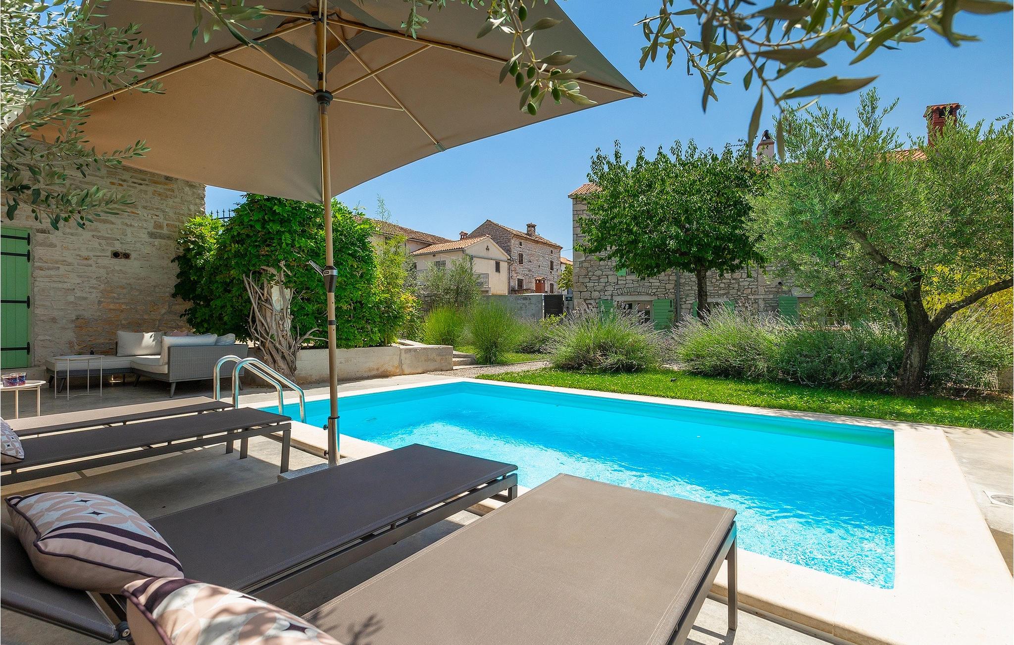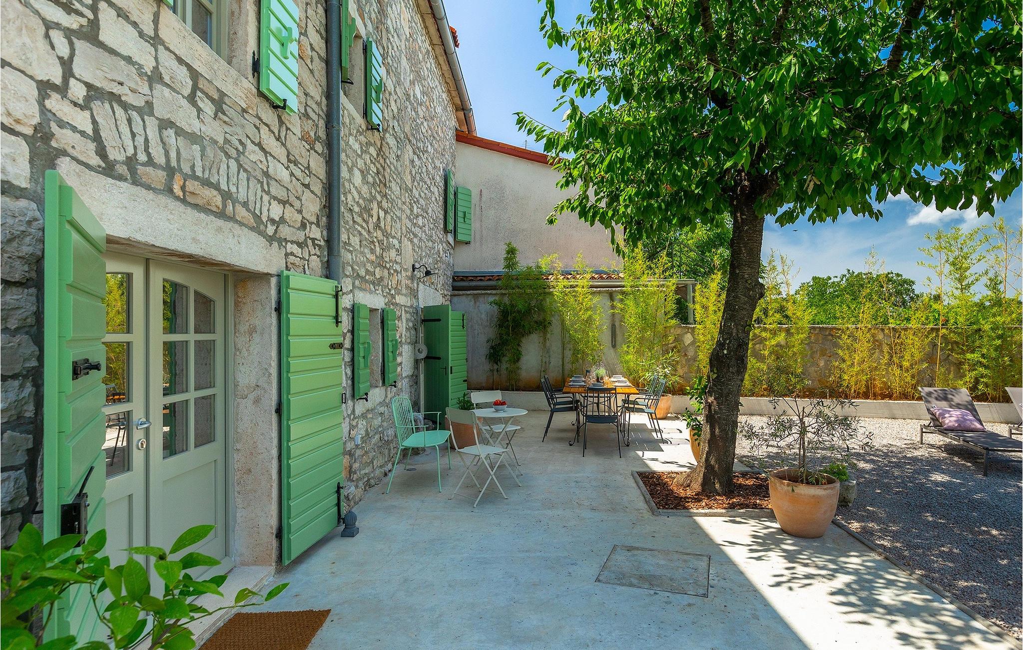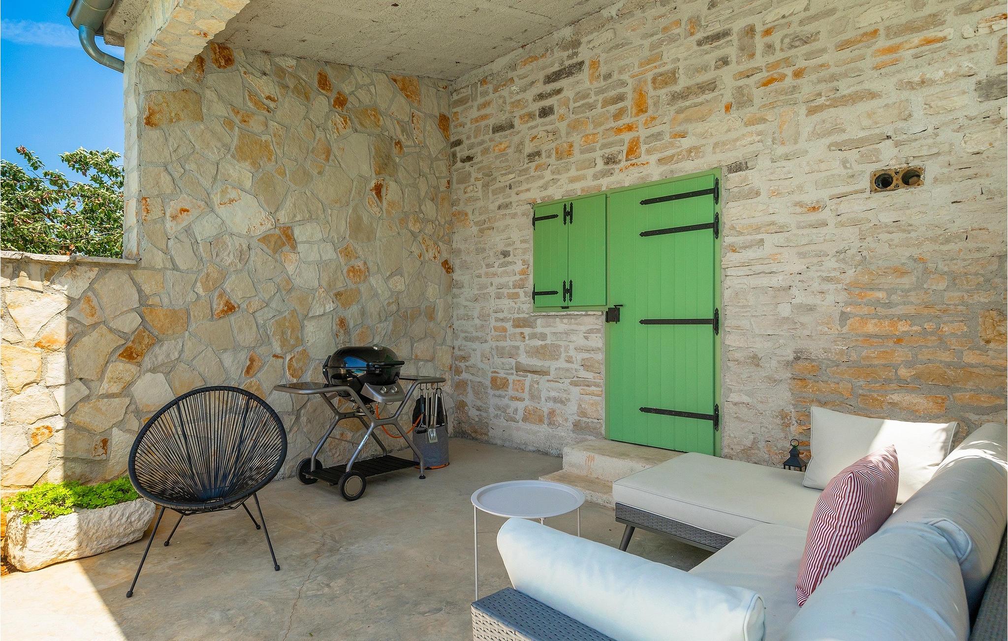 Udendørs er ikke mindre imponerende - en privat pool, et par hyggelige opholdsområder i hele haven samt en spiseplads, så du kan nyde dine måltider al fresco er til din disposition.Villaen er beliggende nær den lille by Kanfanar, men heller ikke langt væk fra kystbyen Rovinj. Den gamle arkitektur i byen og de omkringliggende landsbyer er velbevaret, og vinmarker og oliven dominerer dette område med varmt middelhavsklima. Kanfanar og dets omkringliggende landskab er velkendt, ikke kun for sin historiske og kulturelle arv, men for fremragende og ægte istrisk køkken. Rovinj, den nærmeste større by, vil fortrylle dig ved sine middelaldergader og varme middelhavsomgivelser. Hovedkirken St. Euphemia holder relikvier af helgenen og præsenterer en af de smukkeste barokpræstationer i Istrien. Fra kirkeplateauet er der en vidunderlig udsigt over det åbne hav og talrige holme i det fjerne.
