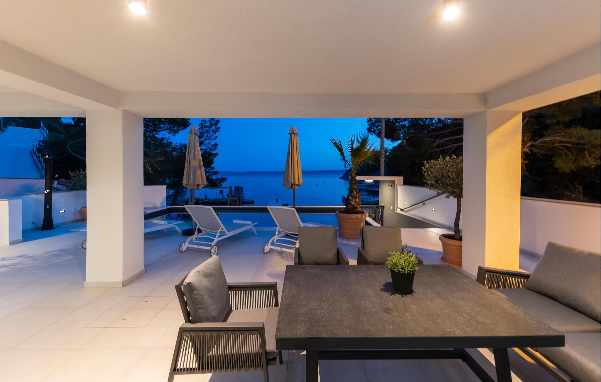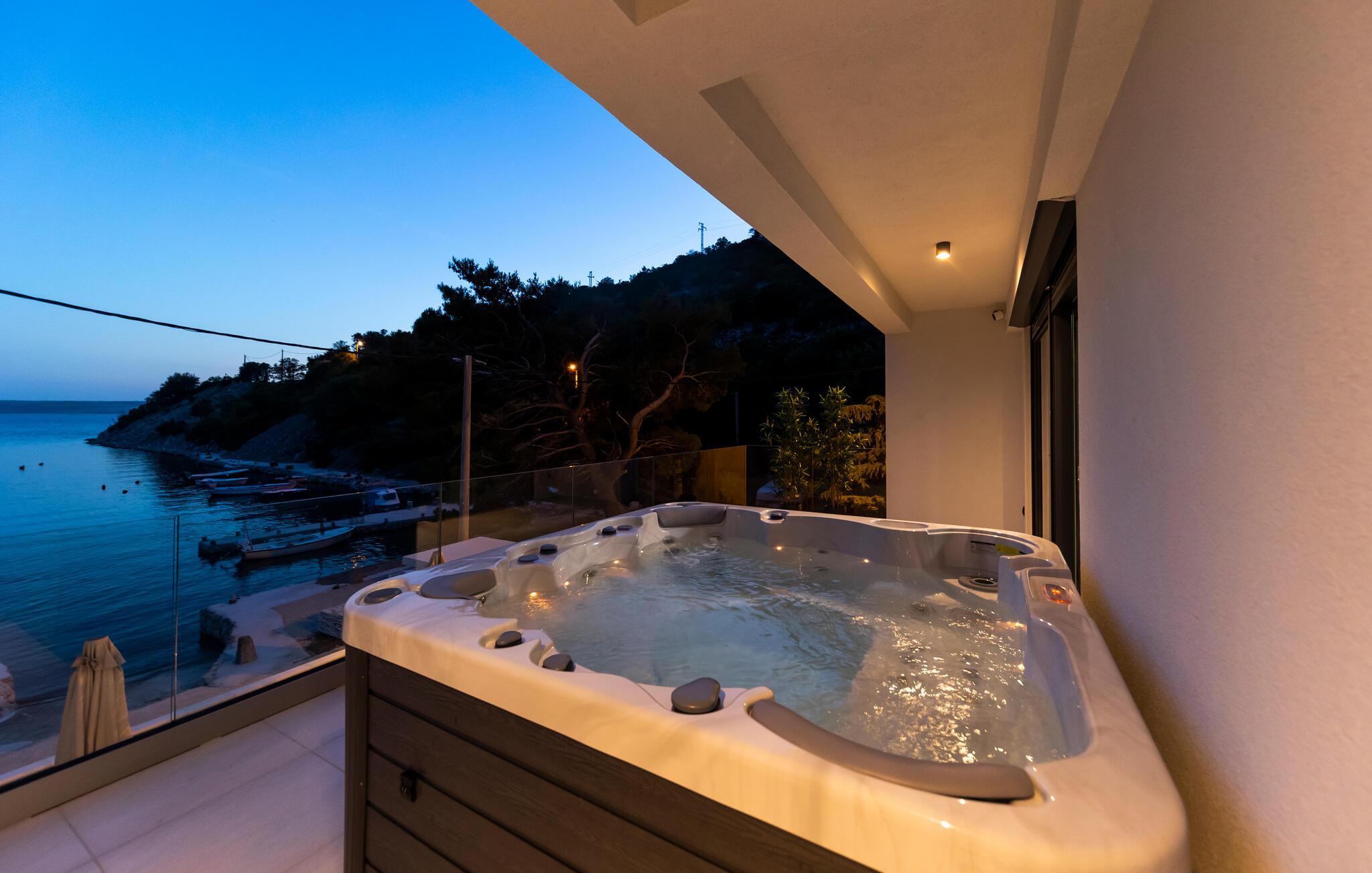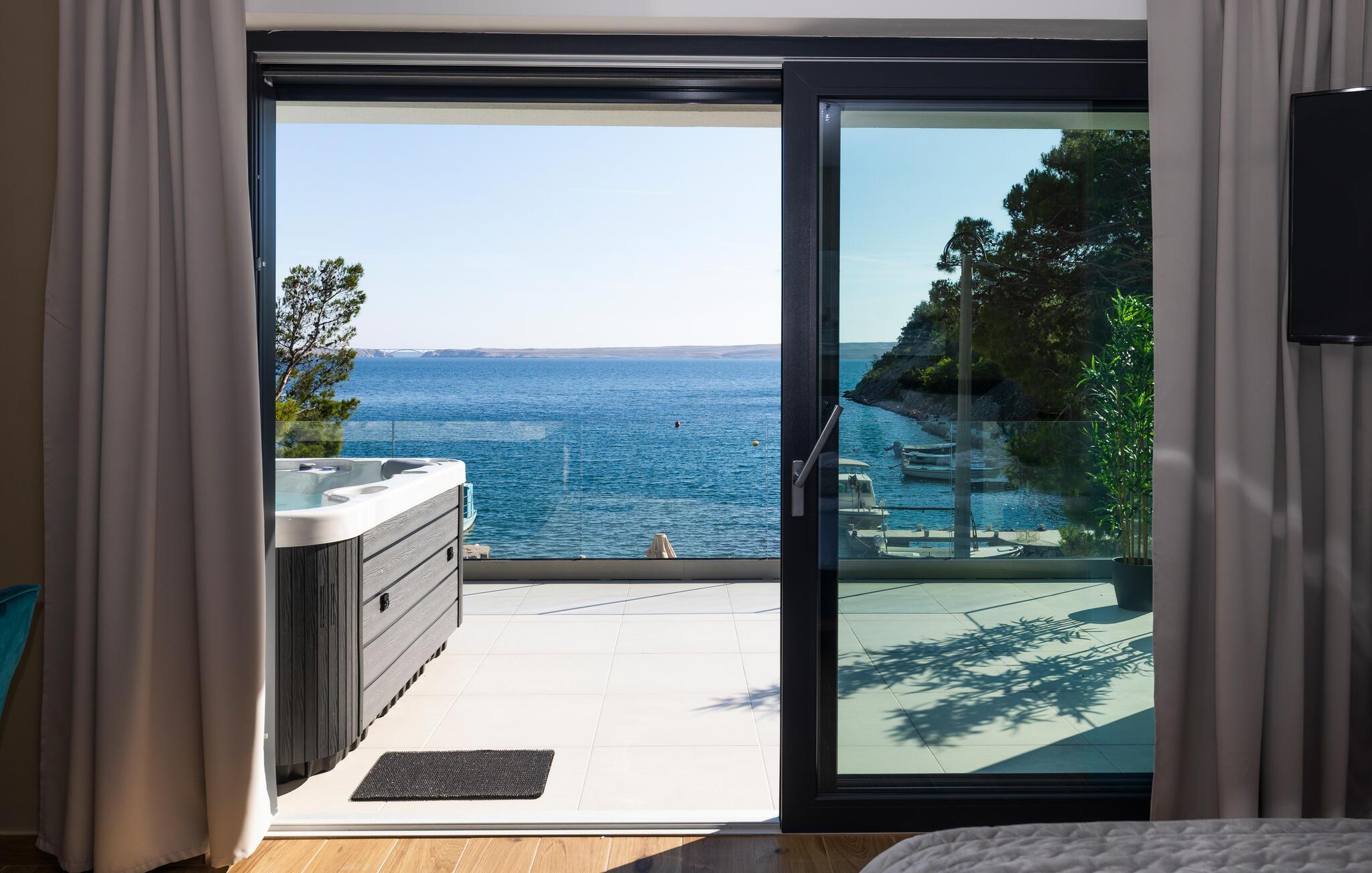 Udenfor inviterer terrasserne til at nyde solen uforstyrret. Slap af på en loungestol og nyd friske dukkerter i poolen eller sæt jer til rette i spabadet med havudsigt.