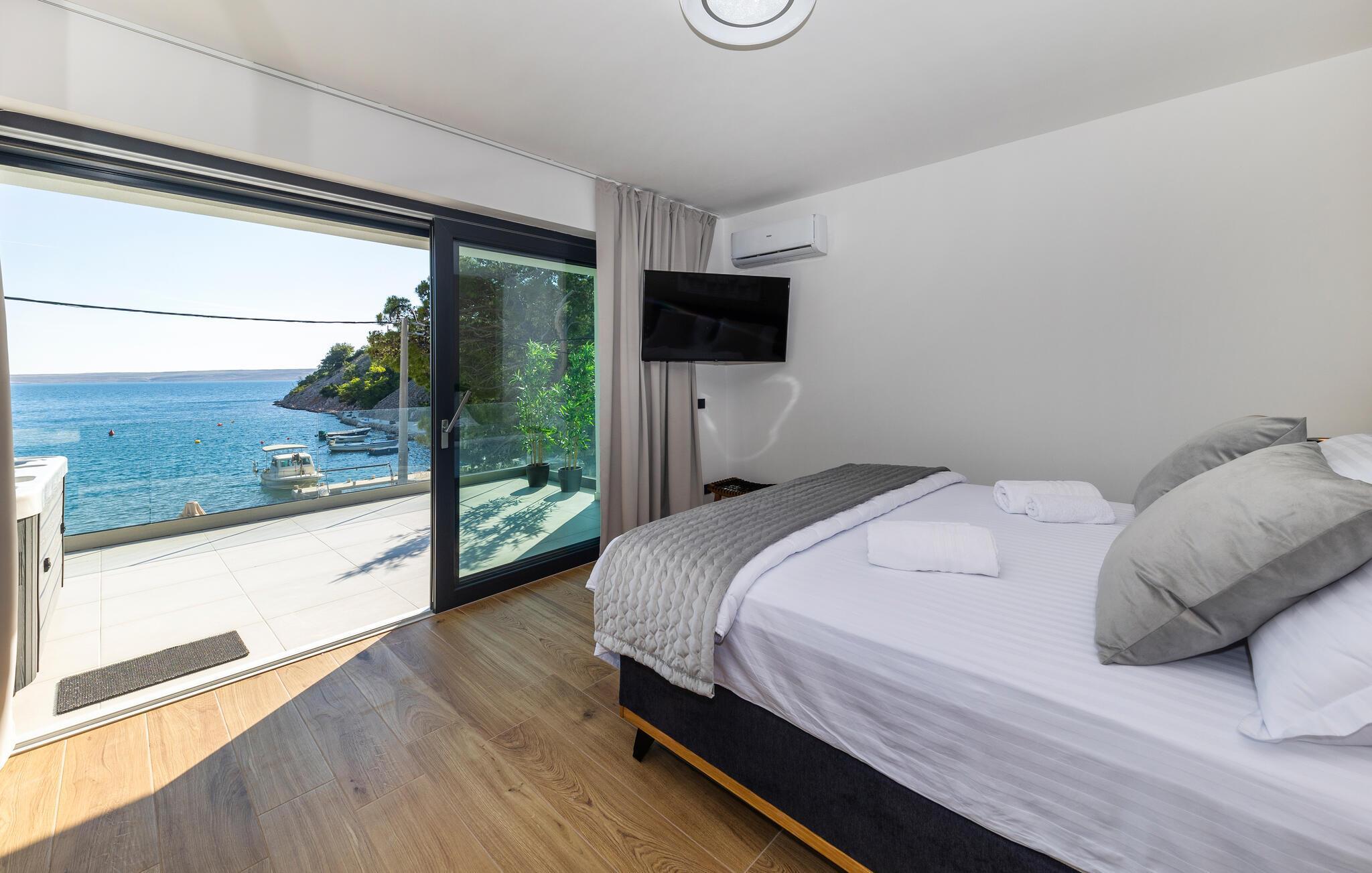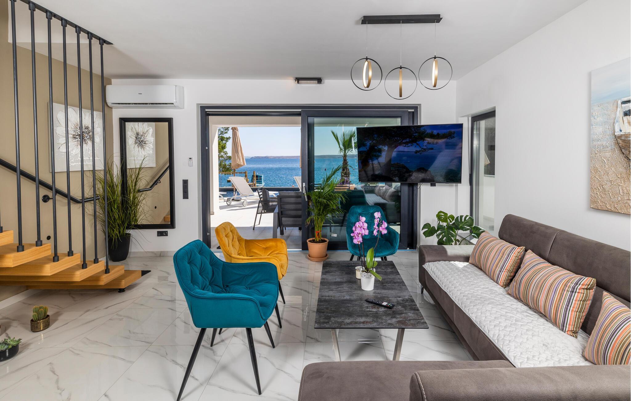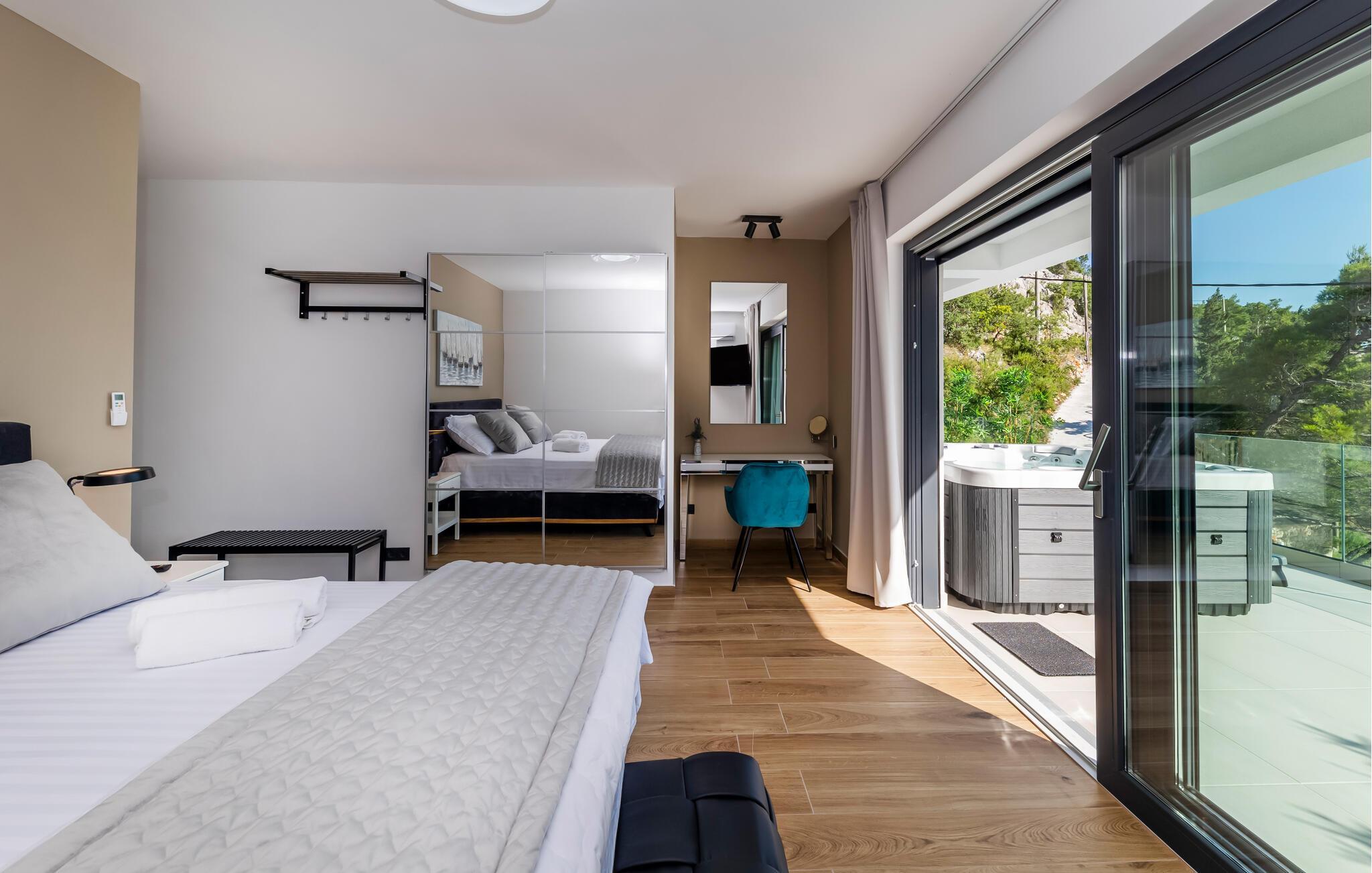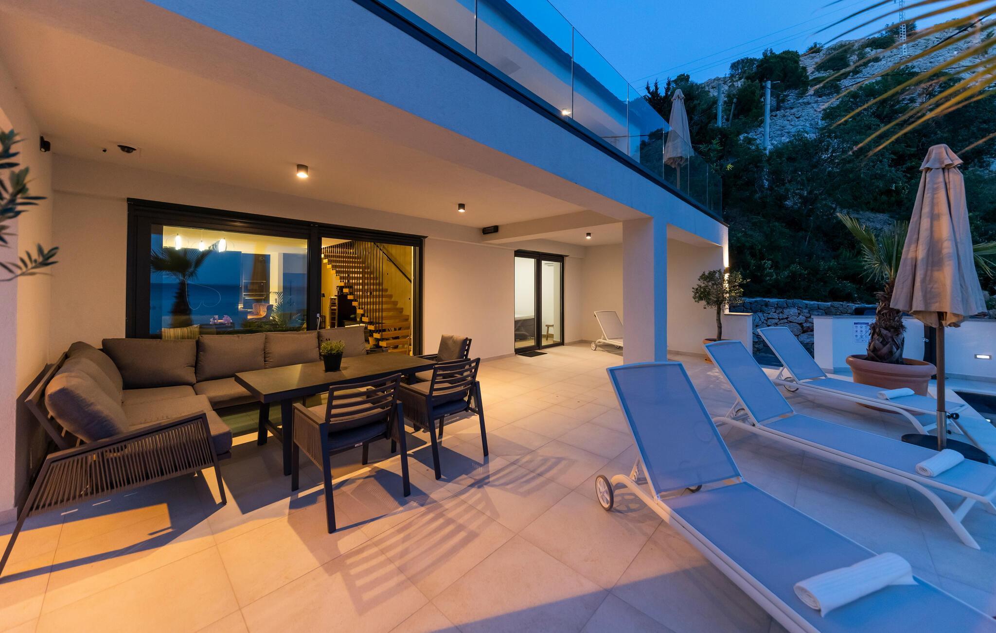 Udenfor inviterer terrasserne til at nyde solen uforstyrret. Slap af på en loungestol og nyd friske dukkerter i poolen eller sæt jer til rette i spabadet med havudsigt.