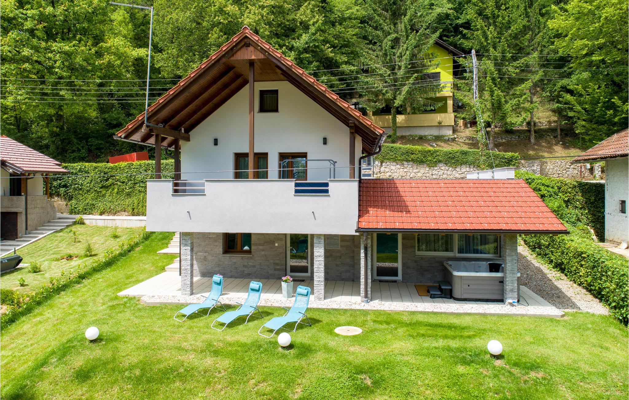 Nyd den vidunderlige panoramaudsigt til landskabet fra dette feriehus med et udendørs spabad ved Kupa-floden.