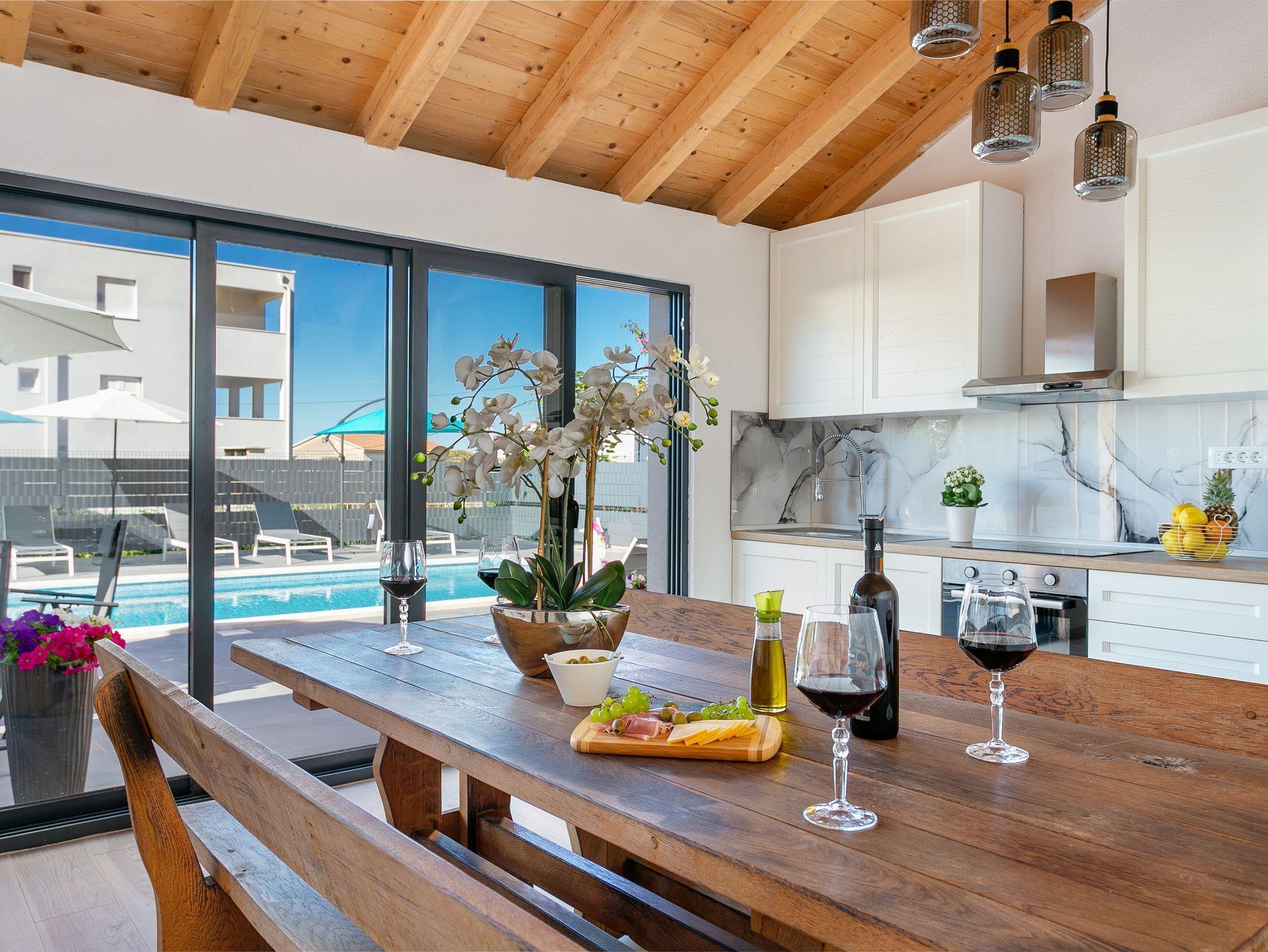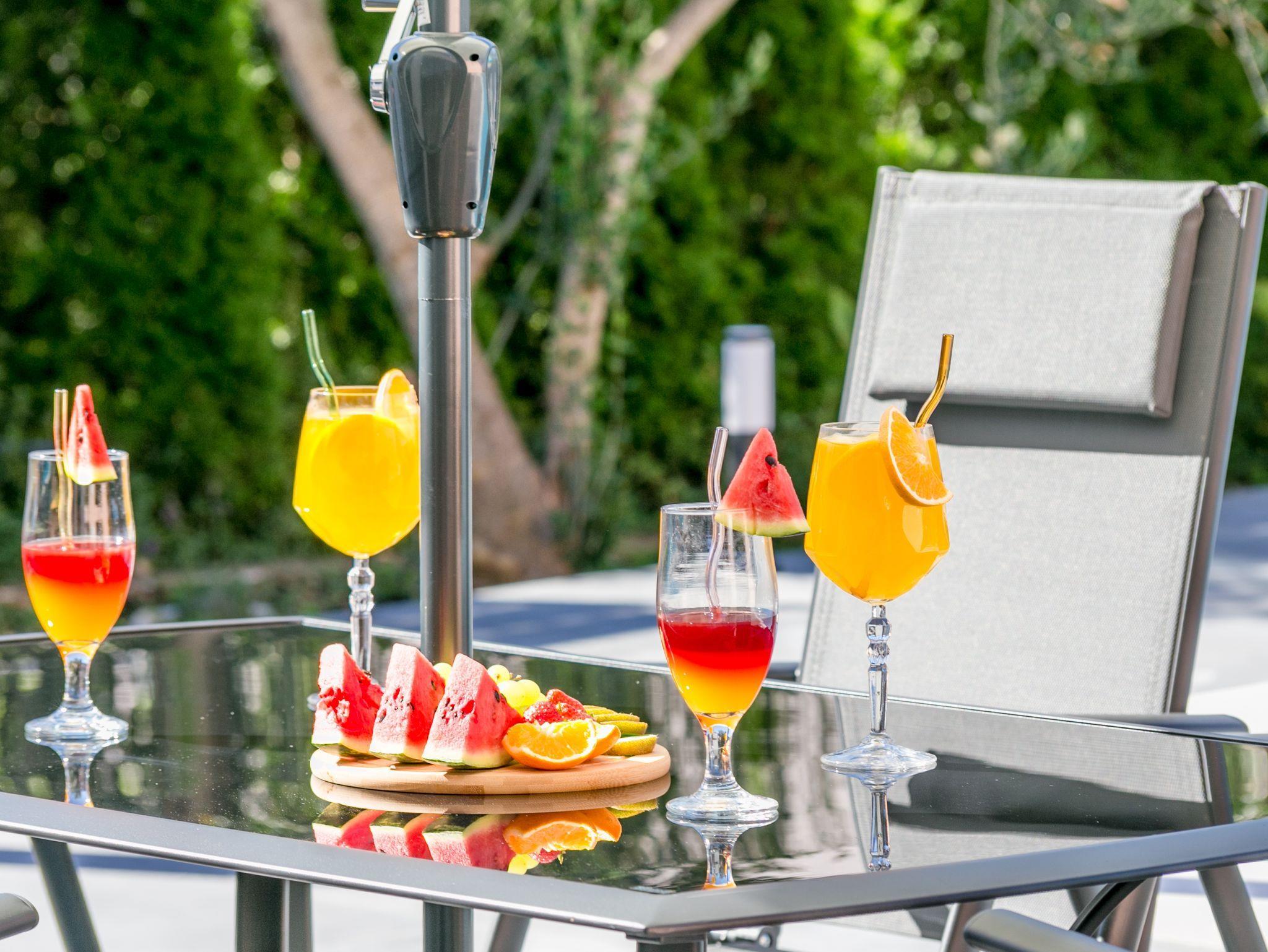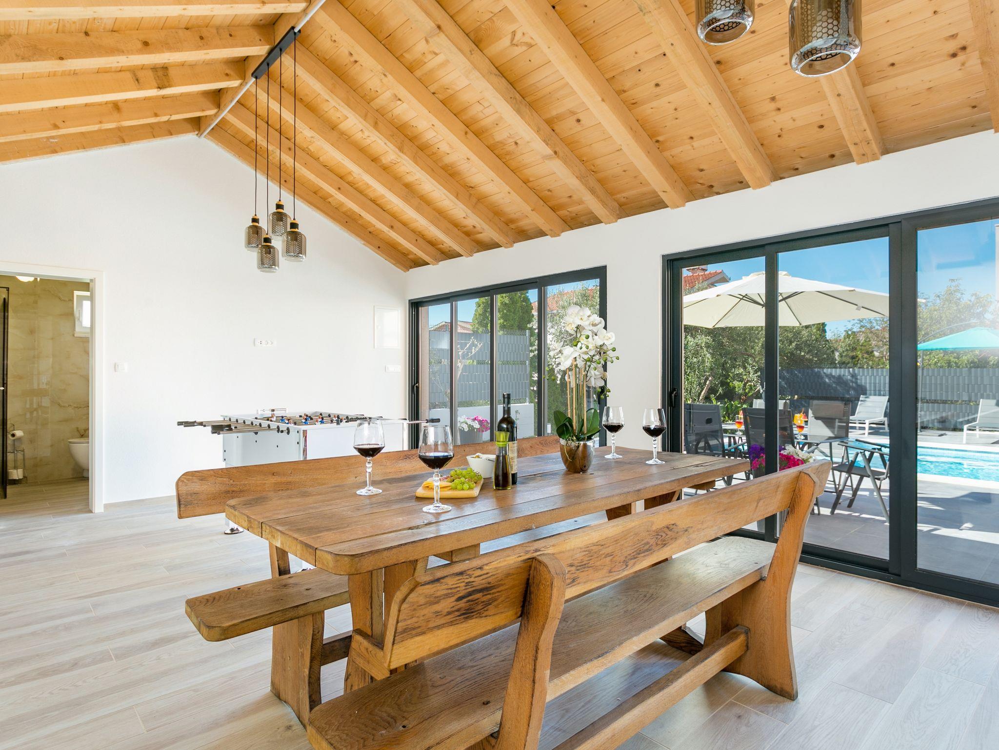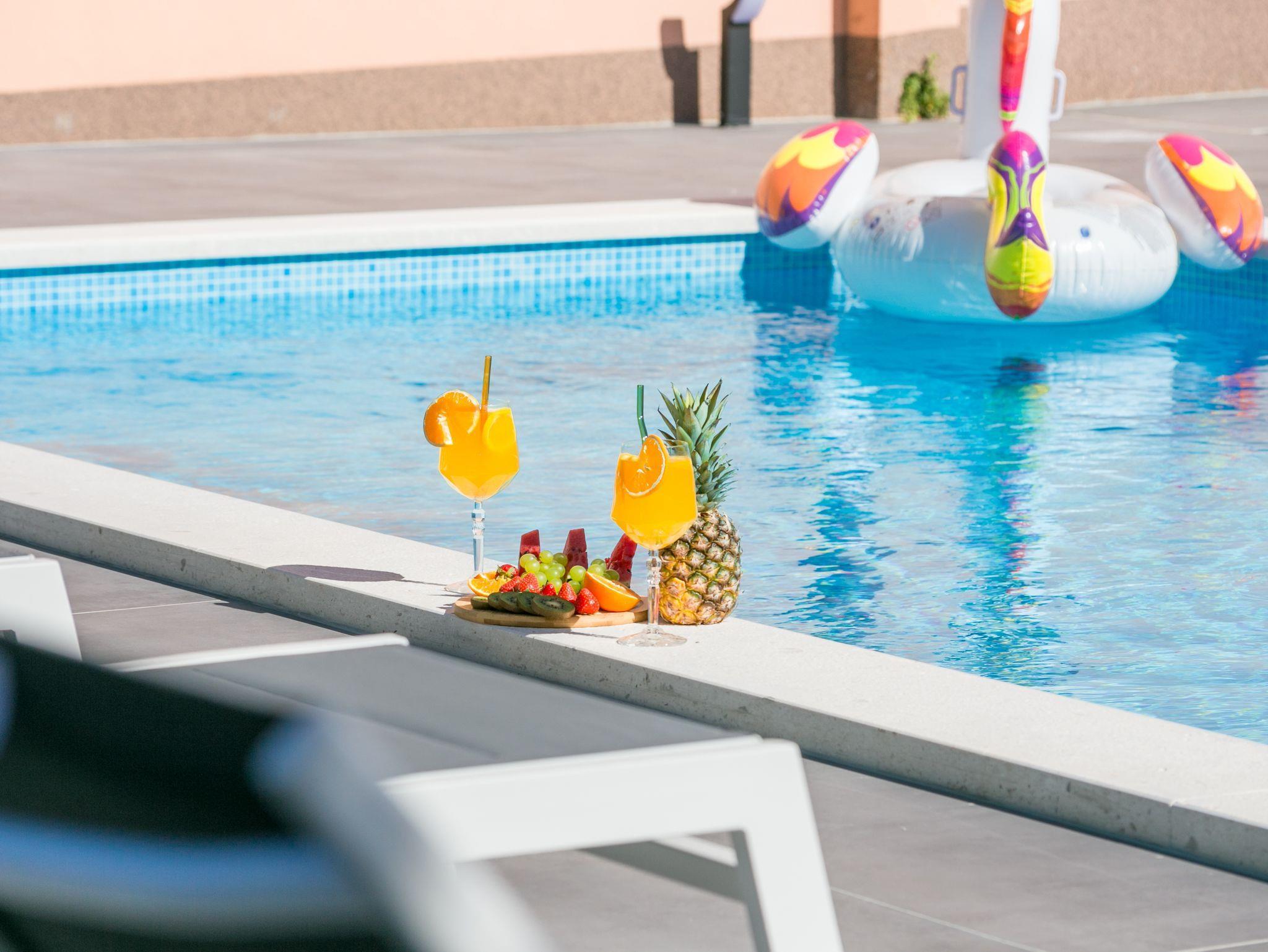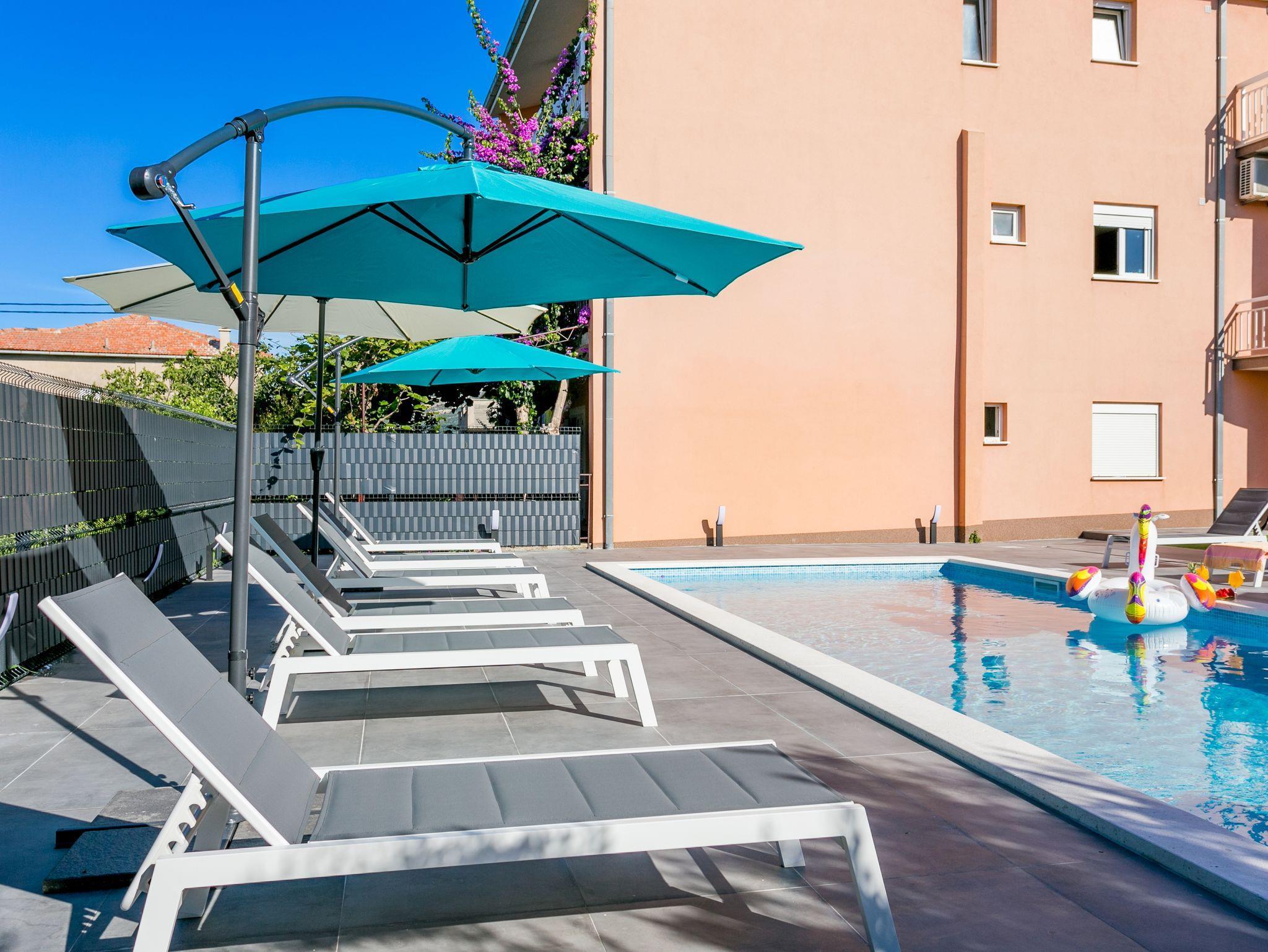 Hof (120m2, Kinderbereich, Sitzbereich), Parkplatz (Anzahl der Parkplätze: 4, Entfernung vom Objekt: im Hof), Pool: gemeinsam, Dimensionen: 13m x 4.5m x 1.6m, Wassertyp: Süßwasser, Heizung: Ja, Grill: gemeinsam, WiFi Internet, Föhn, Bügeleisen, Bügelbrett, Kinderbett
