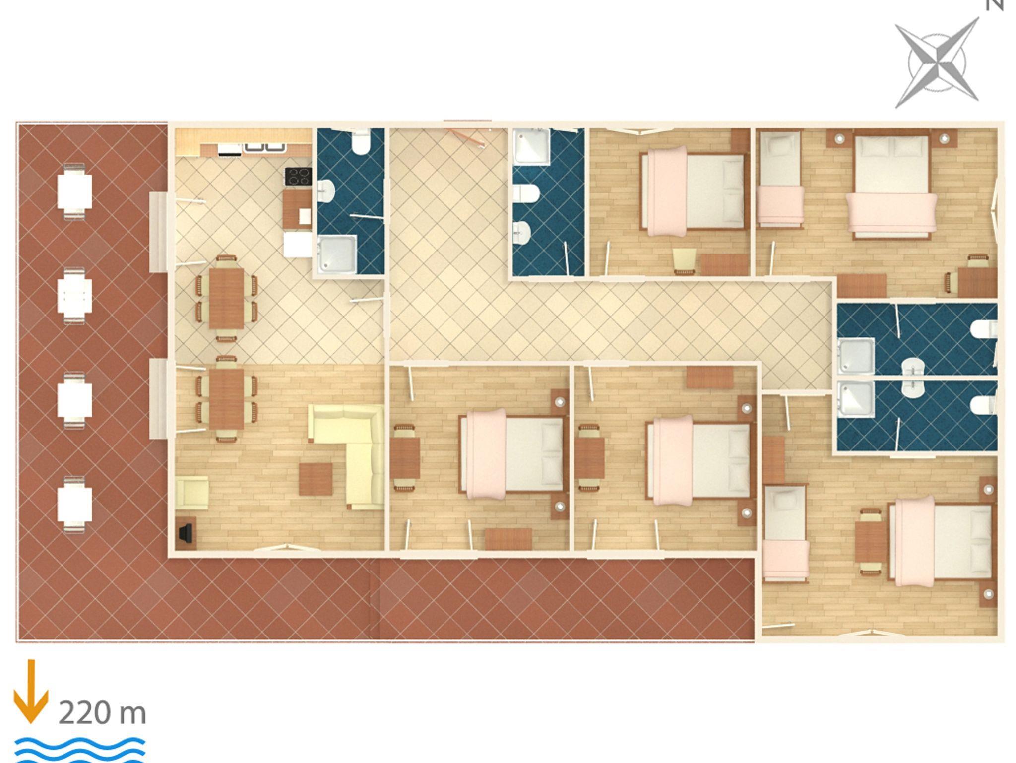 Ferienwohnung bietet Platz für 12 Gäste. Die Betten sind in Schlafzimmern, die es 5 gibt, innerhalb einer Gesamtfläche von 124m2, angeordnet. Die Gäste haben eine eigene Terrasse zur Verfügung, auf der sie in warmen Sommernächten genießen können. Es ist erlaubt, Speisen auf dem Gemeinschafts-Grill vorzubereiten. IM PREIS INBEGRIFFEN: Kurtaxe, Endreinigung, Klimatisierung, Parkplatz, Internet, Kinderbett, Bügeleisen, Bügelbrett, Föhn. VERBINDLICHE ZUSÄTZLICHE KOSTEN: Aufzahlung für Kurzaufenthalte (prozentualer Zuschlag pro Nächtigungsanzahl: 30% - 1, 20% - 2, 10% - 3). UNVERBINDLICHE ZUSÄTZLICHE KOSTEN: Wäschewaschen (8,00 € Waschen). Die Verfügbarkeit zusätzlicher Dienstleistungen in Ihrem reservierten Termin und die Preise derselben (falls nicht aufgeführt) müssen im Voraus überprüft werden. Zusätzliche Dienstleistungen die in der Zahlungsaufforderung nicht aufgeführt sind werden direkt beim Vermieter bezahlt, angenommen der Gast nutzt auch diese. Ermäßigung auf den Grundpreis: Gratistag 14=13 (bei einem Aufenthalt von 14 Tagen oder mehr erhalten Sie einen Gratistag für den Aufenthalt bis 31.12.26).
