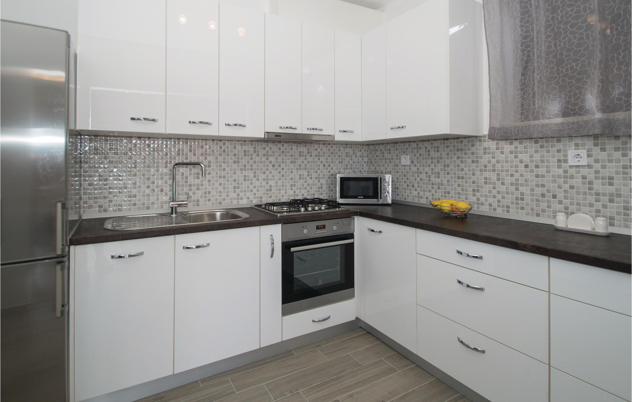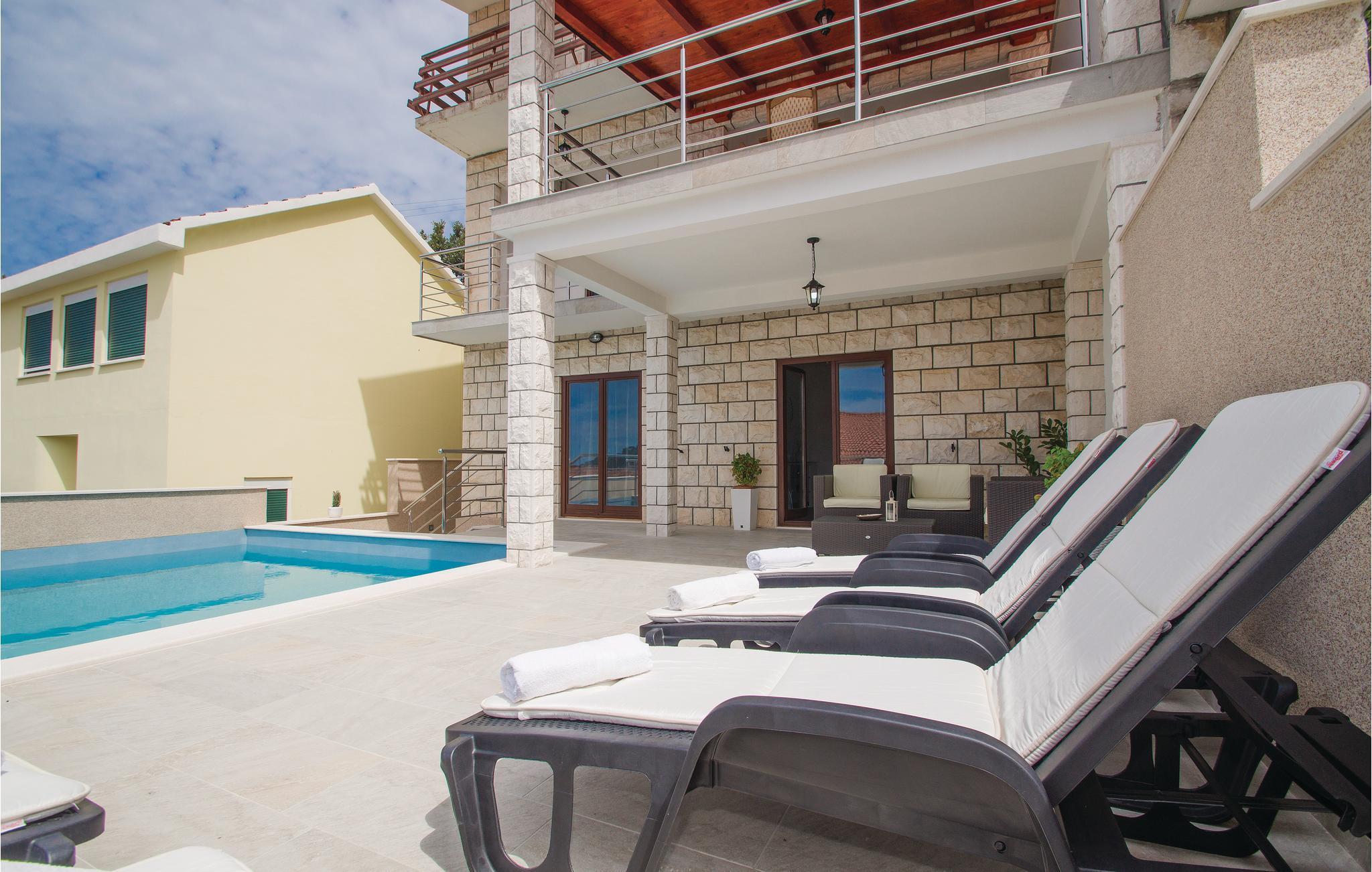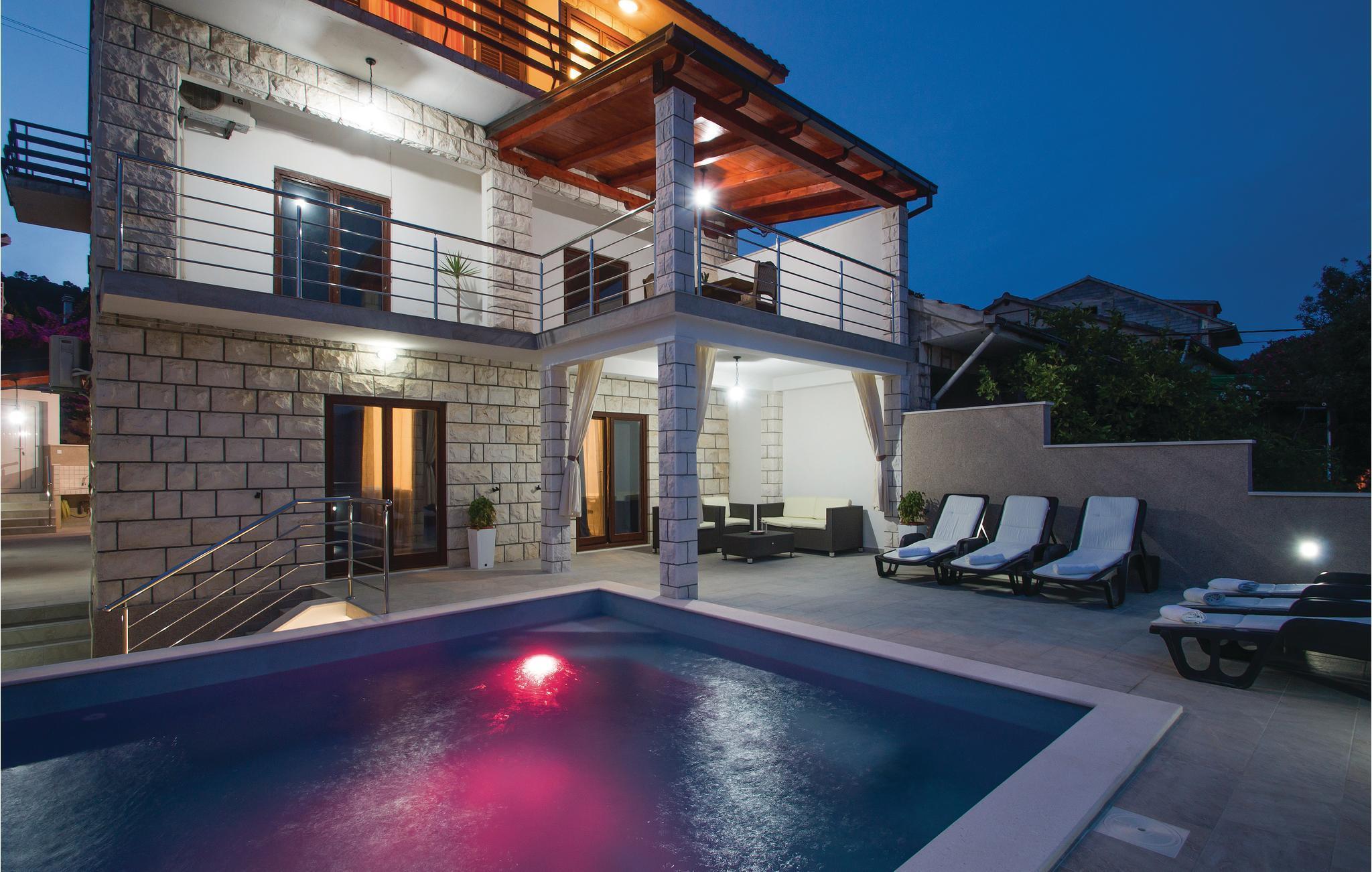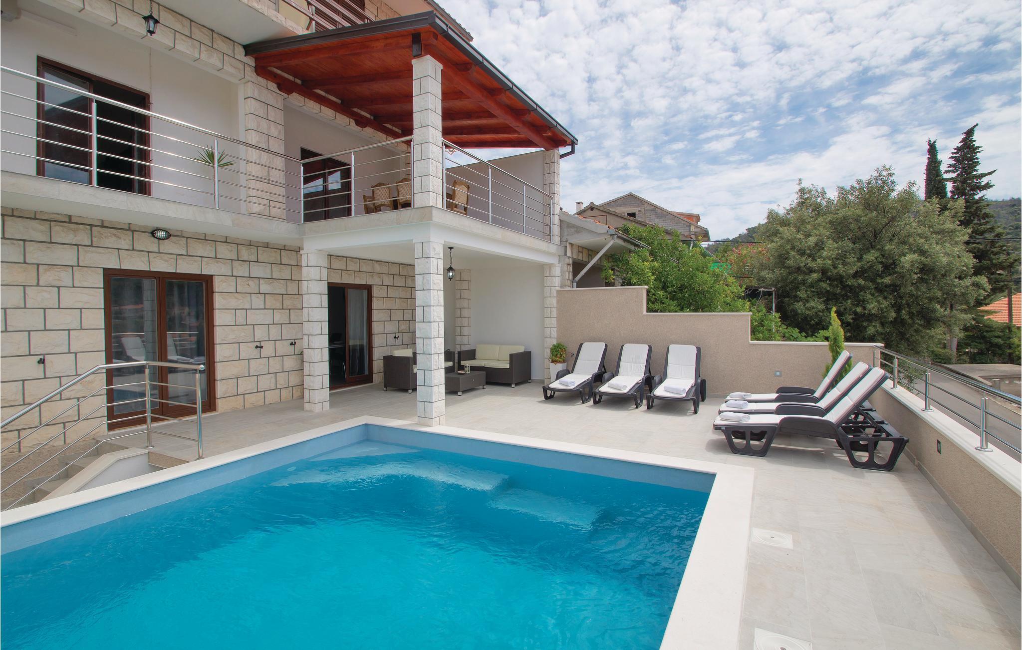 Dette lyse og komfortabelt indrettede feriehus ligger i nærheden af ??en lille sandstrand og består af tre lejligheder. Første sal er ikke udlejet. Stuerne er fordelt i stueetagen, hvor der er en lejlighed med to soveværelser og direkte adgang til poolterrassen samt to små lejligheder på anden sal, som er tilgængelig via udvendige trapper. Ferieboligen er ideel til flere familier, der ønsker at tilbringe deres ferie sammen. Fra balkonerne kan I nyde en bred udsigt over havet og bugten.