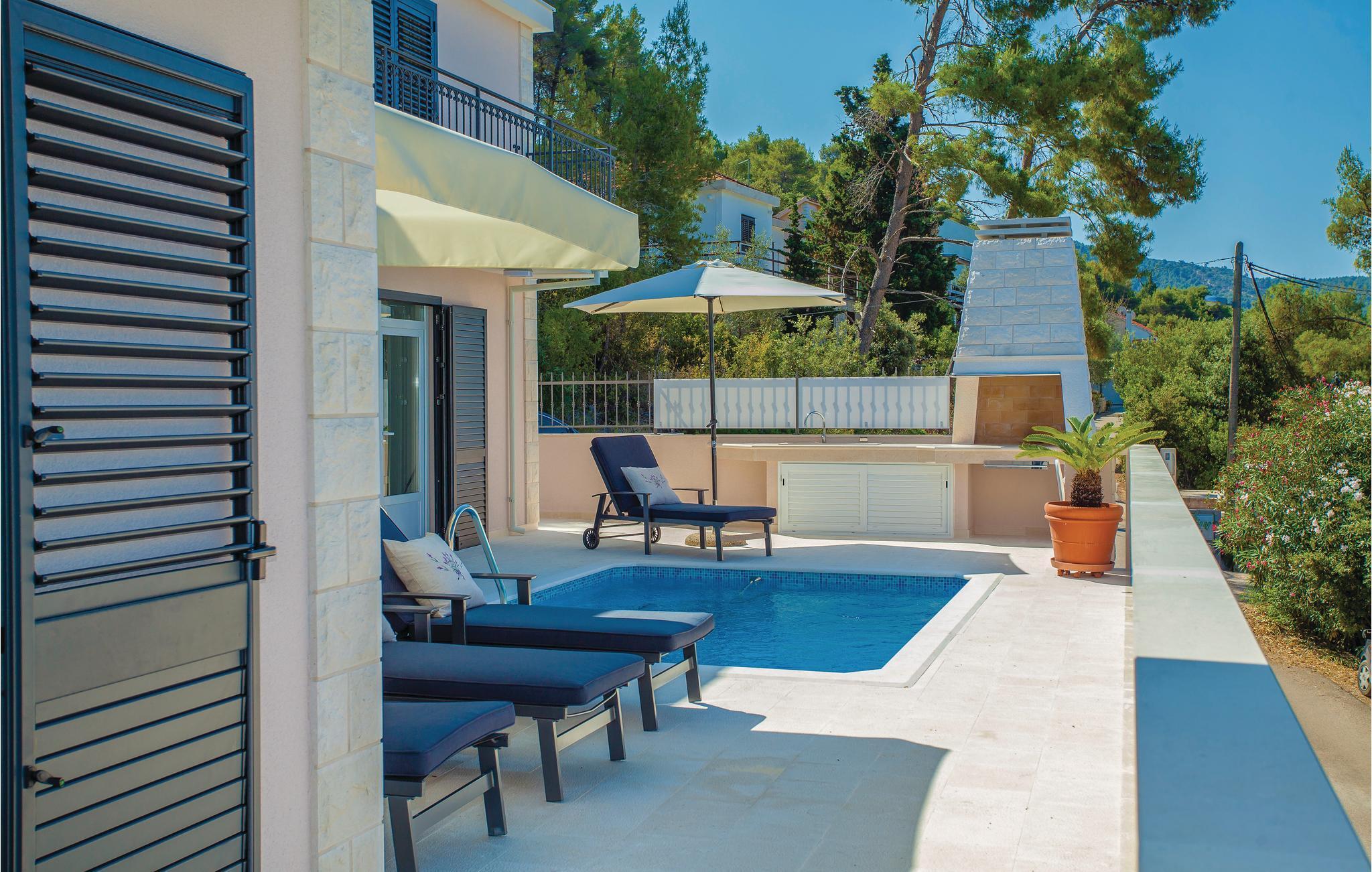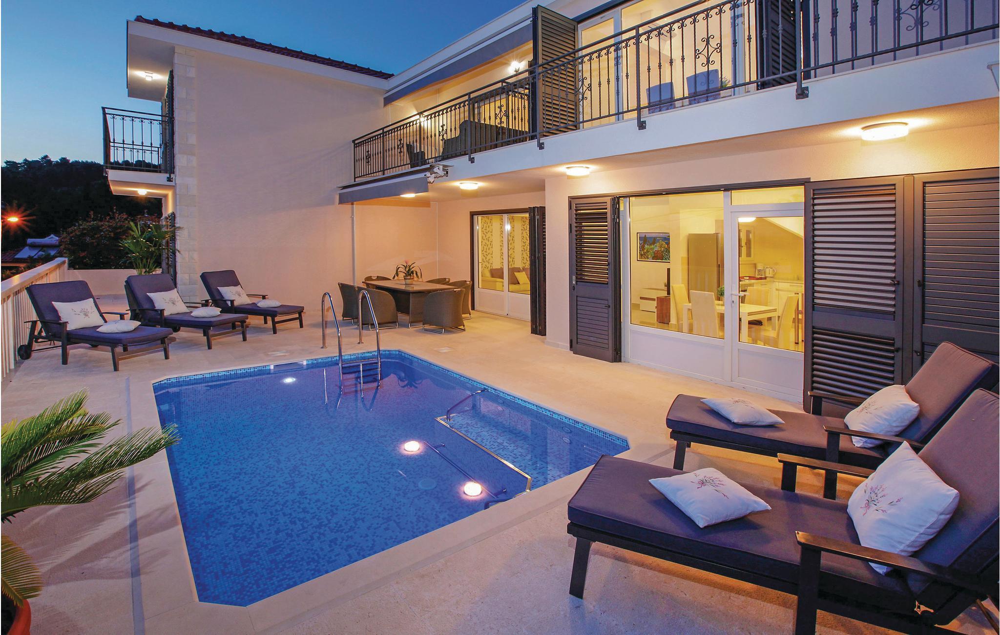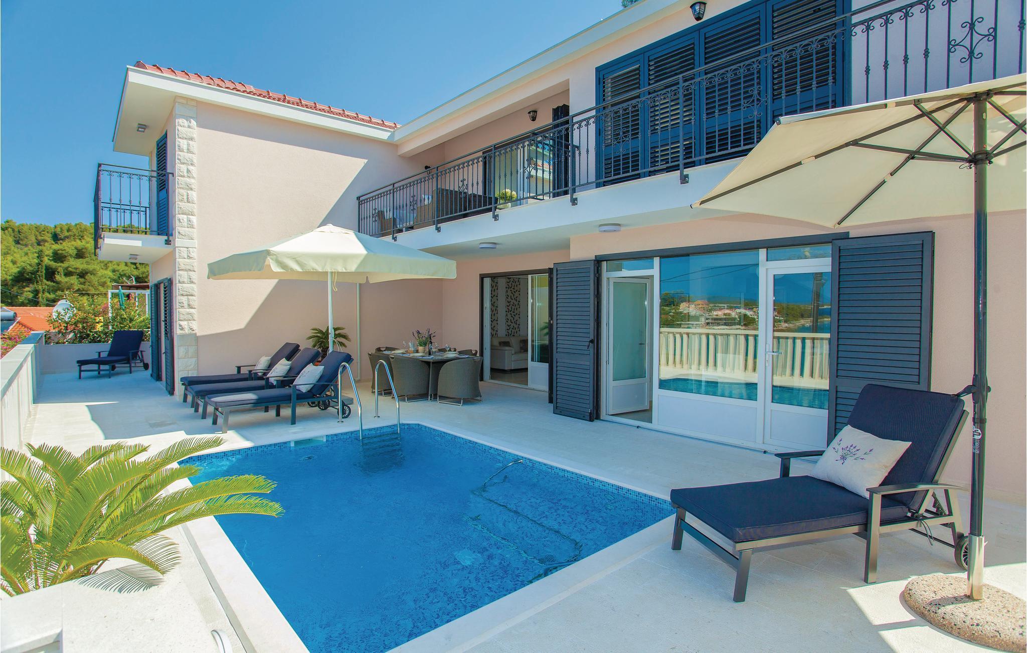 Dette rummelige, og moderne feriehus med pool ligger på en bakke over Gradina-bugten, og har dermed en smuk panoramaudsigt over hele lagunen. Huset har to lejligheder, som er forbundet med eksterne trapper, og er ideelt til to familier, der ønsker at tilbringe ferien sammen. Hver etage har en rummelig opholdsstue med pejs, så I kan tilbringe ferien, også på de køligere årstider. Nyd poolen på terrassen, hvorfra I kan betragte en smuk udsigt over havet. Der er også en grill til at tilberede lækre måltider. Den nærmeste strand er cirka 30 meter fra huset. Placeringen er ideel til fiskerientusiaster. Efter aftale med ejeren kan der arrangeres udflugter til øerne Vis, Lastovo og Hvar.