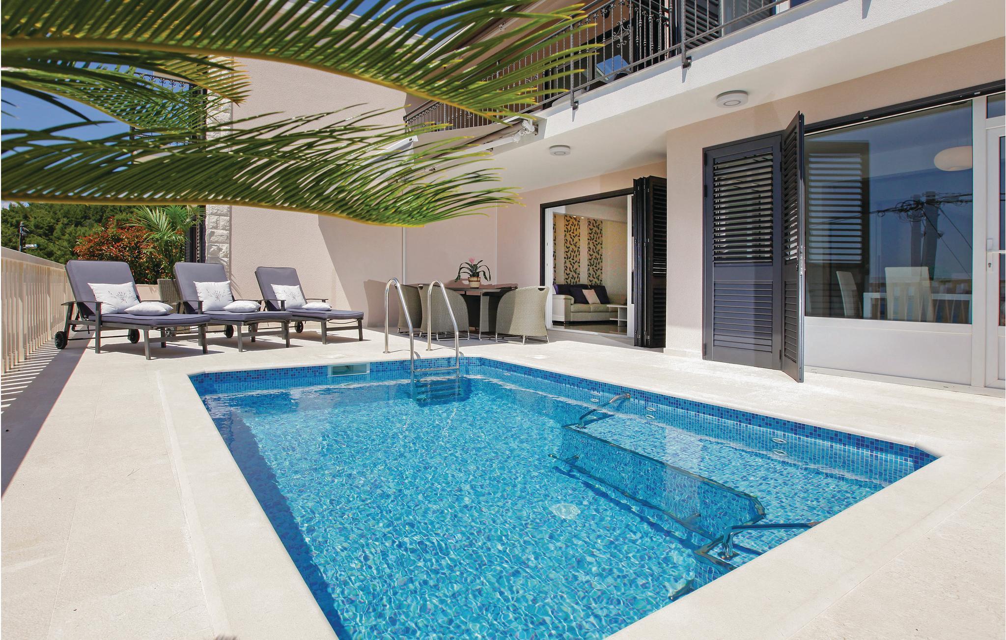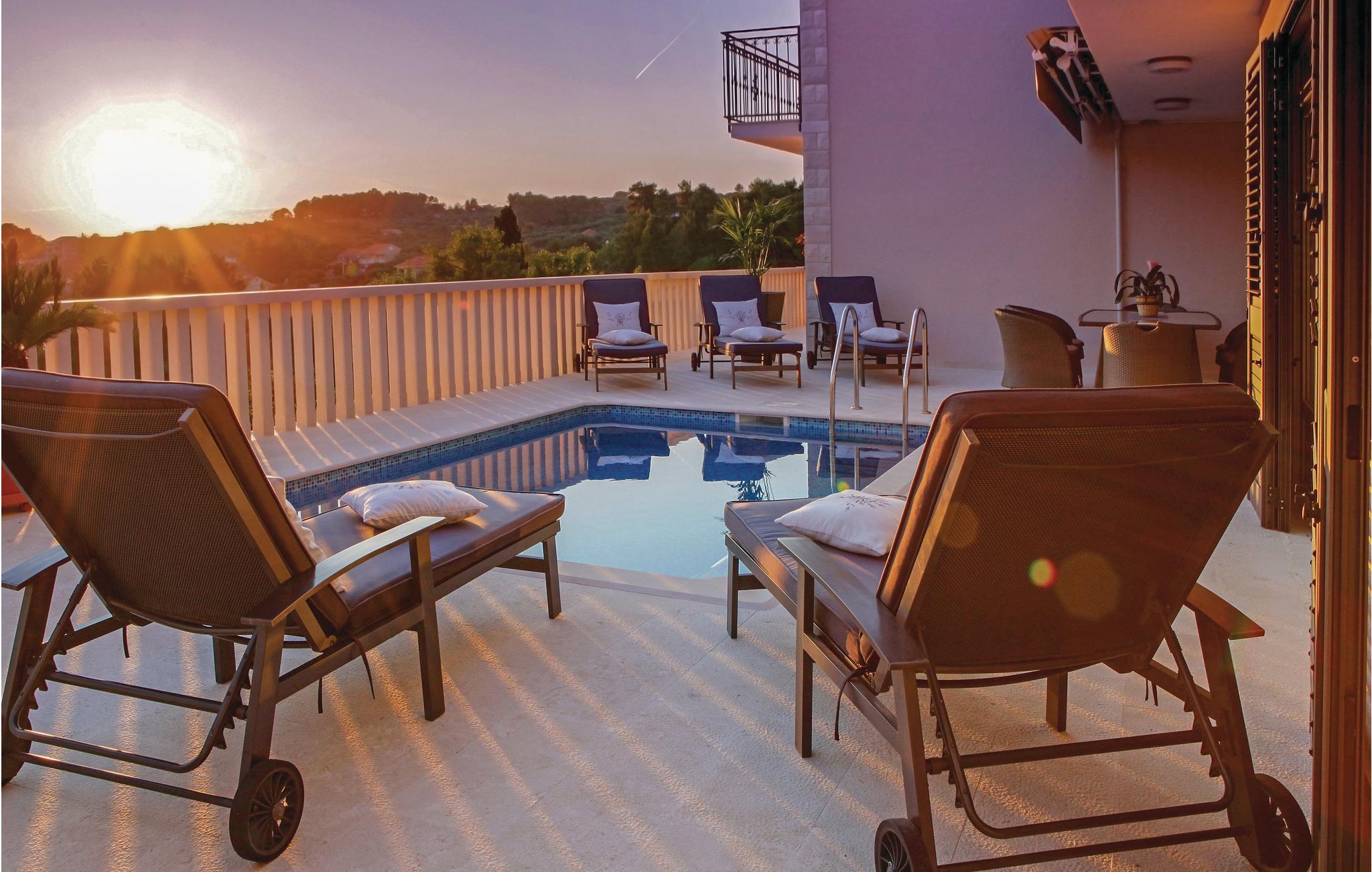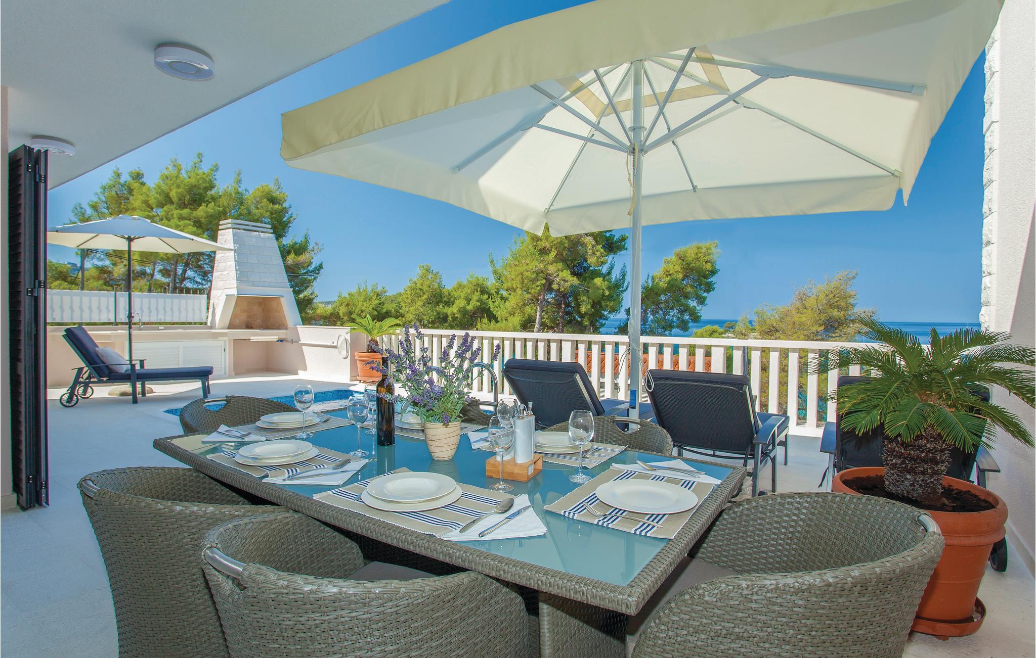 Dette rummelige, og moderne feriehus med pool ligger på en bakke over Gradina-bugten, og har dermed en smuk panoramaudsigt over hele lagunen. Huset har to lejligheder, som er forbundet med eksterne trapper, og er ideelt til to familier, der ønsker at tilbringe ferien sammen. Hver etage har en rummelig opholdsstue med pejs, så I kan tilbringe ferien, også på de køligere årstider. Nyd poolen på terrassen, hvorfra I kan betragte en smuk udsigt over havet. Der er også en grill til at tilberede lækre måltider. Den nærmeste strand er cirka 30 meter fra huset. Placeringen er ideel til fiskerientusiaster. Efter aftale med ejeren kan der arrangeres udflugter til øerne Vis, Lastovo og Hvar.