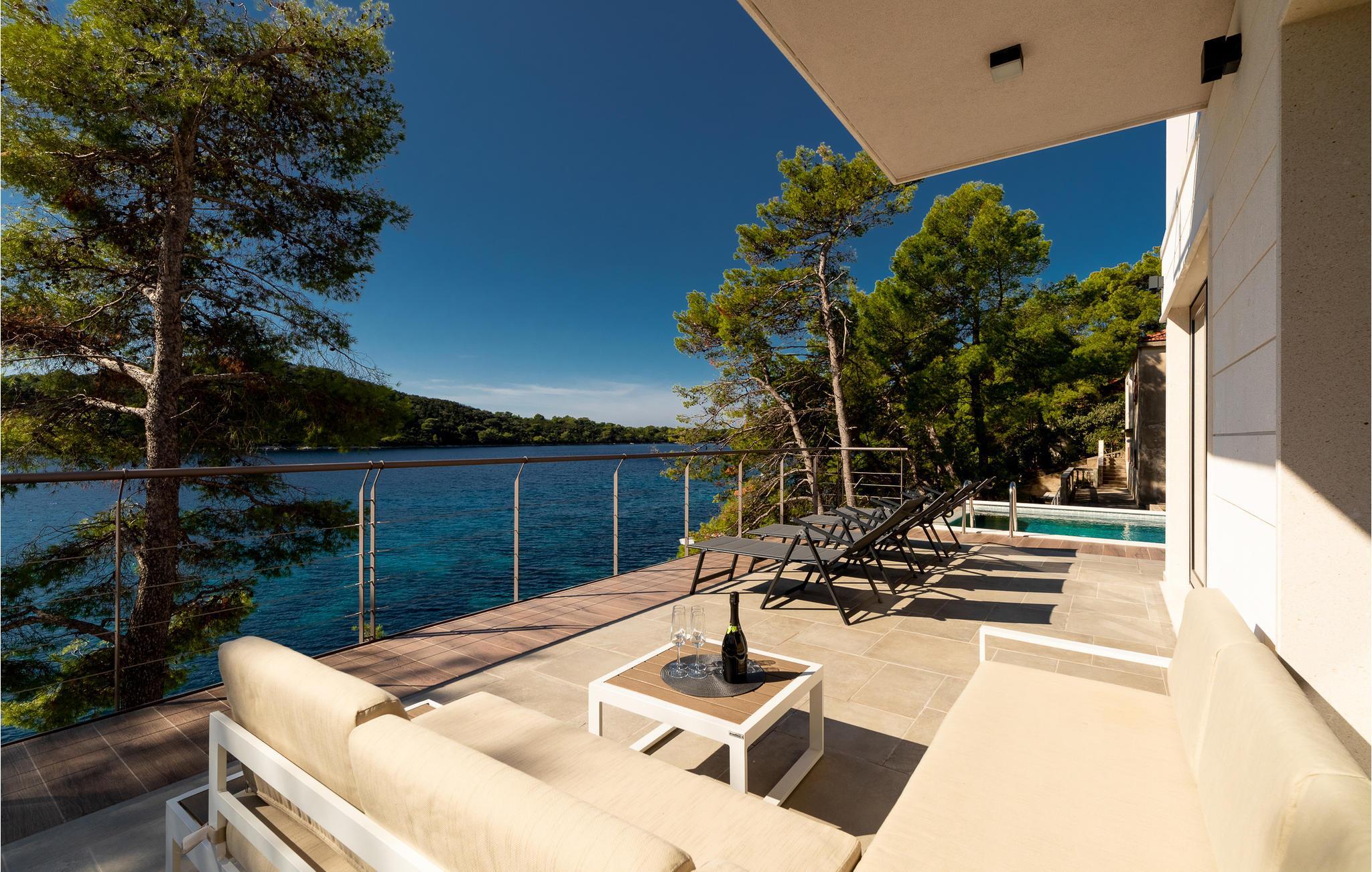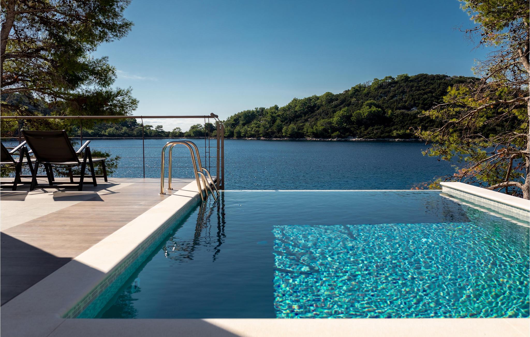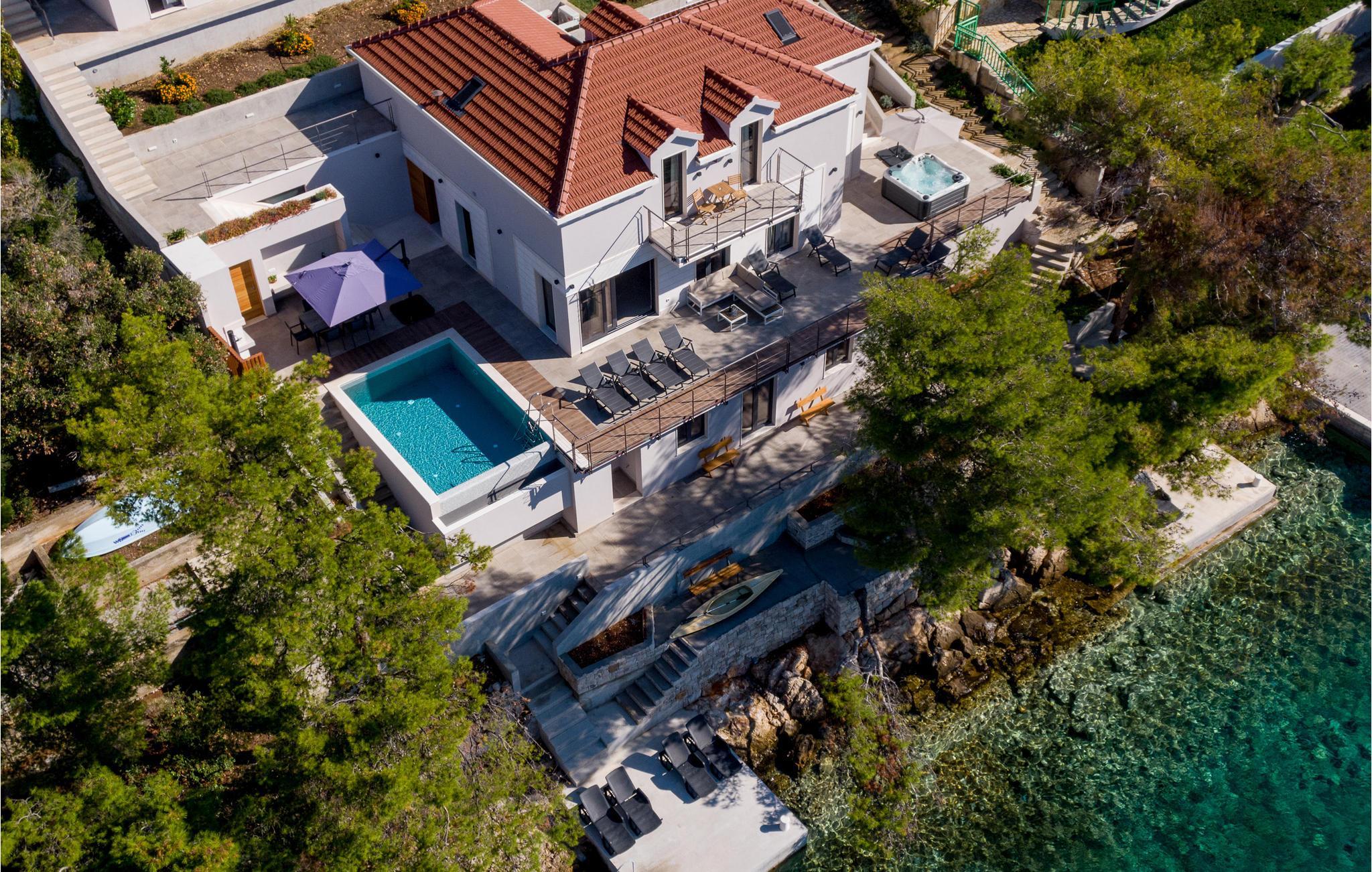 Eksklusivt sommerhus med pool og udendørs jacuzzi lige ved havet.