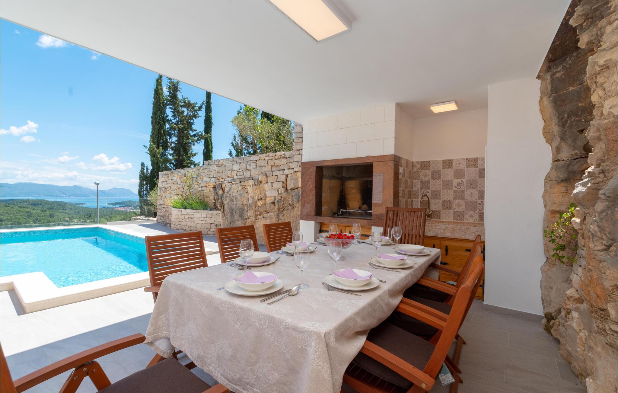 I udkanten af den autentiske lille by Žrnovo og på vej til den maleriske bugt Žrnovska Banja ligger dette familievenlige feriehus. Ved siden af terrassen med pool, grill og spiseafdeling er der en lounge hvor I kan slappe af. På samme etage ligger den moderne stue med unik udsigt ud over Pelješackanalen, et lækkert køkken og fire soveværelser samt tre badeværelser I stueplan er der et fitnessrum, en sauna og en legplads. Her er meget ugenert og I har kun fem minutter i bil til de nærmeste strande, den magiske by Korcula og meget andet.