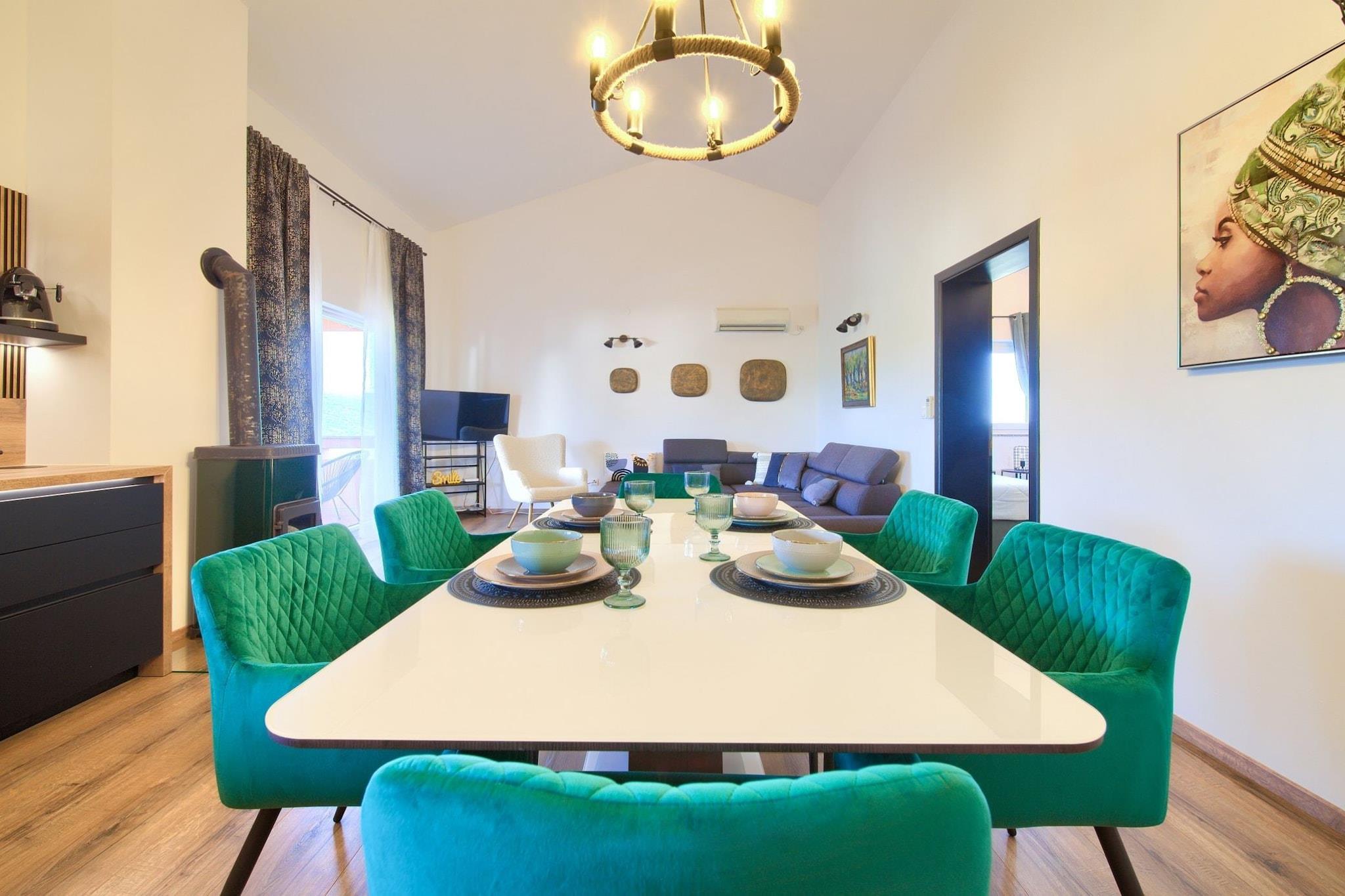 An "Elegant and Vibrant Apartment with Terrace and Sea View" in Kornic would likely offer modern and stylish accommodations, blending comfort with a touch of luxury. Sea View Terrace: A private outdoor space offering breathtaking views of the Adriatic Sea, perfect for relaxing or enjoying meals al fresco. Fully equipped kitchen, air conditioning, Wi-Fi, and other conveniences to ensure a comfortable stay. Note: Pets are allowed with notice. Private parking, reservation is not required. Wi-Fi is available throughout the property. This two-bedroom can accommodate up to six guests. It features a Cable TV, Flat screen TV and is combined with a living room and kitchen. The private bathroom is equipped with a shower and toilet. Thanks to its excellent location, everything you'll need for your vacation is just a short walk away from the property. Grocery stores-600.00 m, cafes and restaurants—650.00 m. The beach is 600.00 m away from the property. The airport is 25 km away from the property.