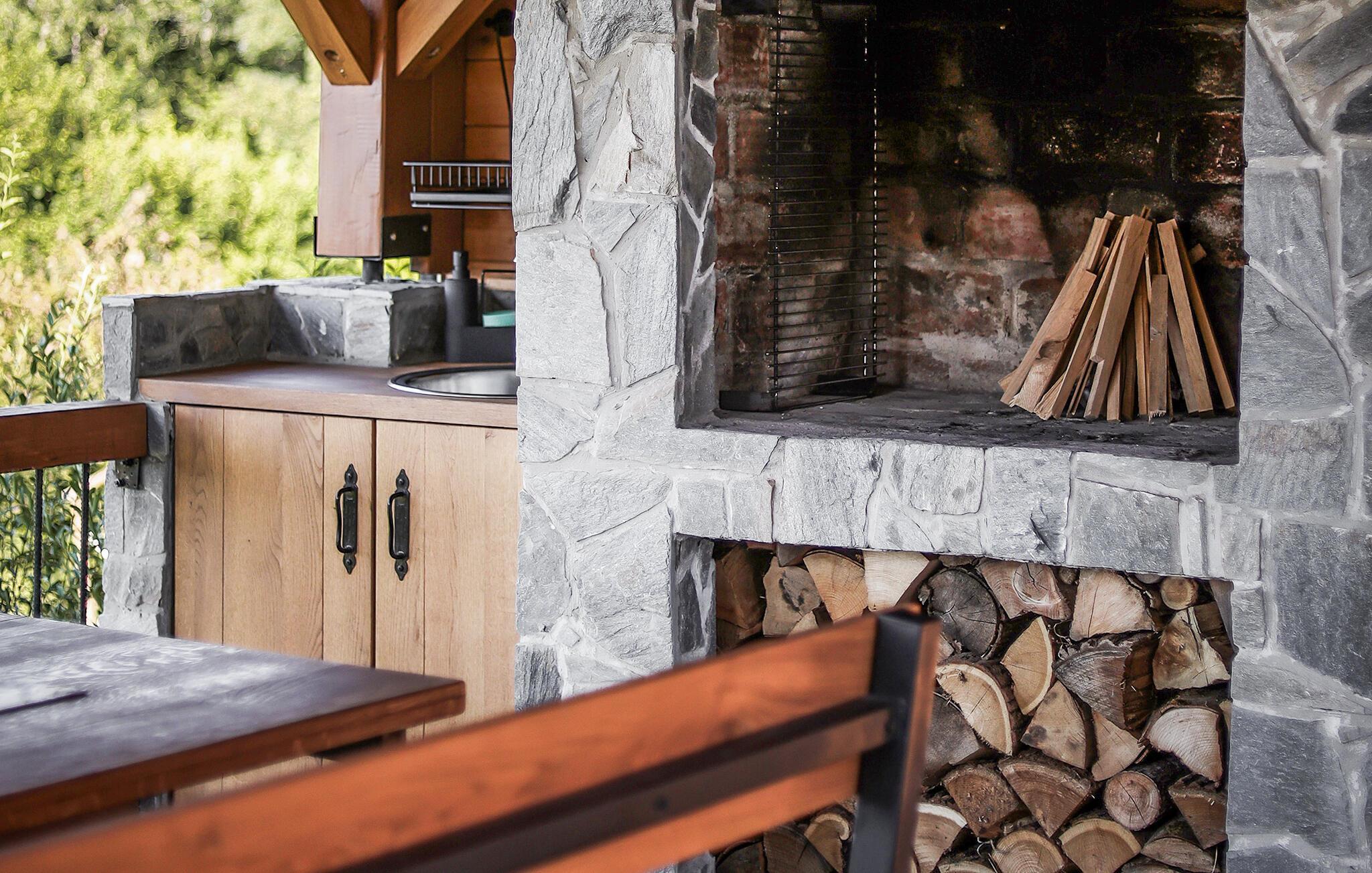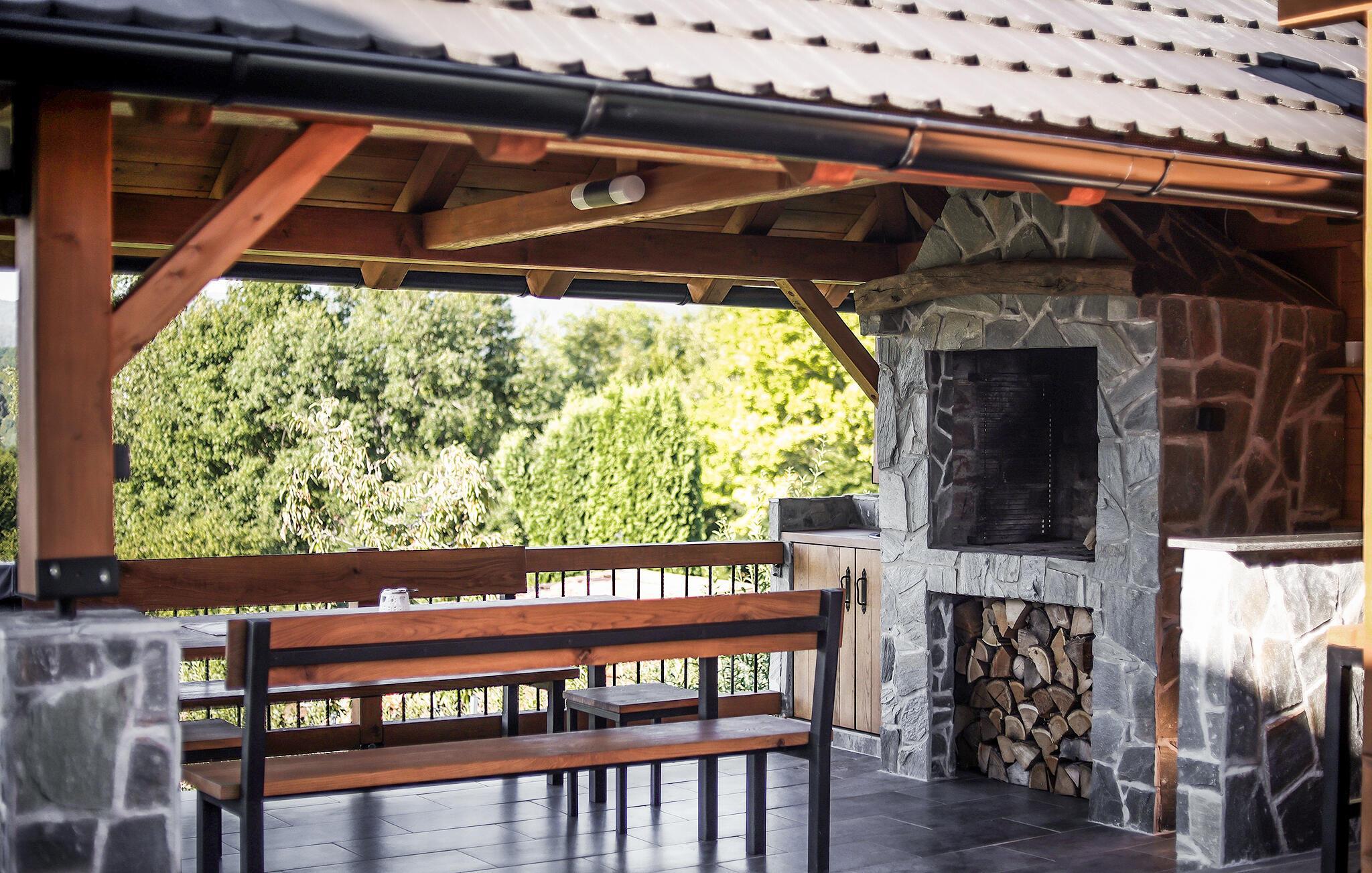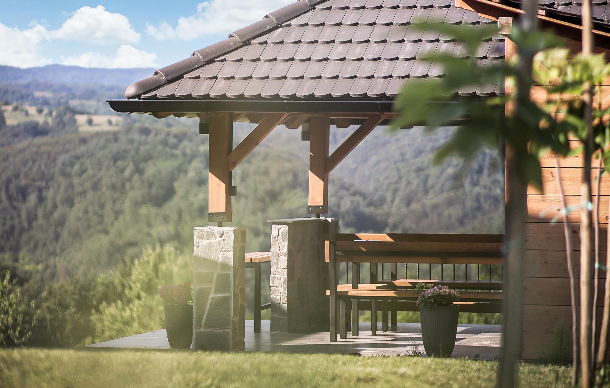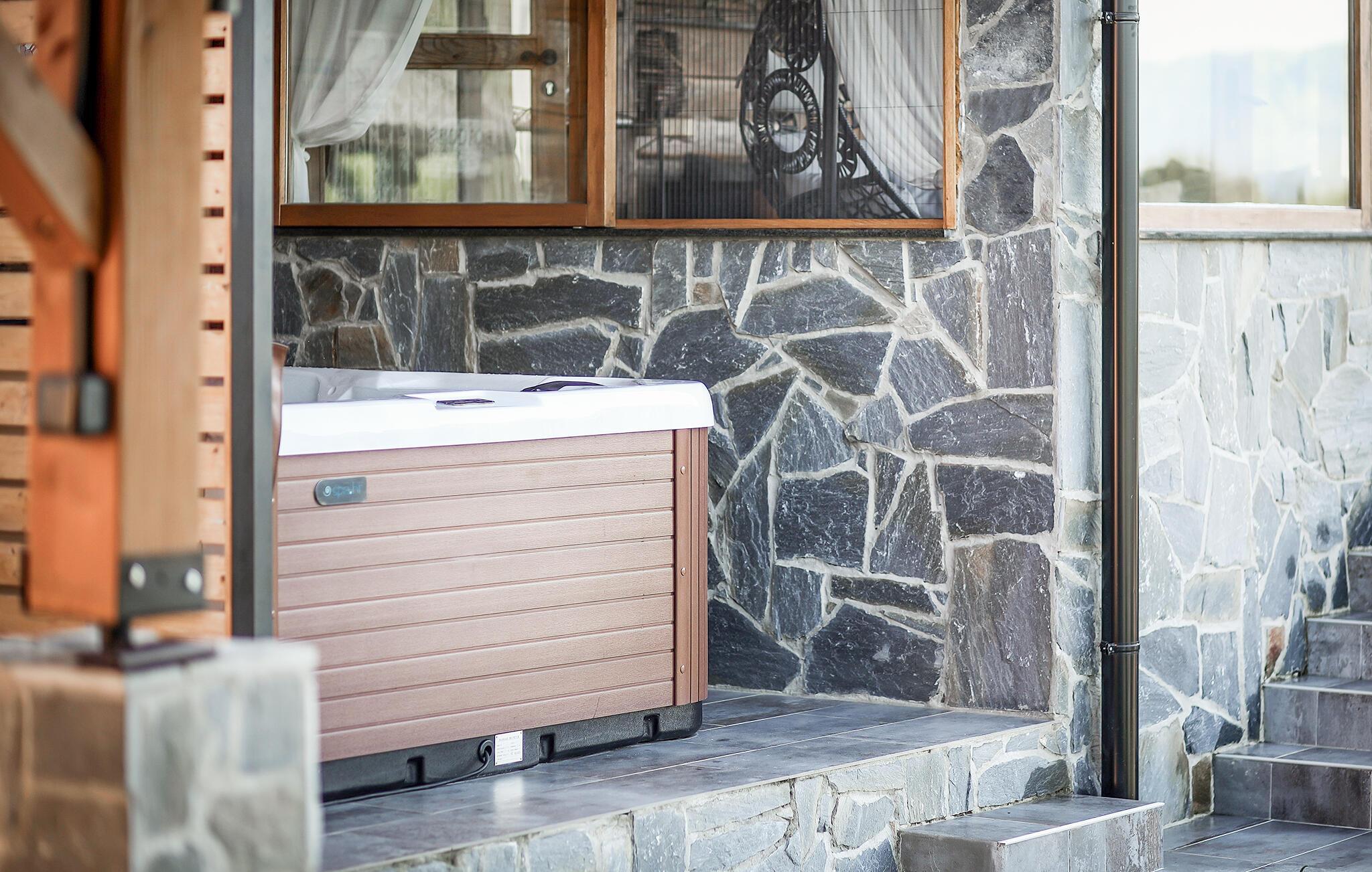 Fra balkonen og terrassen med havemøbler kan I nyde den vidunderlige udsigt over de omkringliggende bjerge. Efter en dag i naturen kan I slappe af i boblebadet eller afslutte aftenen ved udendørspejsen i haven – et sandt sted for ro og afslapning.