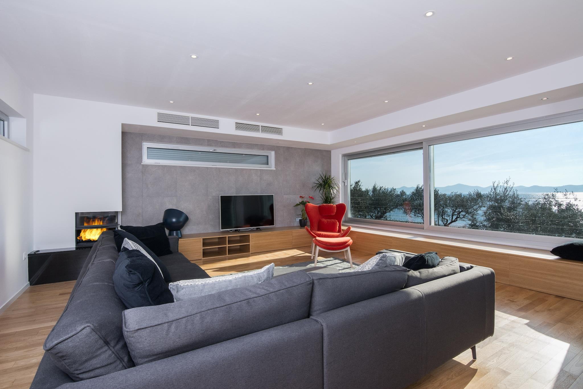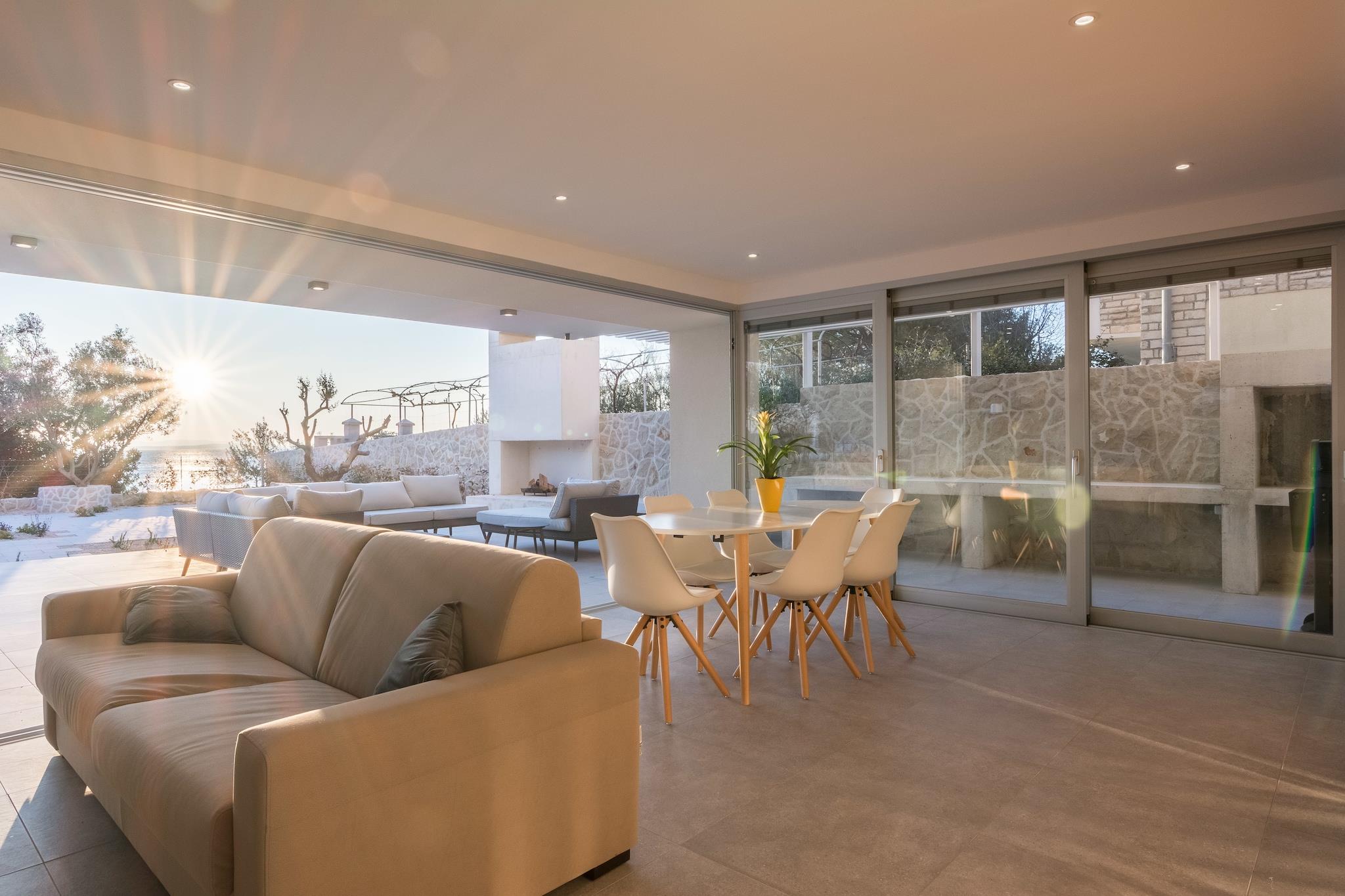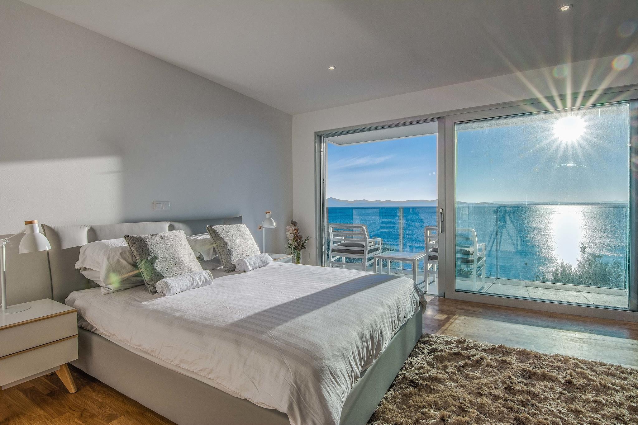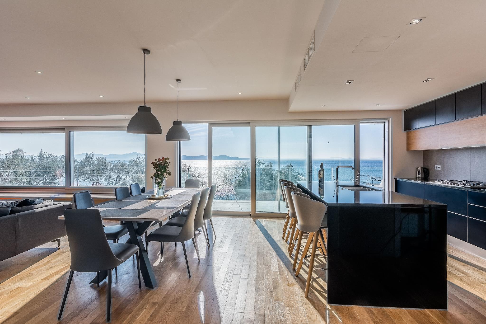 En moderne, rummelig luksus tre niveau villa beliggende ved vandkanten med uhindret udsigt over Adriaterhavet. Gulv til loft vinduer oversvømmer villaen med naturligt lys og giver en fantastisk udsigt over havet og øerne i det fjerne. Perfekt til familier eller voksne vennegrupper på op til 10 for at nyde et afslappende ophold i hjertet af Dalmatien. Fuldt airconditioneret i alle boliger og soveområder. Grundniveauet har skydedøre, der åbner på to sider for at skabe et indendørs udendørs opholdsrum. niveau har et fuldt udstyret køkken, spiseplads, vaskemaskine / tørretumbler, udendørs pejs og gasgrill. Du har også direkte adgang til havet. På dette niveau er der et soveværelse med to enkeltsenge, direkte adgang til terrassen og et komplet badeværelse . Det andet niveau er det primære boligareal med et luksuriøst køkken, spiseplads, tv / opholdsstue og en udendørs terrasse. På dette niveau er der også et soveværelse med køjesenge og et komplet bad. På tredje niveau er der to rummelige soveværelser Vid h dronning senge og ensuite badeværelser med opvarmede gulve. Begge værelser tilbyder en fantastisk udsigt med et soveværelse med egen privat terrasse. Strandbyen ligger i den rolige landsby Kozino. Der er flere restauranter i gåafstand fra villaen. Byen Zadar ligger 10 minutter i bil. Nabolandsbyen Petrcane byder på masser af sommeraktiviteter i turistsæsonen.