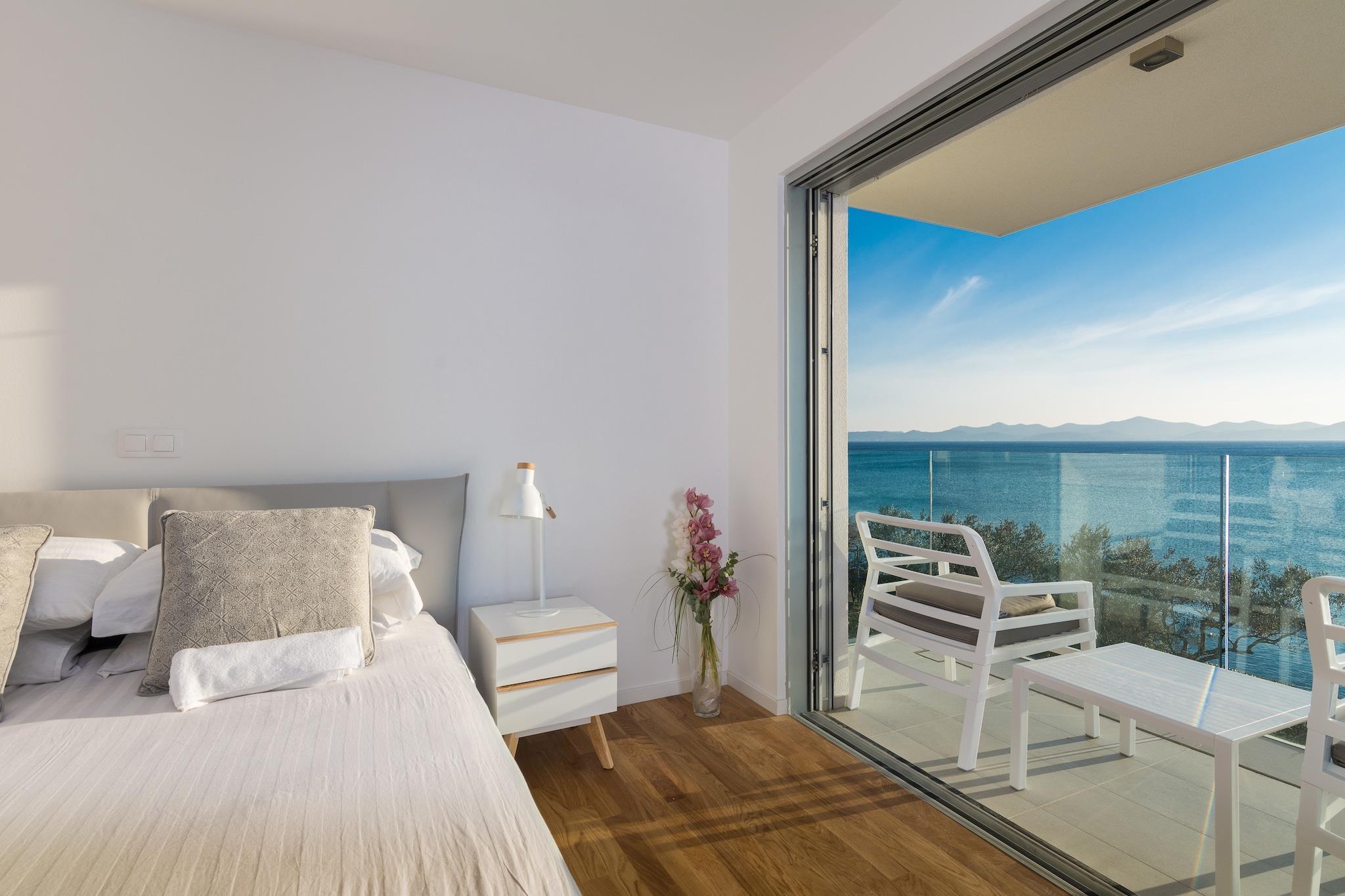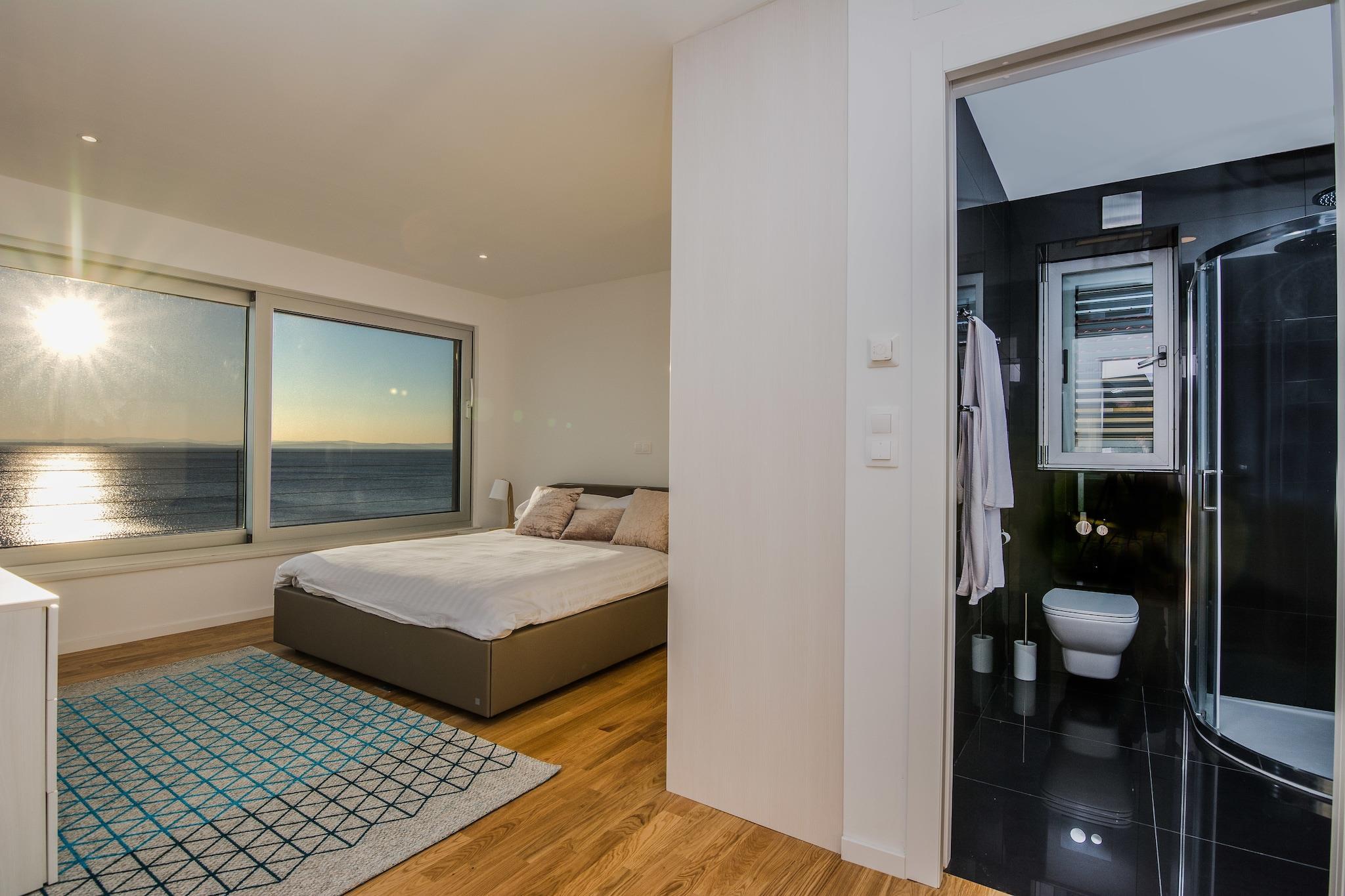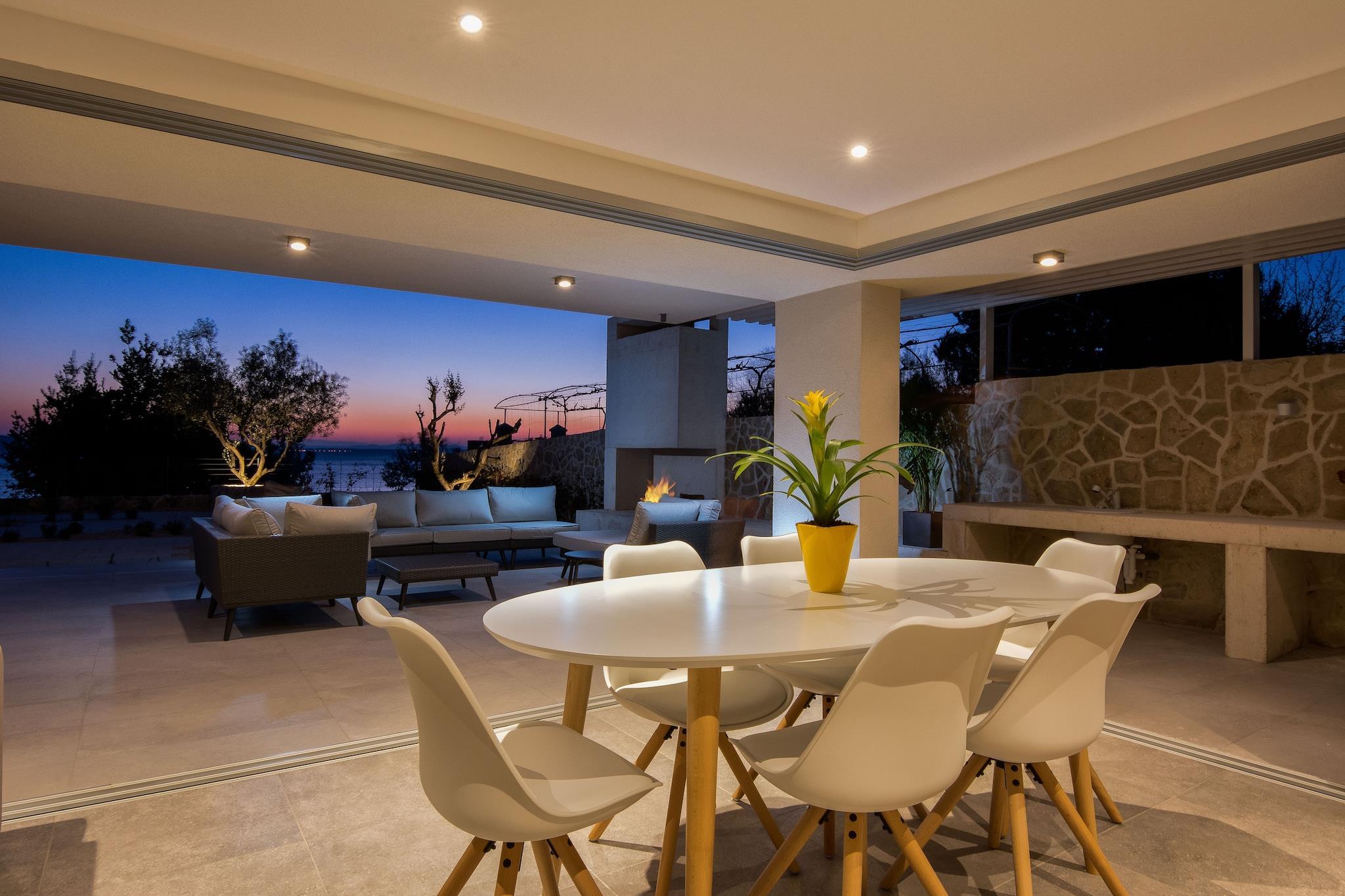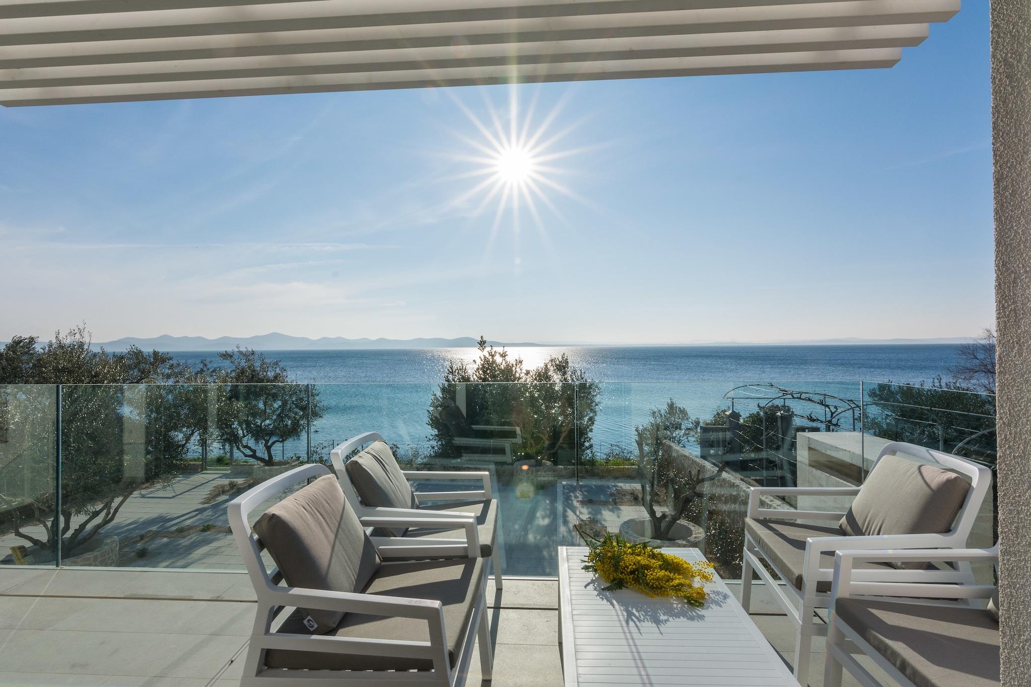 En moderne, rummelig luksus tre niveau villa beliggende ved vandkanten med uhindret udsigt over Adriaterhavet. Gulv til loft vinduer oversvømmer villaen med naturligt lys og giver en fantastisk udsigt over havet og øerne i det fjerne. Perfekt til familier eller voksne vennegrupper på op til 10 for at nyde et afslappende ophold i hjertet af Dalmatien. Fuldt airconditioneret i alle boliger og soveområder. Grundniveauet har skydedøre, der åbner på to sider for at skabe et indendørs udendørs opholdsrum. niveau har et fuldt udstyret køkken, spiseplads, vaskemaskine / tørretumbler, udendørs pejs og gasgrill. Du har også direkte adgang til havet. På dette niveau er der et soveværelse med to enkeltsenge, direkte adgang til terrassen og et komplet badeværelse . Det andet niveau er det primære boligareal med et luksuriøst køkken, spiseplads, tv / opholdsstue og en udendørs terrasse. På dette niveau er der også et soveværelse med køjesenge og et komplet bad. På tredje niveau er der to rummelige soveværelser Vid h dronning senge og ensuite badeværelser med opvarmede gulve. Begge værelser tilbyder en fantastisk udsigt med et soveværelse med egen privat terrasse. Strandbyen ligger i den rolige landsby Kozino. Der er flere restauranter i gåafstand fra villaen. Byen Zadar ligger 10 minutter i bil. Nabolandsbyen Petrcane byder på masser af sommeraktiviteter i turistsæsonen.