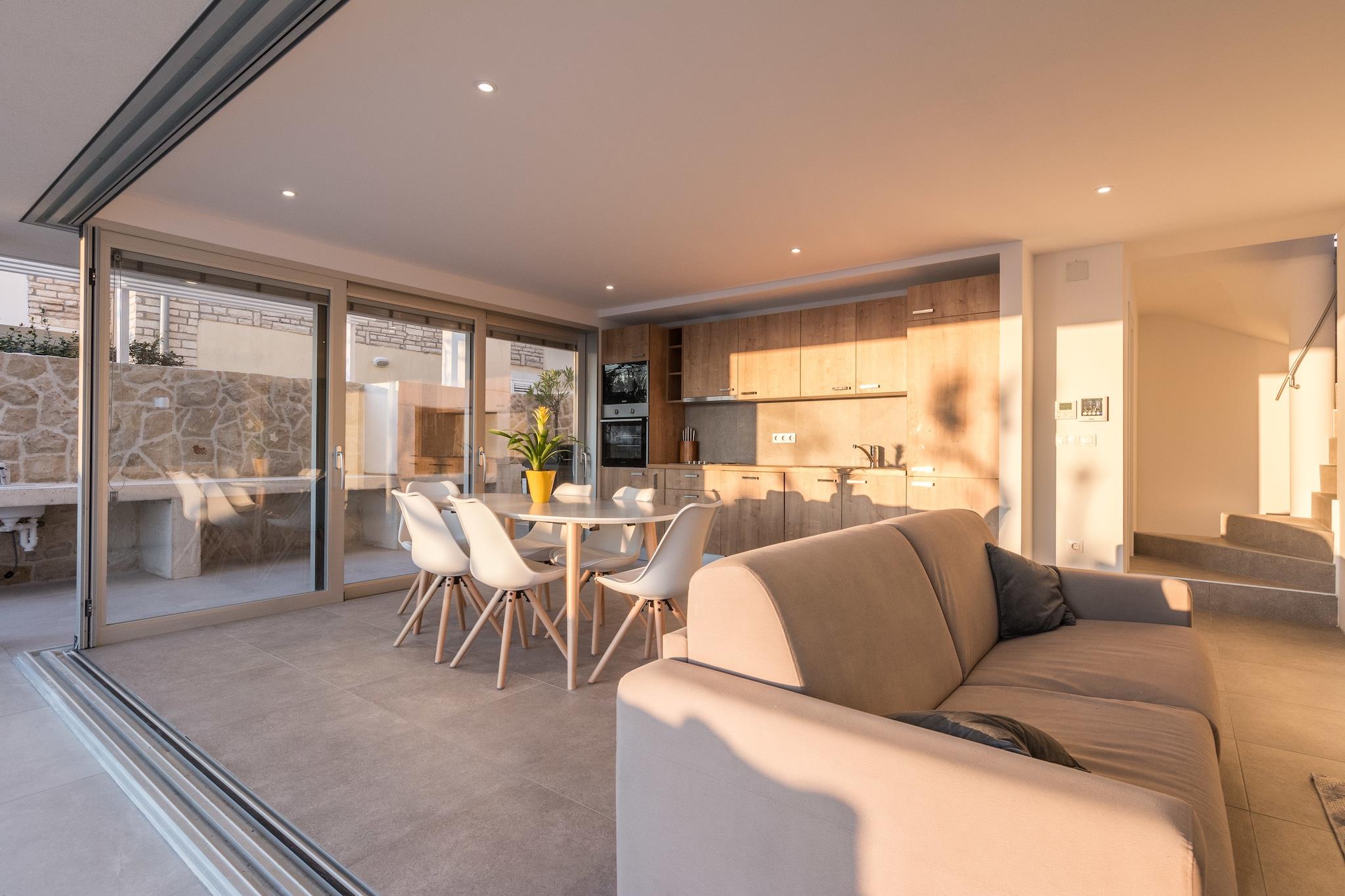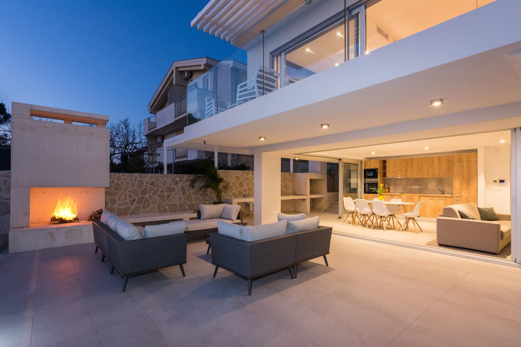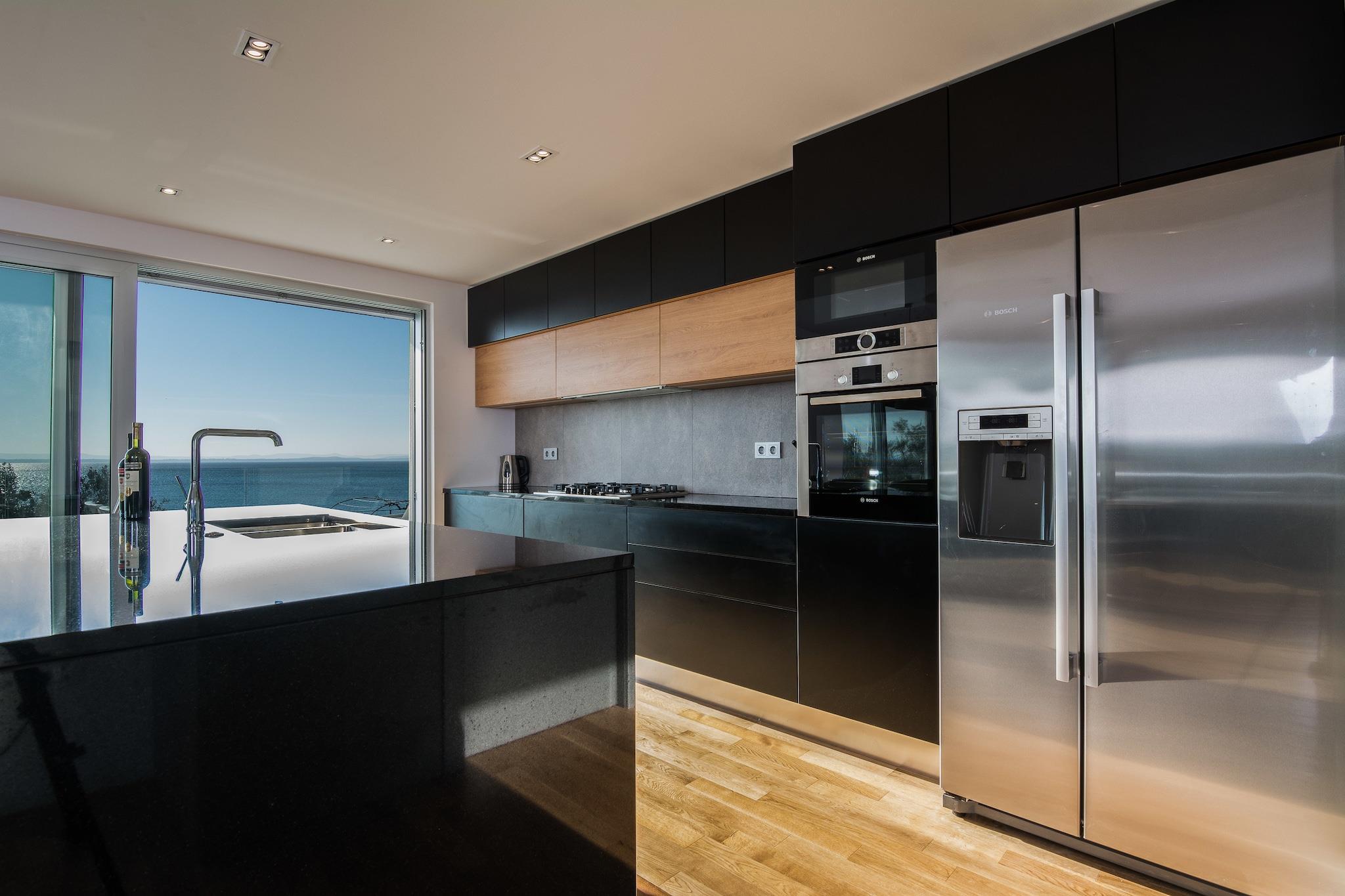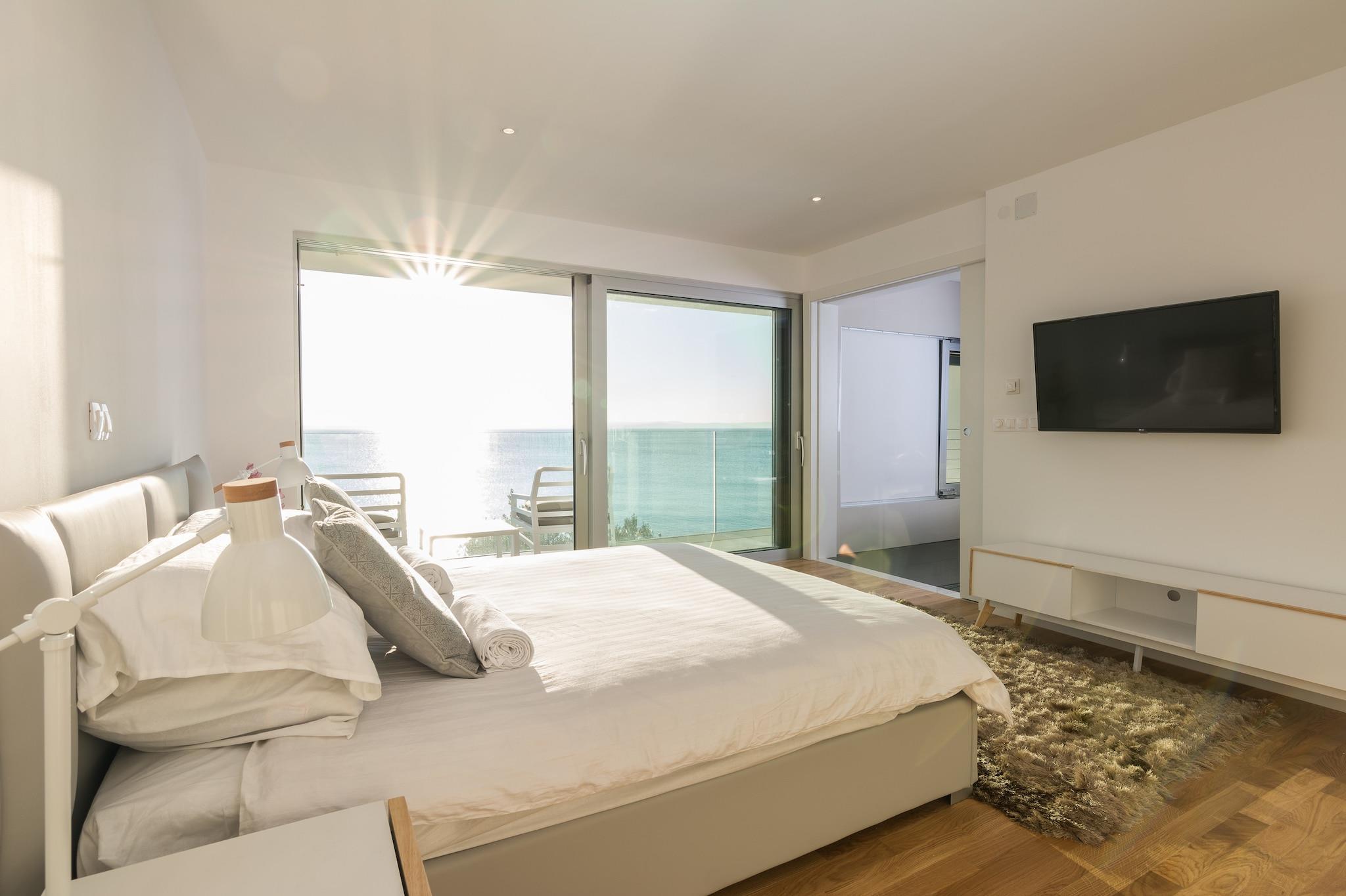 En moderne, rummelig luksus tre niveau villa beliggende ved vandkanten med uhindret udsigt over Adriaterhavet. Gulv til loft vinduer oversvømmer villaen med naturligt lys og giver en fantastisk udsigt over havet og øerne i det fjerne. Perfekt til familier eller voksne vennegrupper på op til 10 for at nyde et afslappende ophold i hjertet af Dalmatien. Fuldt airconditioneret i alle boliger og soveområder. Grundniveauet har skydedøre, der åbner på to sider for at skabe et indendørs udendørs opholdsrum. niveau har et fuldt udstyret køkken, spiseplads, vaskemaskine / tørretumbler, udendørs pejs og gasgrill. Du har også direkte adgang til havet. På dette niveau er der et soveværelse med to enkeltsenge, direkte adgang til terrassen og et komplet badeværelse . Det andet niveau er det primære boligareal med et luksuriøst køkken, spiseplads, tv / opholdsstue og en udendørs terrasse. På dette niveau er der også et soveværelse med køjesenge og et komplet bad. På tredje niveau er der to rummelige soveværelser Vid h dronning senge og ensuite badeværelser med opvarmede gulve. Begge værelser tilbyder en fantastisk udsigt med et soveværelse med egen privat terrasse. Strandbyen ligger i den rolige landsby Kozino. Der er flere restauranter i gåafstand fra villaen. Byen Zadar ligger 10 minutter i bil. Nabolandsbyen Petrcane byder på masser af sommeraktiviteter i turistsæsonen.
