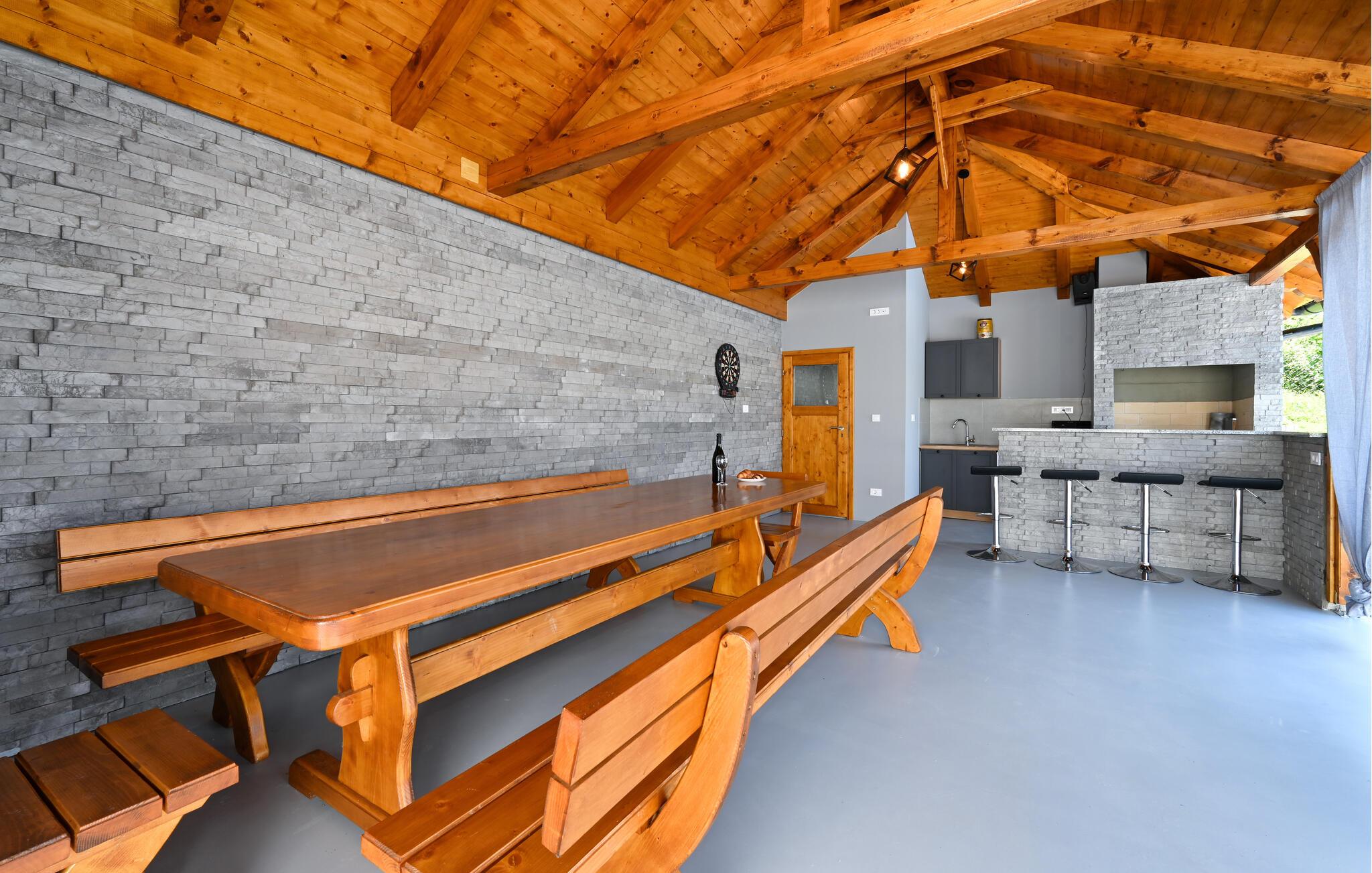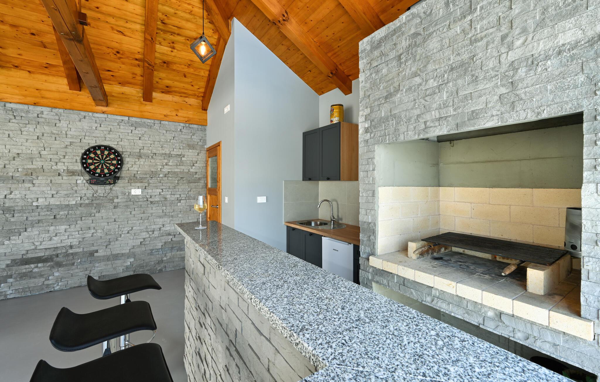 Nyd roen på den overdækkede altan, der byder på en betagende udsigt over det omkringliggende landskab. I stueetagen finder I desuden en dejlig veranda med bordfodbold. Her kan I både have det sjovt og nyde morgenkaffen i ro og mag. Udforsk haven med den store pool, der indbyder til badning og leg samt solbadning og afslapning. Det store overdækkede udendørskøkken er desuden perfekt til aftener med god mad i godt selskab.