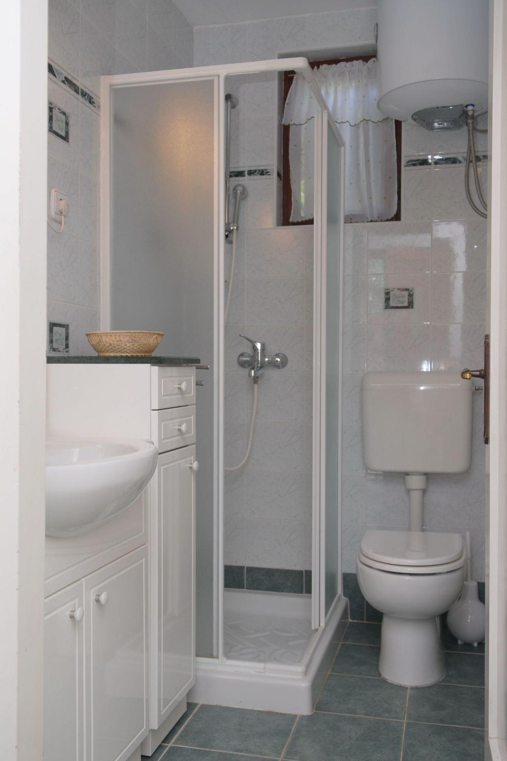 This fully equipped house can acommodate up to 4 persons. We recommend the car. The main entrance to the house leads across the terrace on the first floor through which you can see the sea. Here you can find the bathroom with a toilet and a shower and two bedrooms, one sleeping and one living room with which can be used as sleeping room as it has a sleep couch/sofa. Bedroms have a wood flooring, an overhead-ventilator in a sleeping room and air conditioner in a living room.