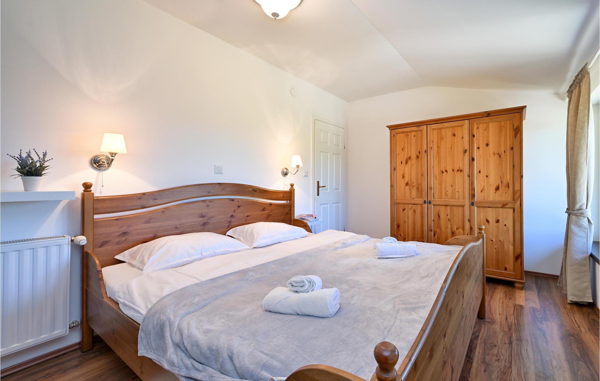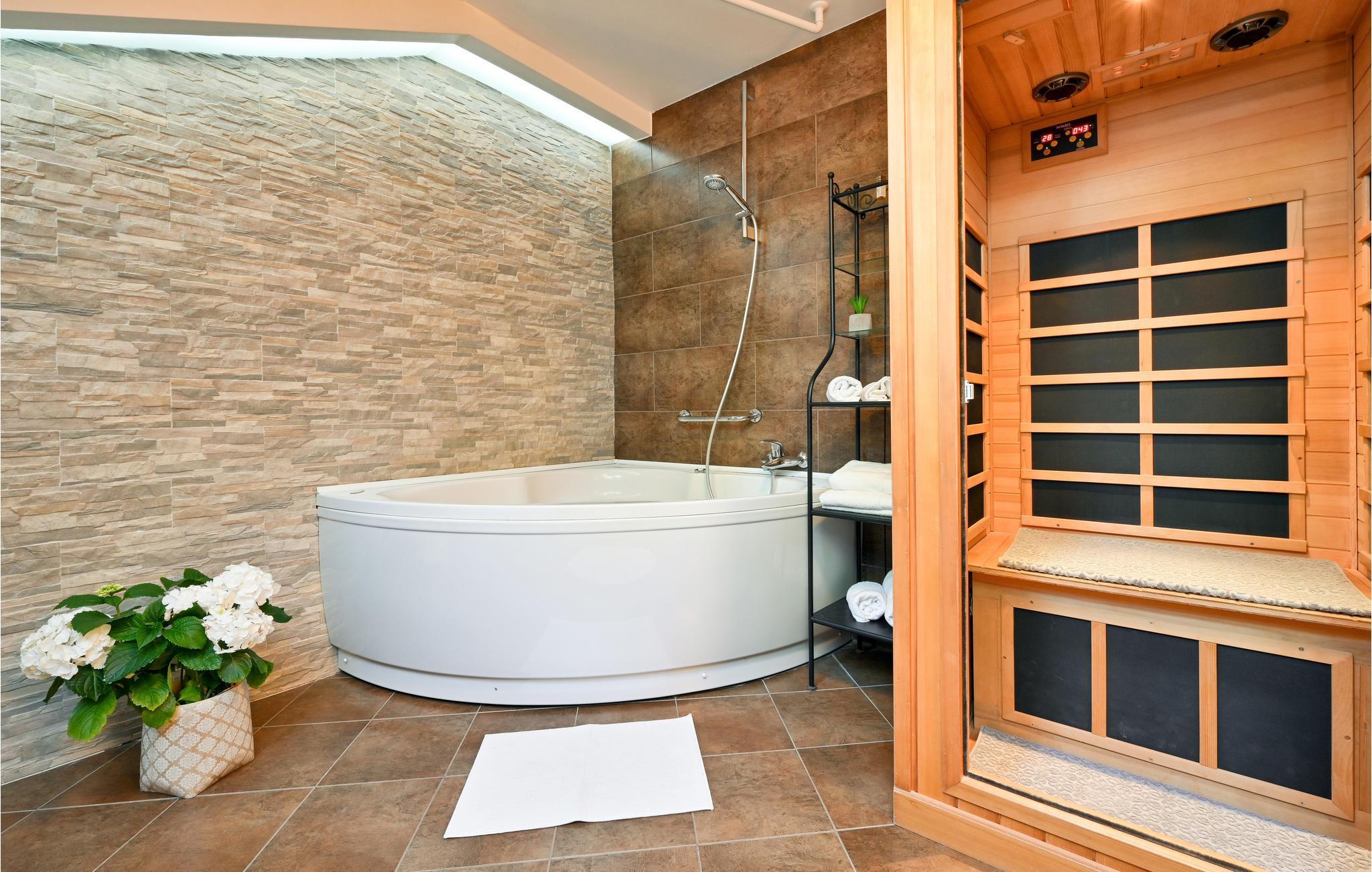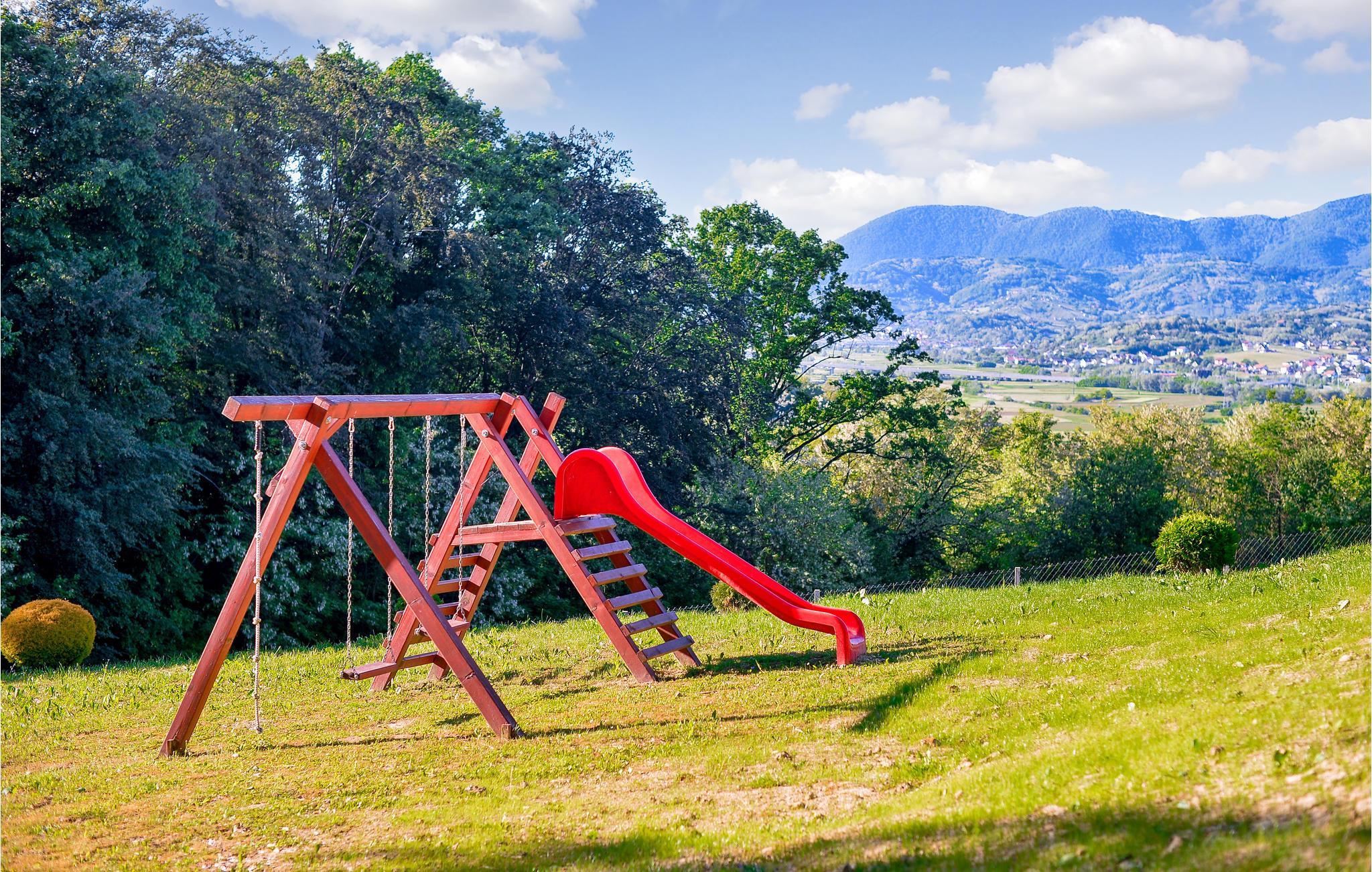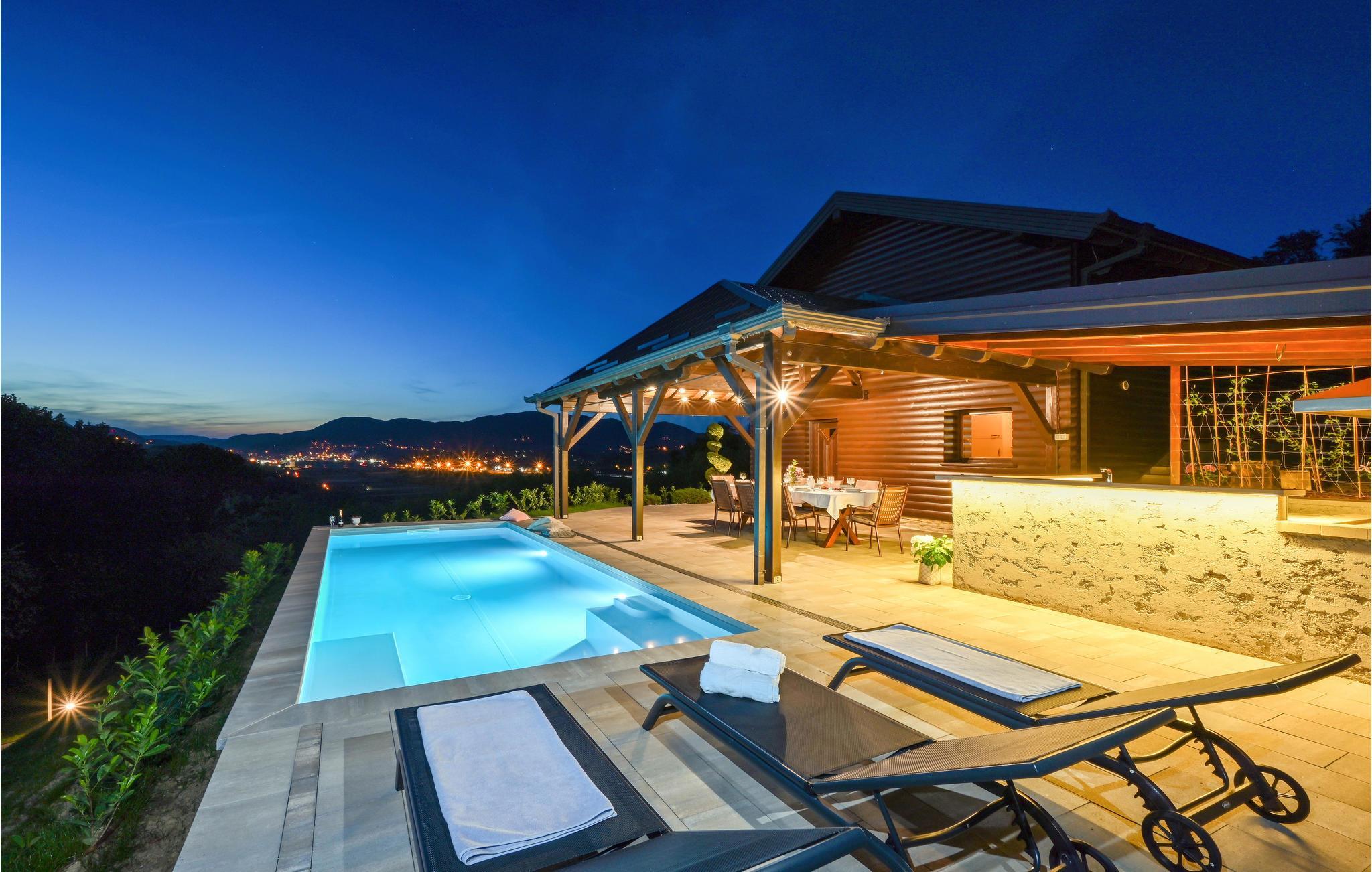 I finder denne topmoderne bjerghytte nær den slovenske grænse. Hytten nyder godt af en storslået panoramaudsigt over landskabet og kombinerer rustikke træ- og stenelementer med moderne bekvemmeligheder. Hyttens hjerte er den hyggelige opholdsstue med pejs og fjernsyn, der indbyder til mange gode stunder. I kan underholde jer med dart og bordfodbold i aktivitetsrummet.