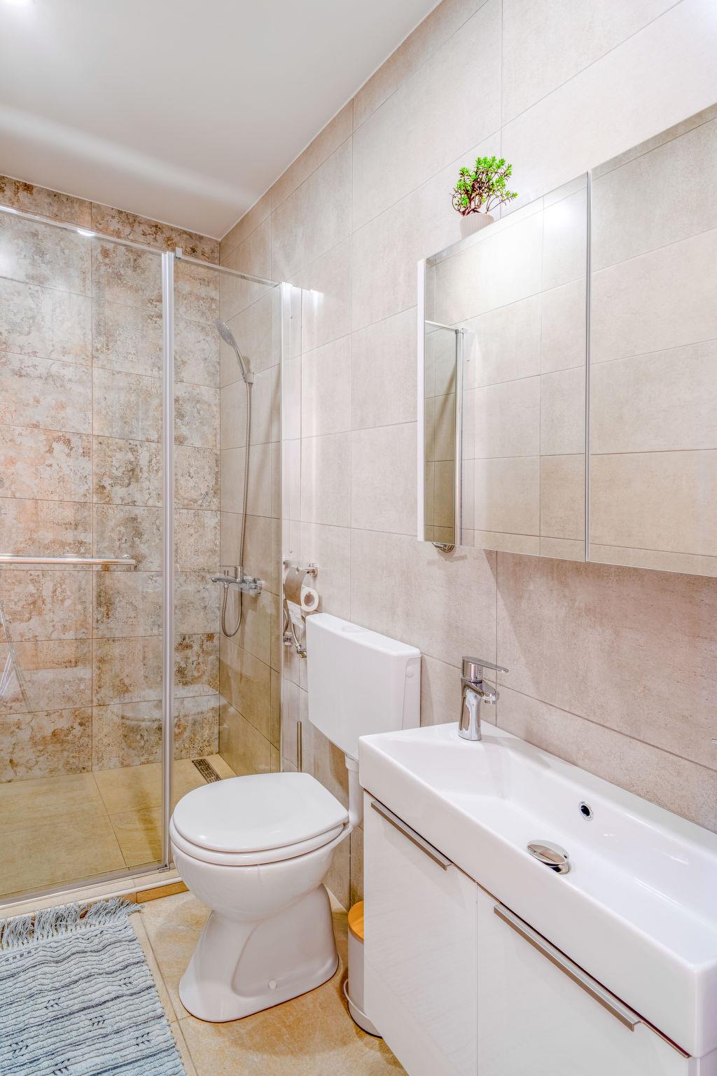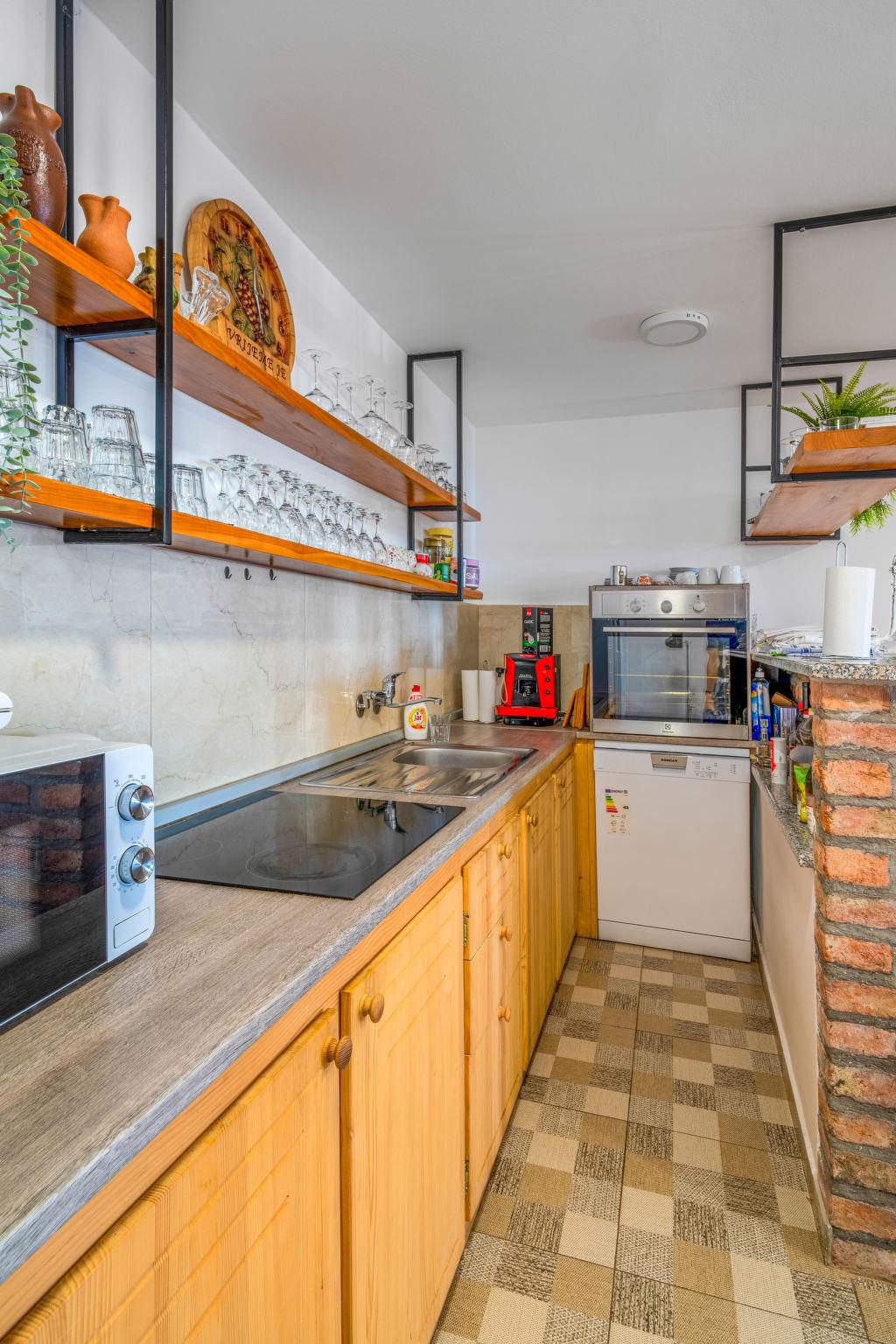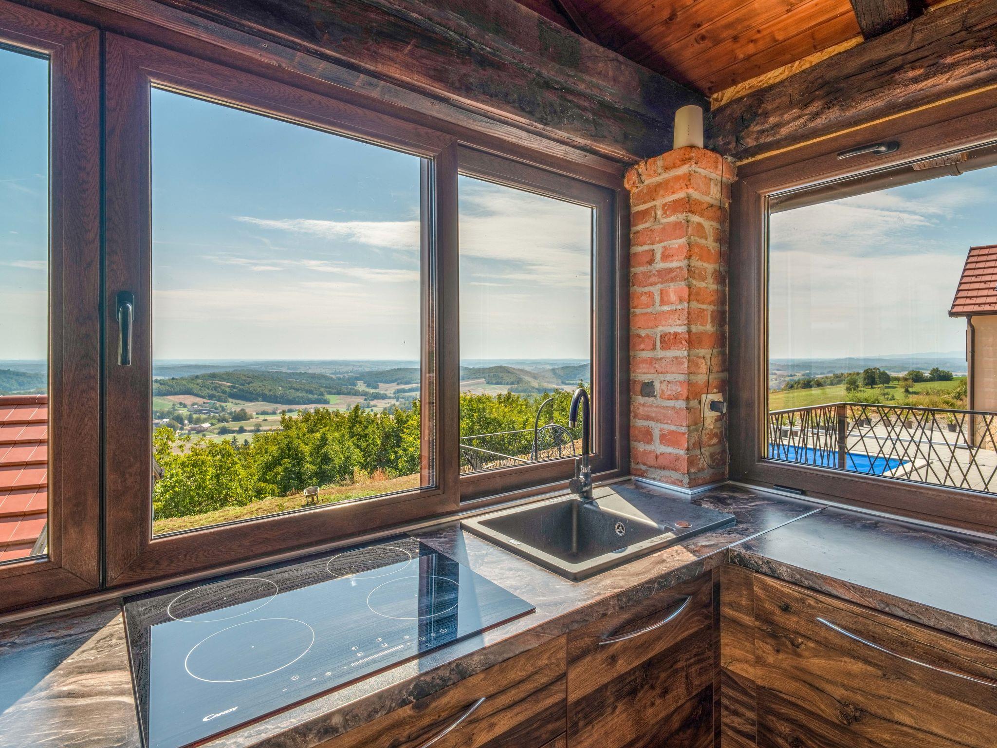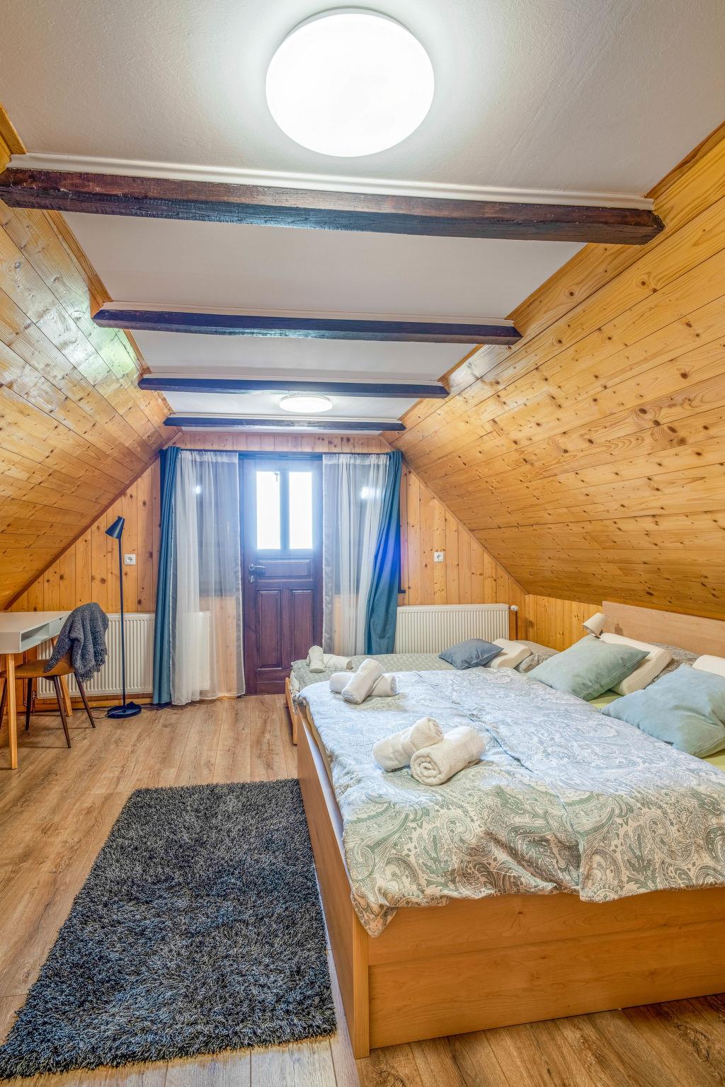 Kalnik 16 km from Križevci: Cosy, rustic single-family house "Vila Breg 1", 3 storeys. 42 km from the centre of Varaždin, 69 km from the centre of Zagreb, on a slope. For shared use: property 5'000 m2 with lawn 1'000 m2, trees, swimming pool angular heated (8 x 4 m, depth 145 cm, seasonal availability: 15.Apr. - 14.Oct.) with salt water, internal staircase and salt-electrolysis pool-cleaning system. Shower/WC in the pool area, outdoor shower, hot tub, table tennis, terrace (20 m2), garden furniture, barbecue house, children's playground (slide, swing), pool maintenance by the owner/gardener. In the complex: internet access, sauna, table football. Steep motor access to the house (100 m via unmade road). Parking (for 2 cars) at the house on the premises. Shop 2.5 km, restaurant 3.5 km, café 2.7 km, bicycle rental 3.3 km, bus stop 1 km. Walking paths from the house 50 m. Nearby attractions: Old town Veliki Kalnik 3.6 km, Varaždinske toplice 33 km. Please note: Property ref. HR1740.701.1 is situated on the same property.