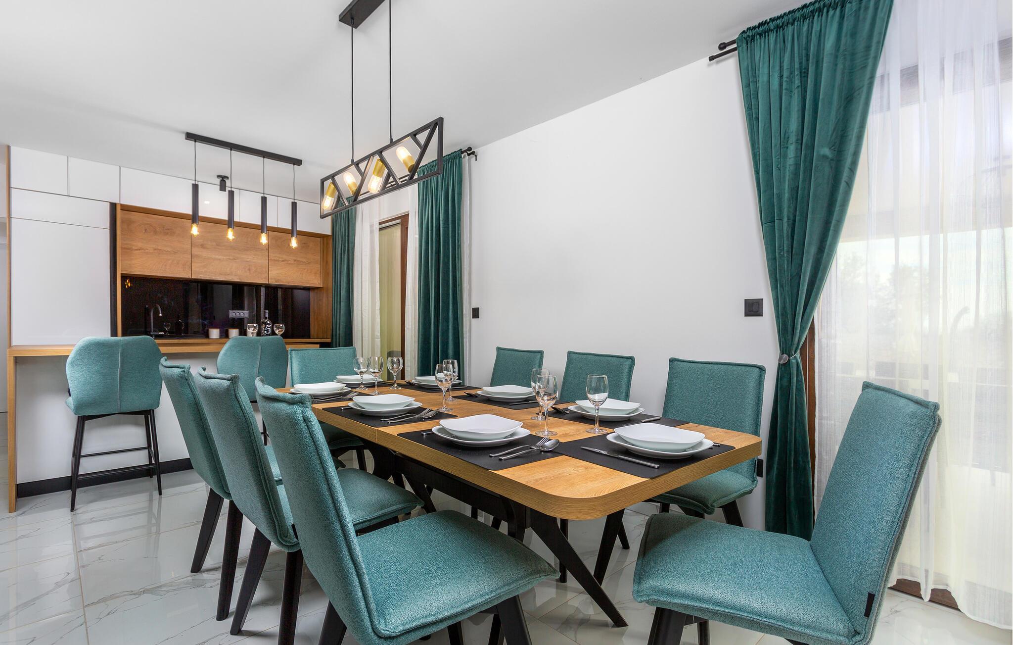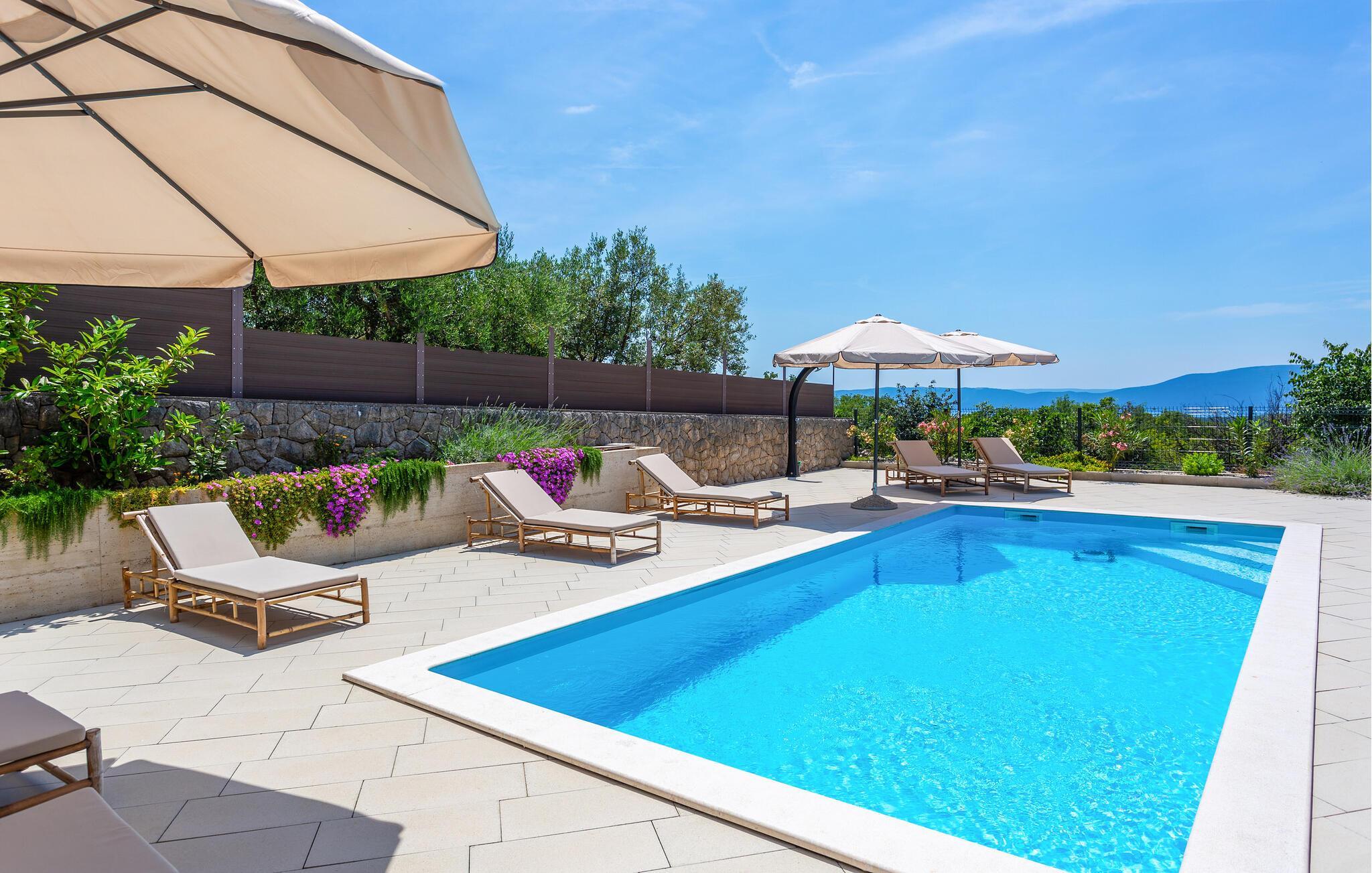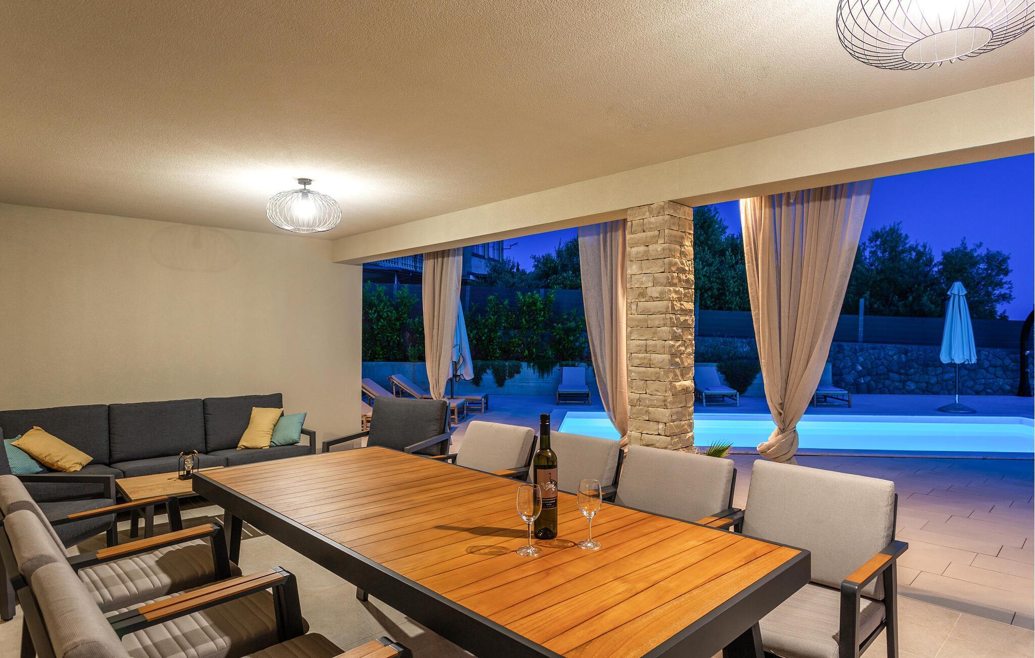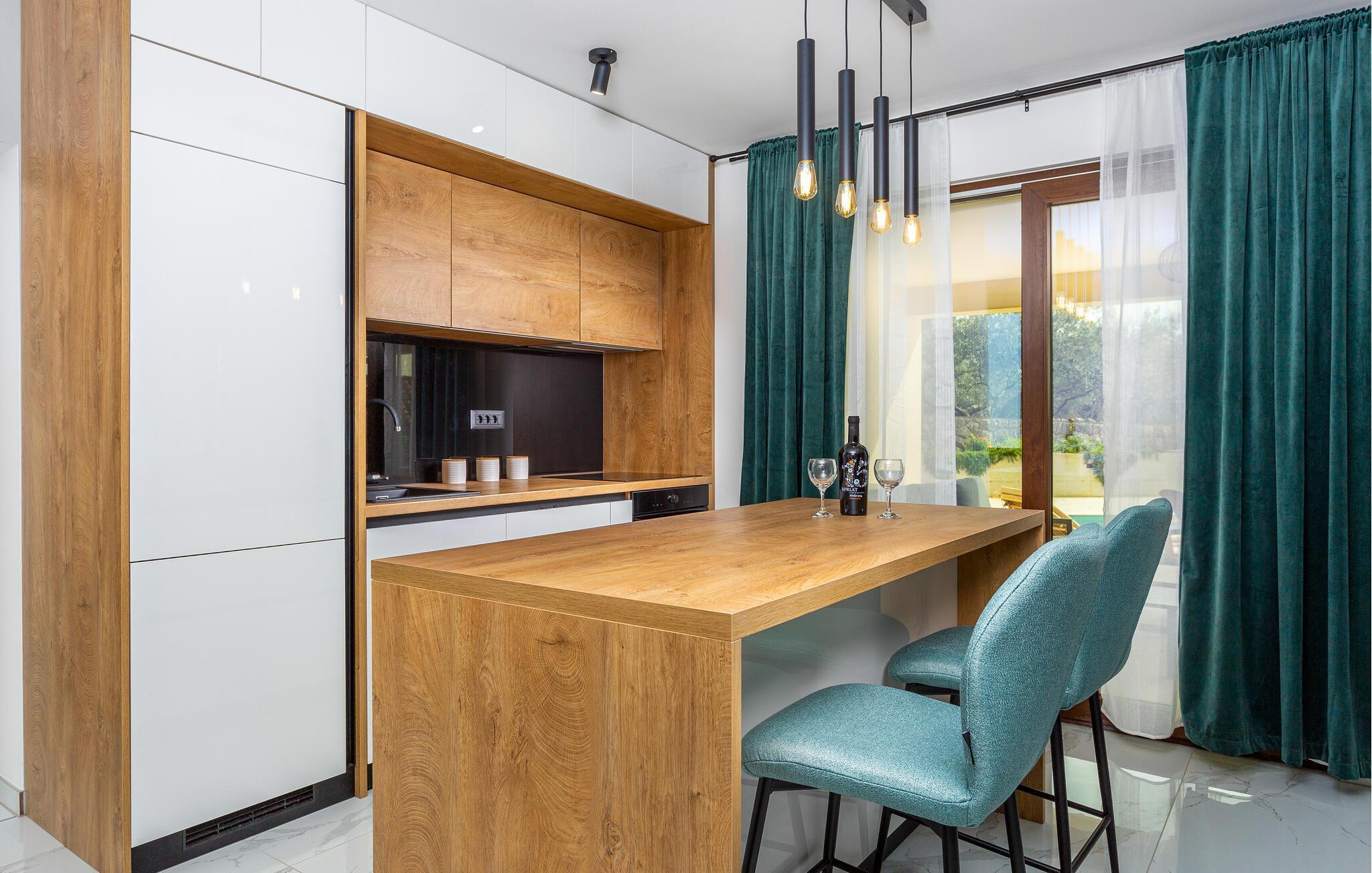 Tag den store familie under armen og rejs til øen Krk, hvor I kan se frem til en boligoplevelse ud over det sædvanlige i dette rummelige luksushus. Omgivelserne er virkelig fantastiske, og indvendigt fremtræder det flot, elegant og stilsikkert med alle de moderne faciliteter, I behøver for bare at sænke skuldrene og komme helt ned i tempo. Soveværelserne har eget badeværelse, så I får mulighed for lidt privatliv, når behovet måtte opstå. Det åbne opholdsrum forener køkken, spiseområde og stue i ét rum og danner rammen om mange hyggelige stunder med god tid til madlavningen, fællesmåltiderne og sjove filmaftener i sofaområdet.