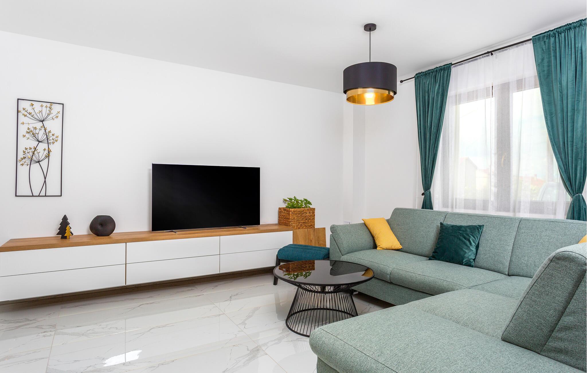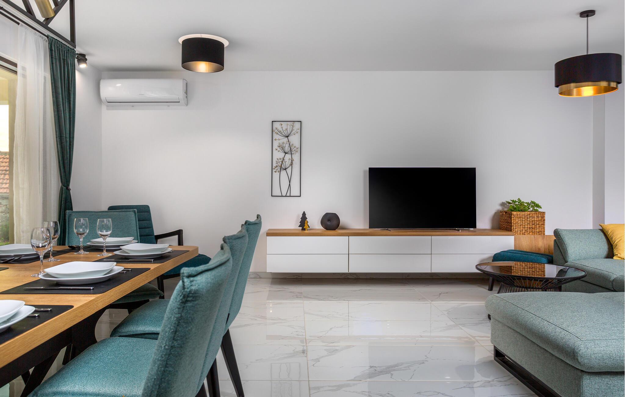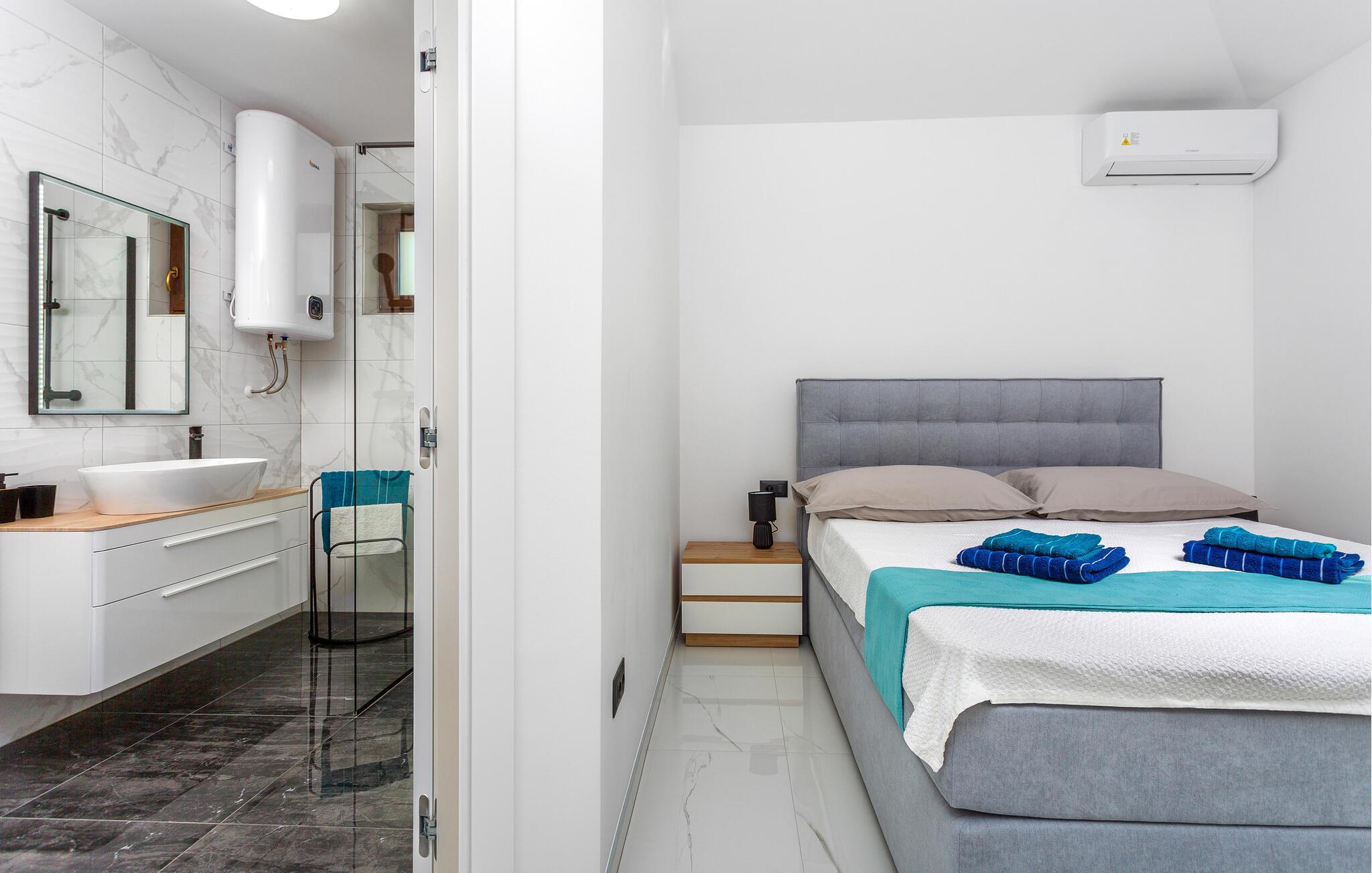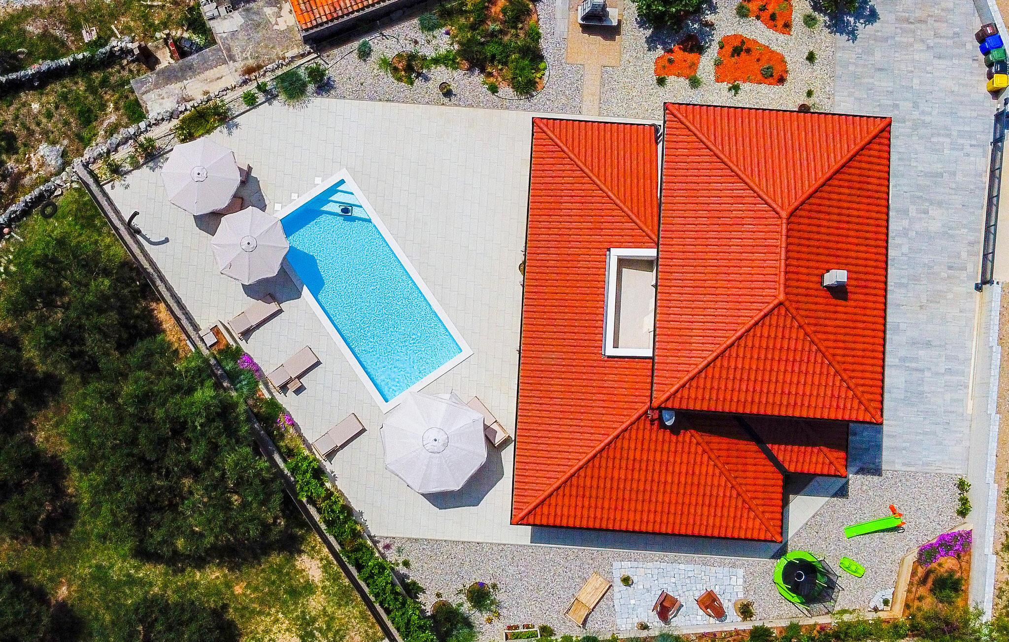 Tag den store familie under armen og rejs til øen Krk, hvor I kan se frem til en boligoplevelse ud over det sædvanlige i dette rummelige luksushus. Omgivelserne er virkelig fantastiske, og indvendigt fremtræder det flot, elegant og stilsikkert med alle de moderne faciliteter, I behøver for bare at sænke skuldrene og komme helt ned i tempo. Soveværelserne har eget badeværelse, så I får mulighed for lidt privatliv, når behovet måtte opstå. Det åbne opholdsrum forener køkken, spiseområde og stue i ét rum og danner rammen om mange hyggelige stunder med god tid til madlavningen, fællesmåltiderne og sjove filmaftener i sofaområdet.