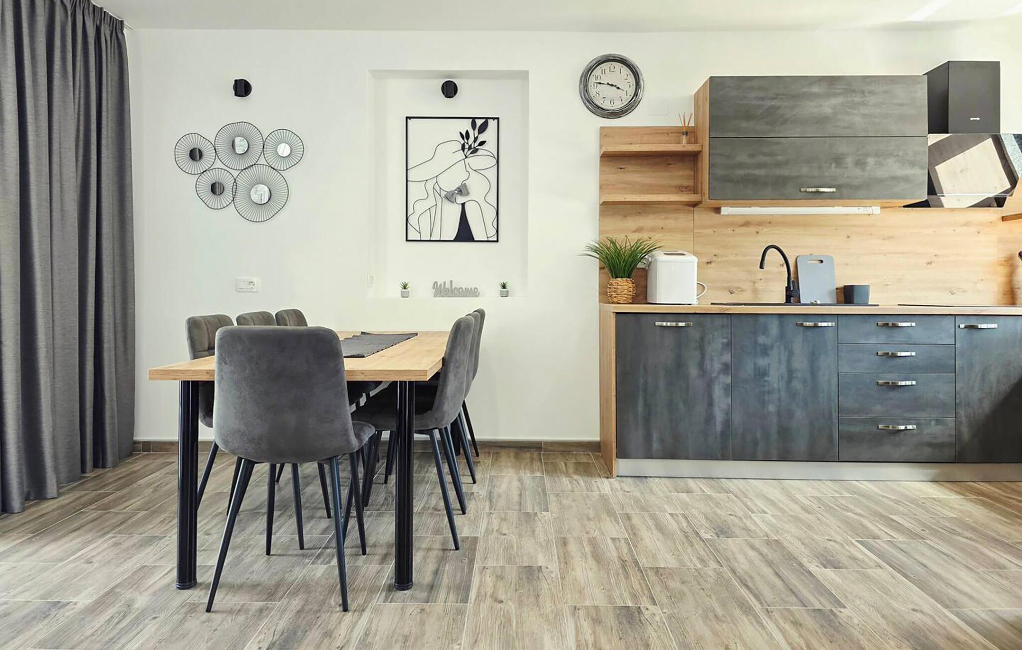 Dette feriehus er både hyggeligt og moderne indrettet, hvilket sikrer, at I vil føle jer hjemme lige fra starten. Det indbydende trælook skaber en behagelig atmosfære, hvor I kan genoplade batterierne. Læn jer tilbage i sofaen, lyt til jeres yndlingsmusik eller en interessant podcast. Tilbered lækre måltider sammen med jeres medrejsende og server dem med en god flaske vin.