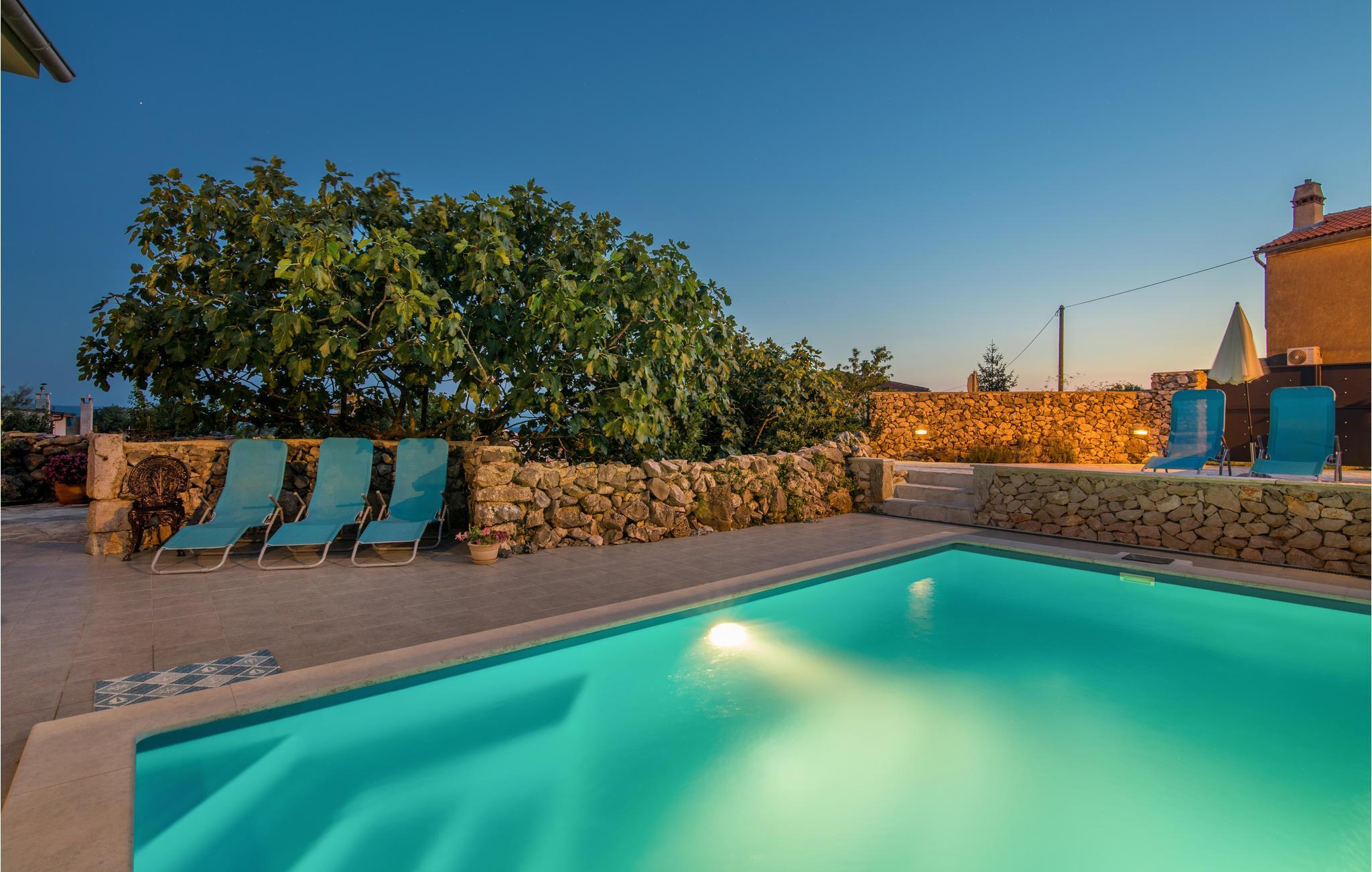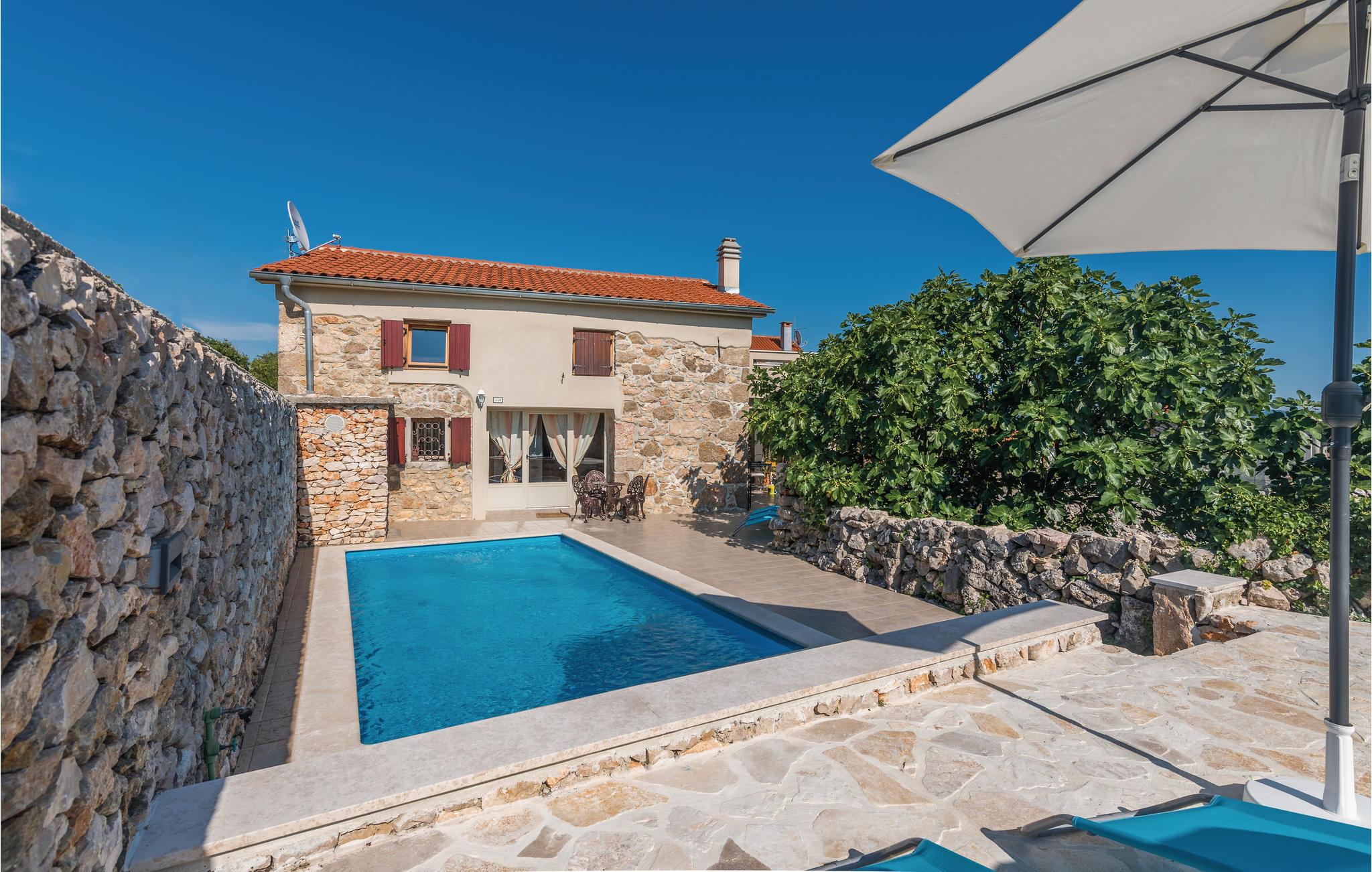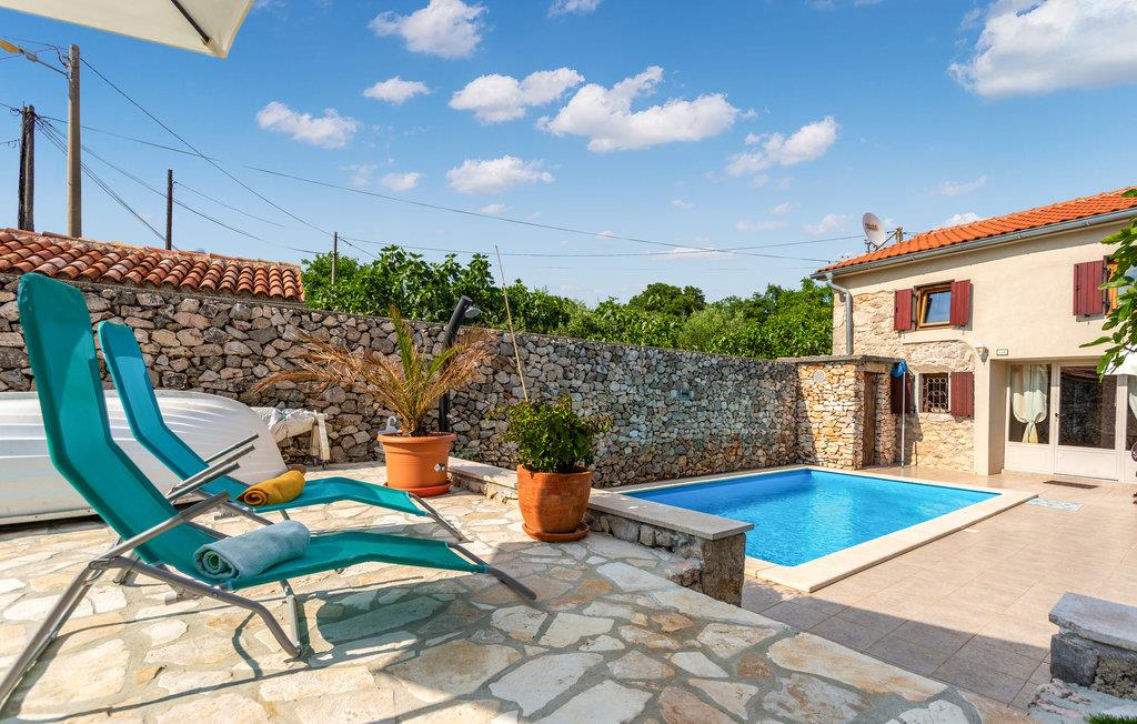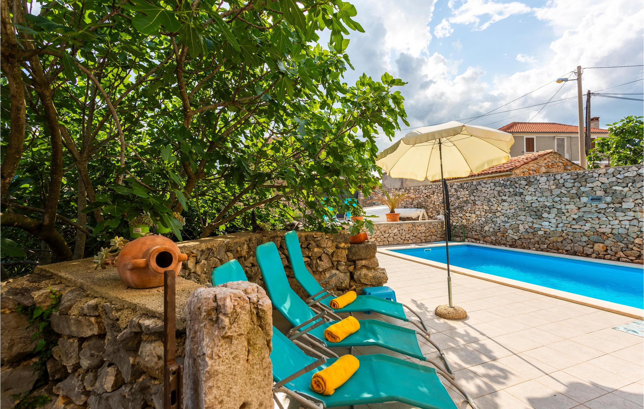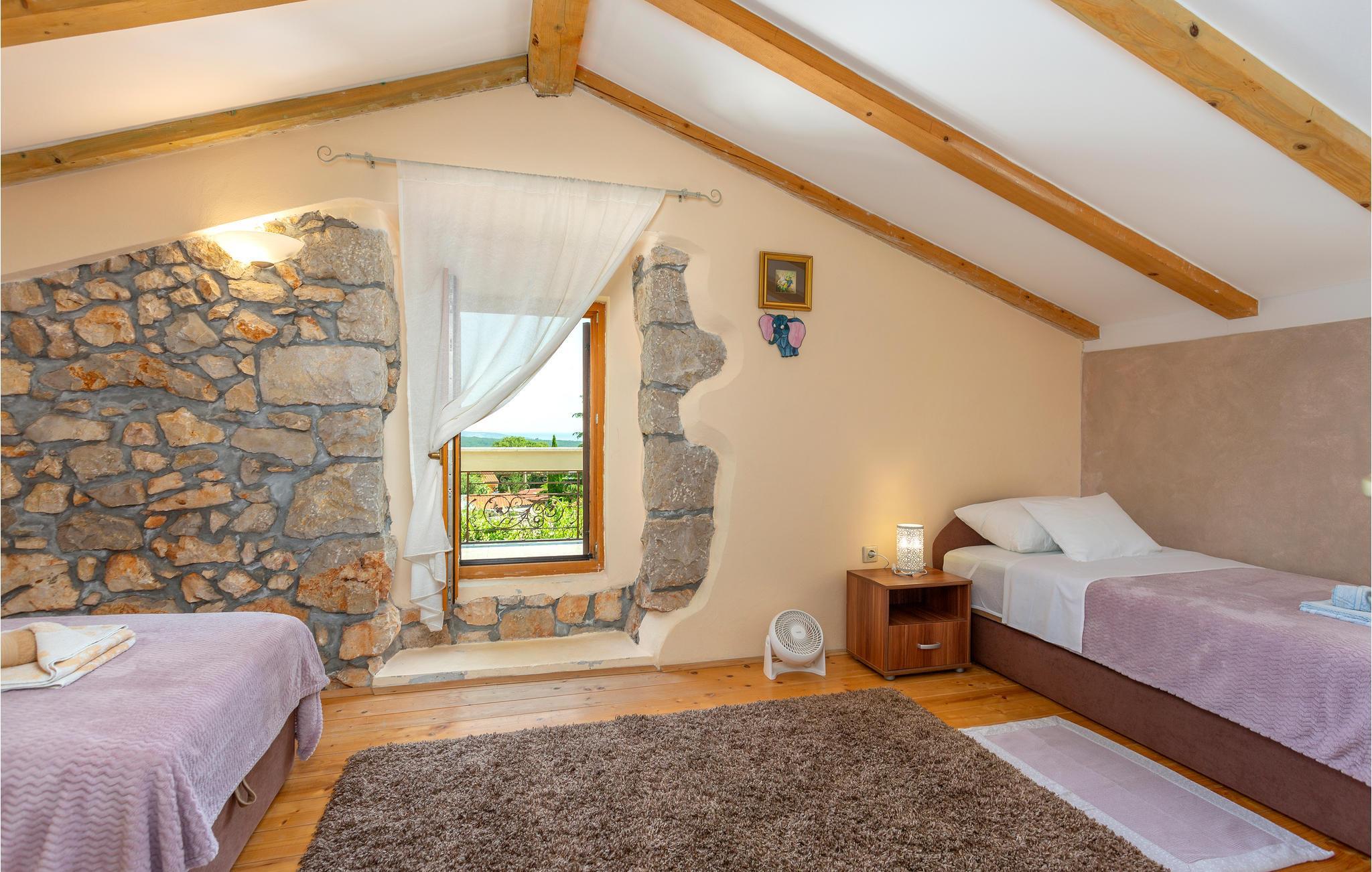 I en lille og rolig landsby på øen Krk Garica med perfekt beliggenhed for dem, der ønsker at tilbringe ferien midt i naturen, ligger dette skønne feriehus. I stueetagen er en stor stue med køkken og spisestue placeret med udgang til den smukt indrettede have. Den udendørs pool giver jer afkøling i løbet af de varme sommerdage. På øverste etage er soveværelser og et badeværelse. Et af soveværelserne har udgang til terrassen, hvorfra der er en smuk panoramaudsigt over landskabet og havet et par kilometer væk. På denne terrasse er det ideelt at tilbringe sommeraftener kun omgivet af lyde og dufte fra naturen. I soveværelse og badeværelse på den øverste etage er den mindste loftshøjde 100 cm. Huset er ideelt til en familie med børn. De nærmeste strande og turistbyer som Baska, Malinska og Krk nås let med bil.