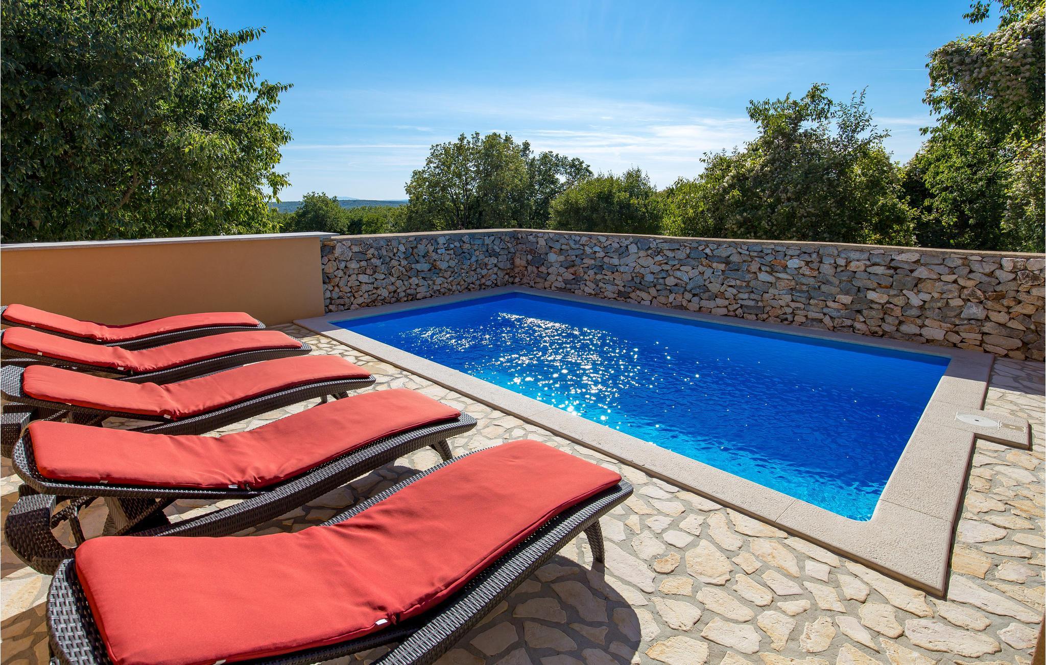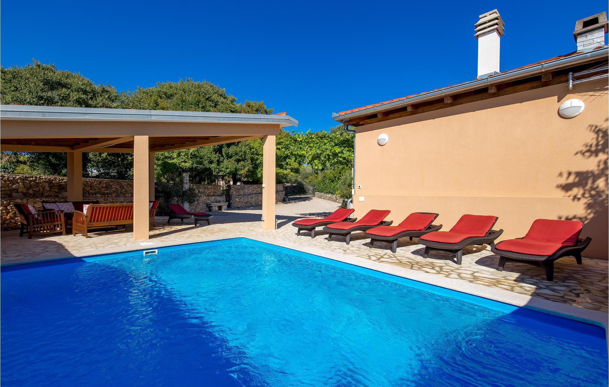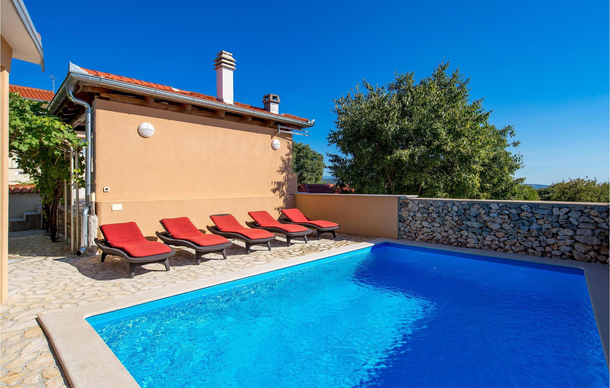 i en lille by, Garica, ligger dette rækkehus med et dejligt anlagt udeområde og en pool, som feriegæsterne må bruge. I har også to overdækkede terrasser; på den ene finder I et komplet udstyret udekøkken, den anden terrasse er direkte ved poolen. Stueetagen består af et pænt indrettet opholdsområde, soveværelserne ligger på første og anden sal. De nærmeste strande og feriebyerne Baska, Krk og Malinska med deres fritidsaktiviteter når I hurtigt i bil.