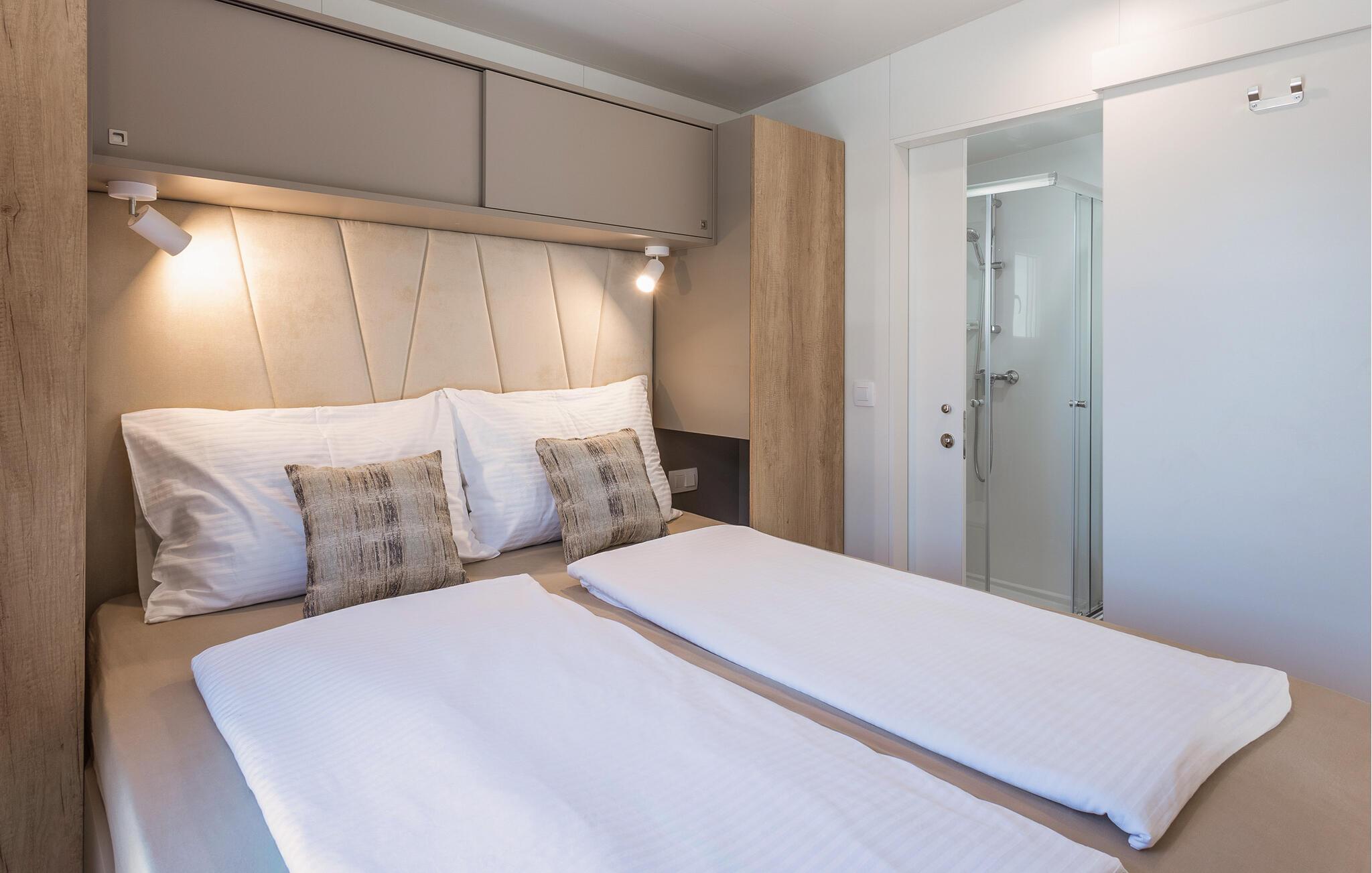 Dette lyse og moderne mobilehome ligger lige ved havet og tilbyder familien adskillige muligheder for at slappe af, dyrke sport og nyde udendørsspil. Planlæg jeres aktiviteter til afslappende måltider, brug det indbydende spisebord til sjove spilleaftener eller slap af efter en aktiv dag med stille læsning.