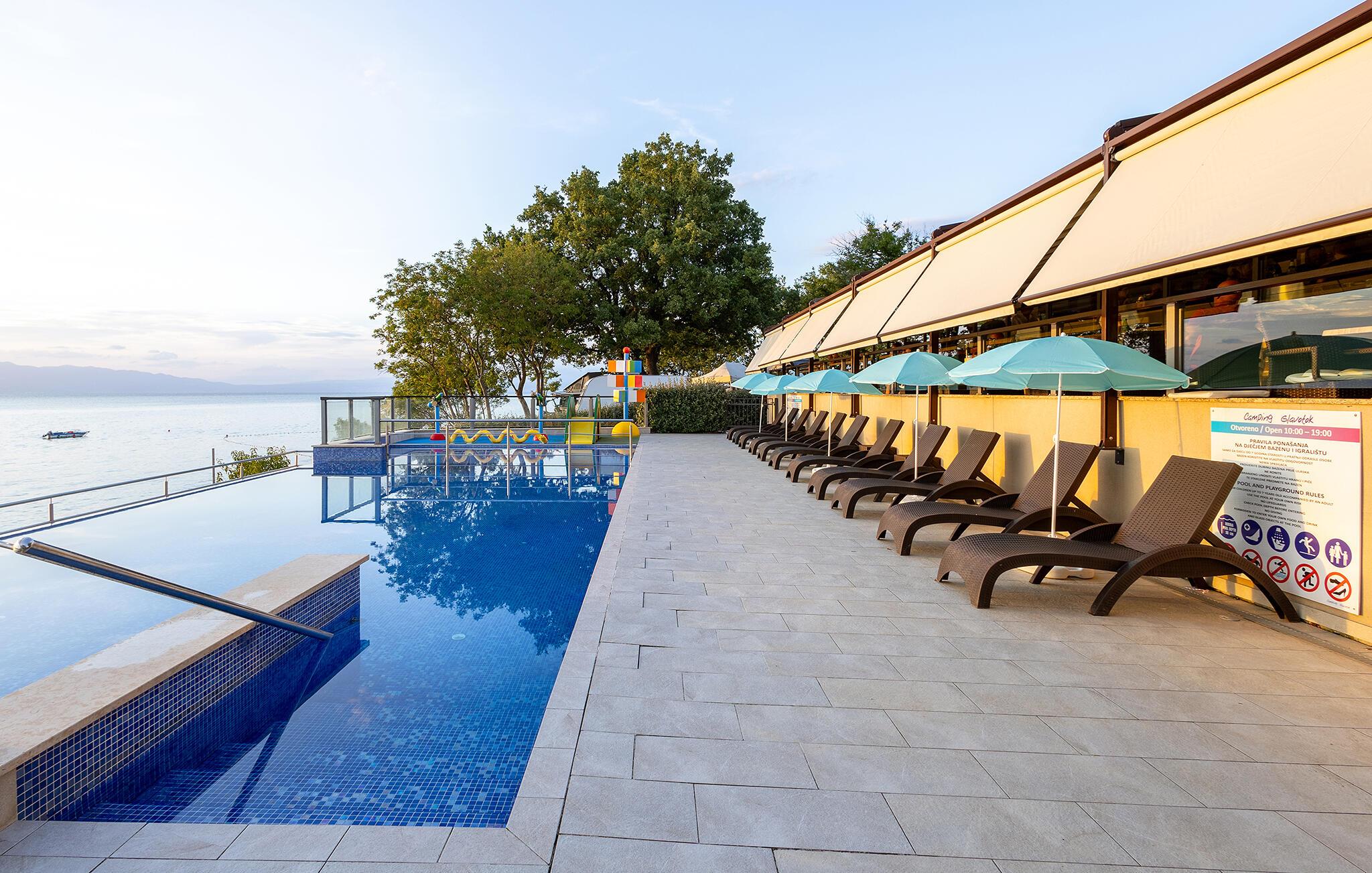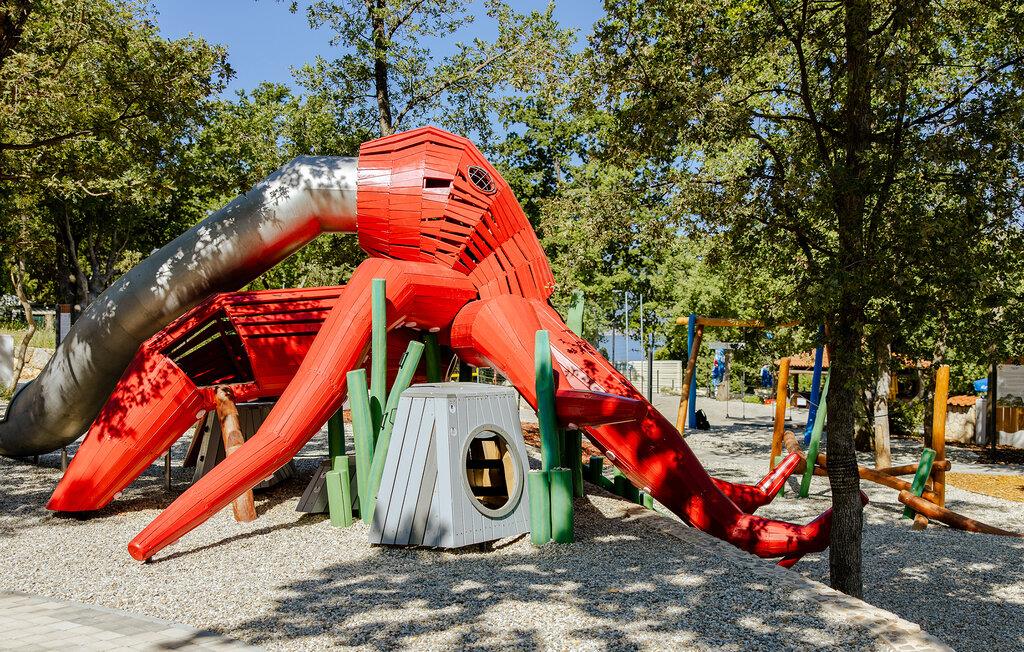 Om morgenen er jeres dejlige terrasse det perfekte sted at nyde morgenmaden, inden I tager en forfriskende dukkert i den fælles pool. Yngre gæster kan plaske rundt i børnepoolen og have det sjovt på trampolinen eller på legepladsen. Spil basketball eller beachvolley, hold jer i form på fitnessudstyret og snak med andre gæster ved hyggelige grillaftener.