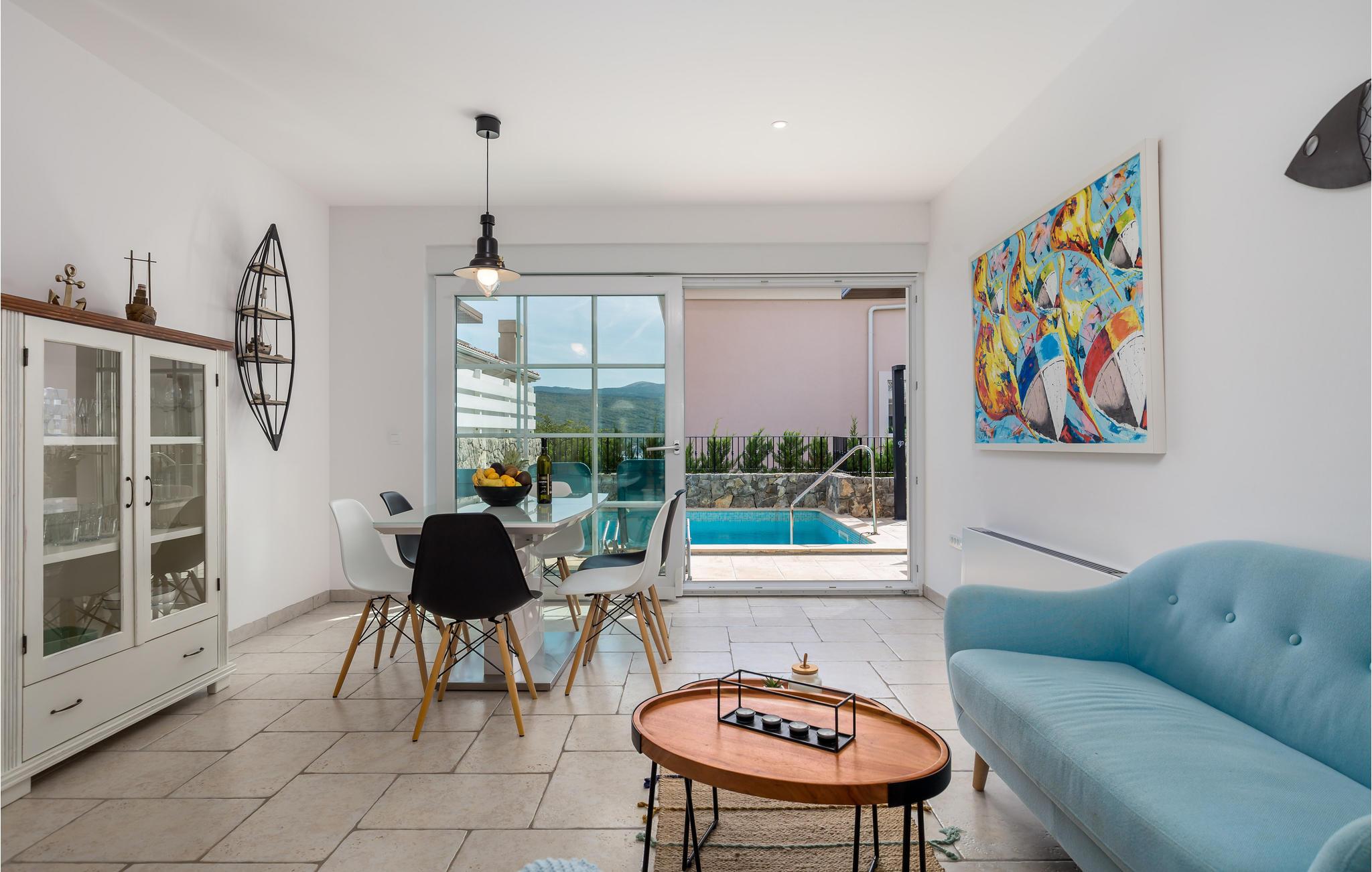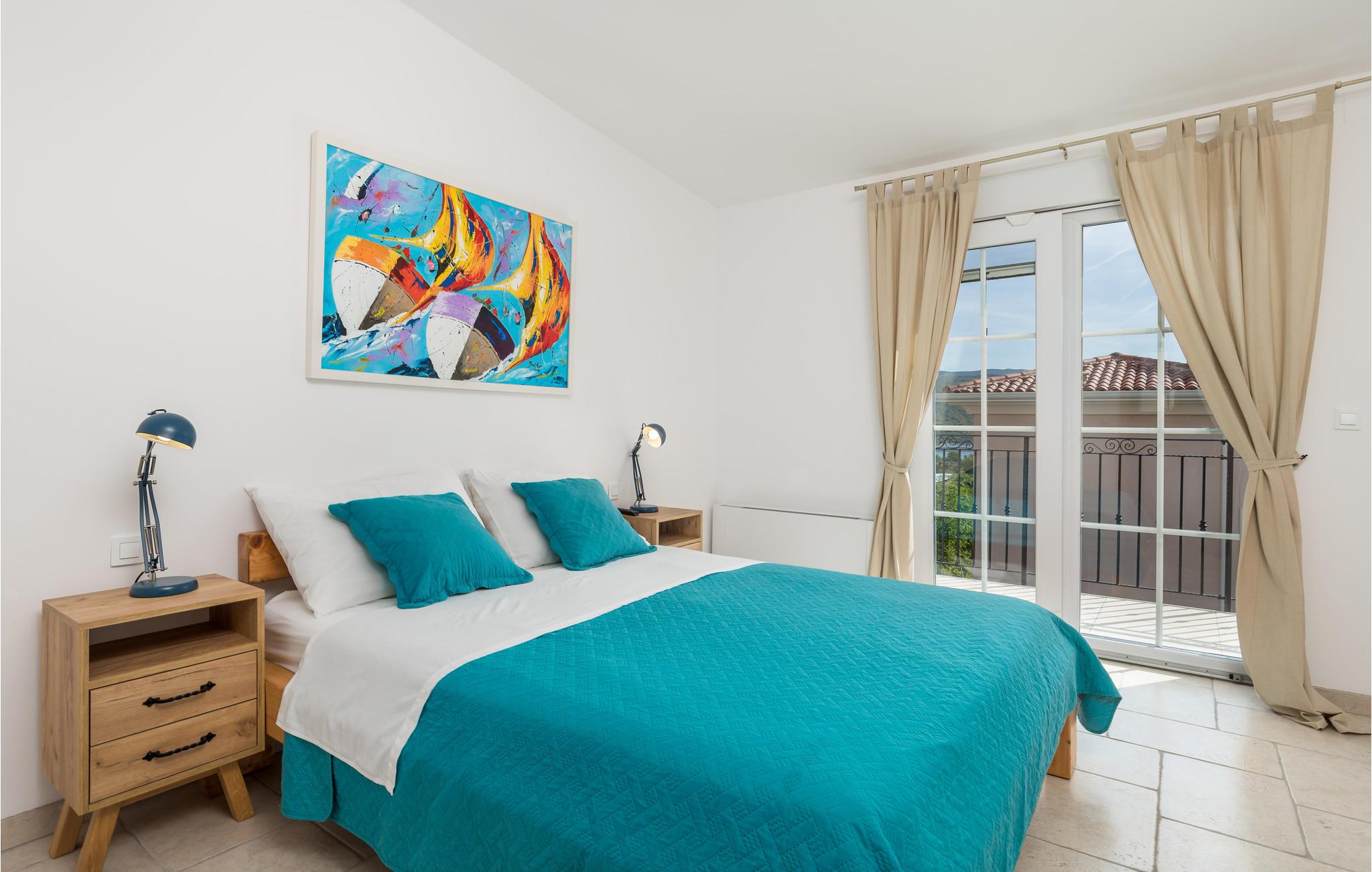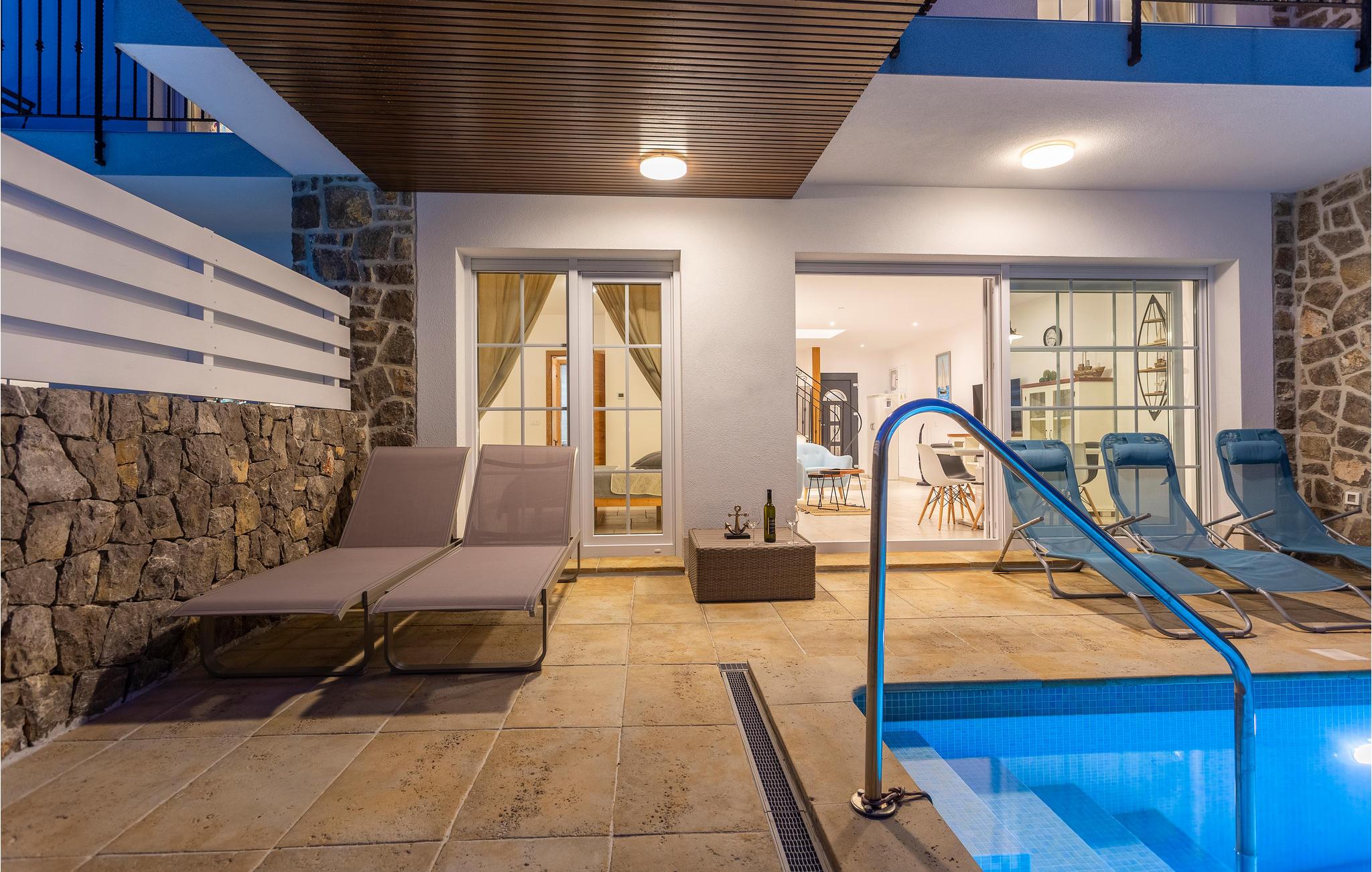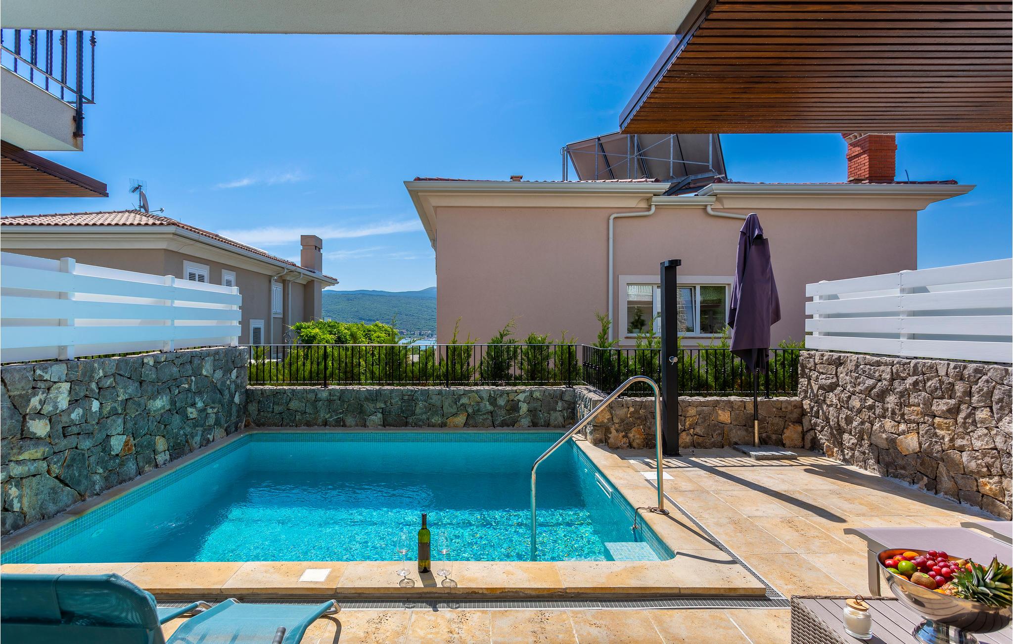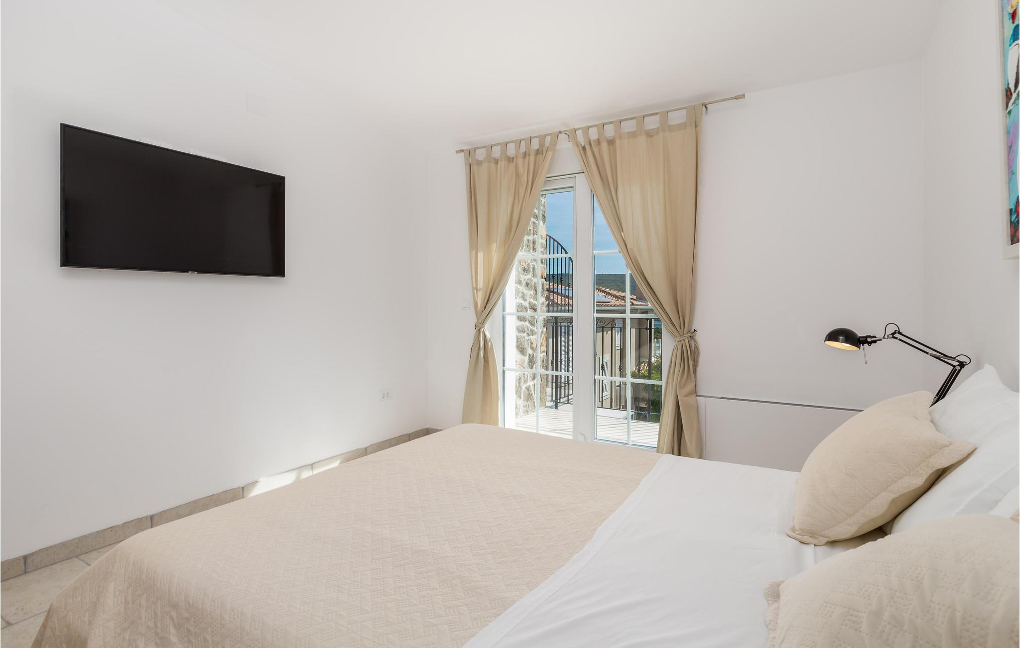 På øen Krk i den lille by Kornic ligger dette vidunderlige feriehus med egen privat pool. Det ligger kun fem minutter i bil fra den historiske by Krk og fra Punat med sin godt beskyttede havn. På grund af beliggenheden på en pakke er der en fantastisk udsigt over havet og de sølvgrønne olivenlunde, som denne region er så berømt for. Huset er indrettet med kærlighed helt ned i de små detaljer og bygget helt traditionelt, og indrettet med en vellykket blanding af gammelt og moderne. Fra stuen er der direkte udgang til terrassen med grill, loungehjørne og område til solbad samt til den opvarmede pool. Det største soveværelse ligger i stueplan og resten på første sal. I huset er der klimaanlæg, gulvvarme og I kan parkere på den store indhegnede grund.