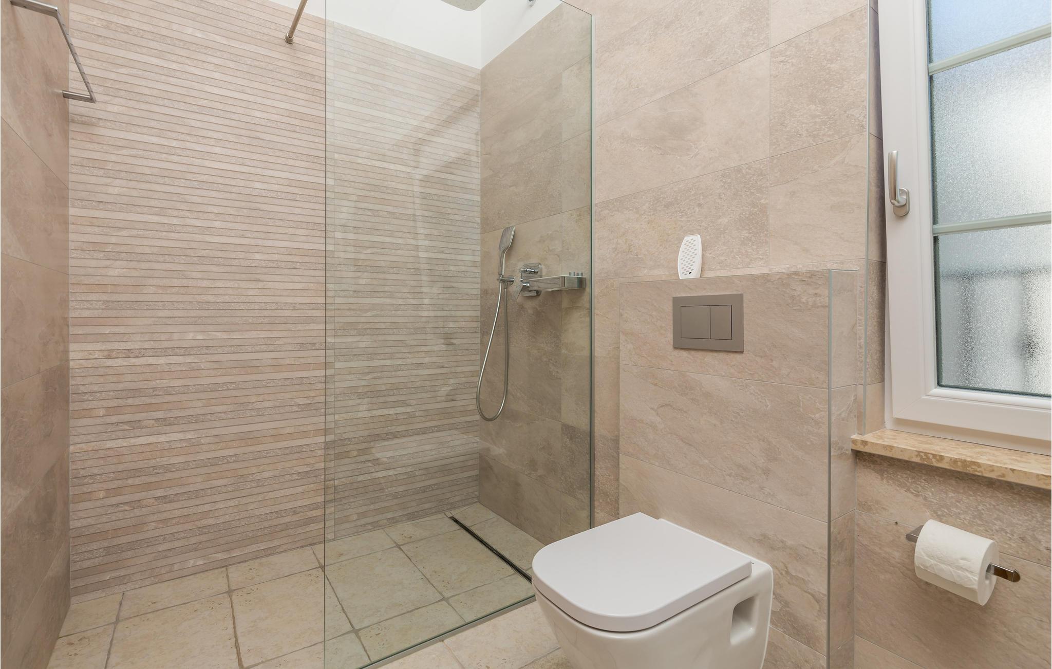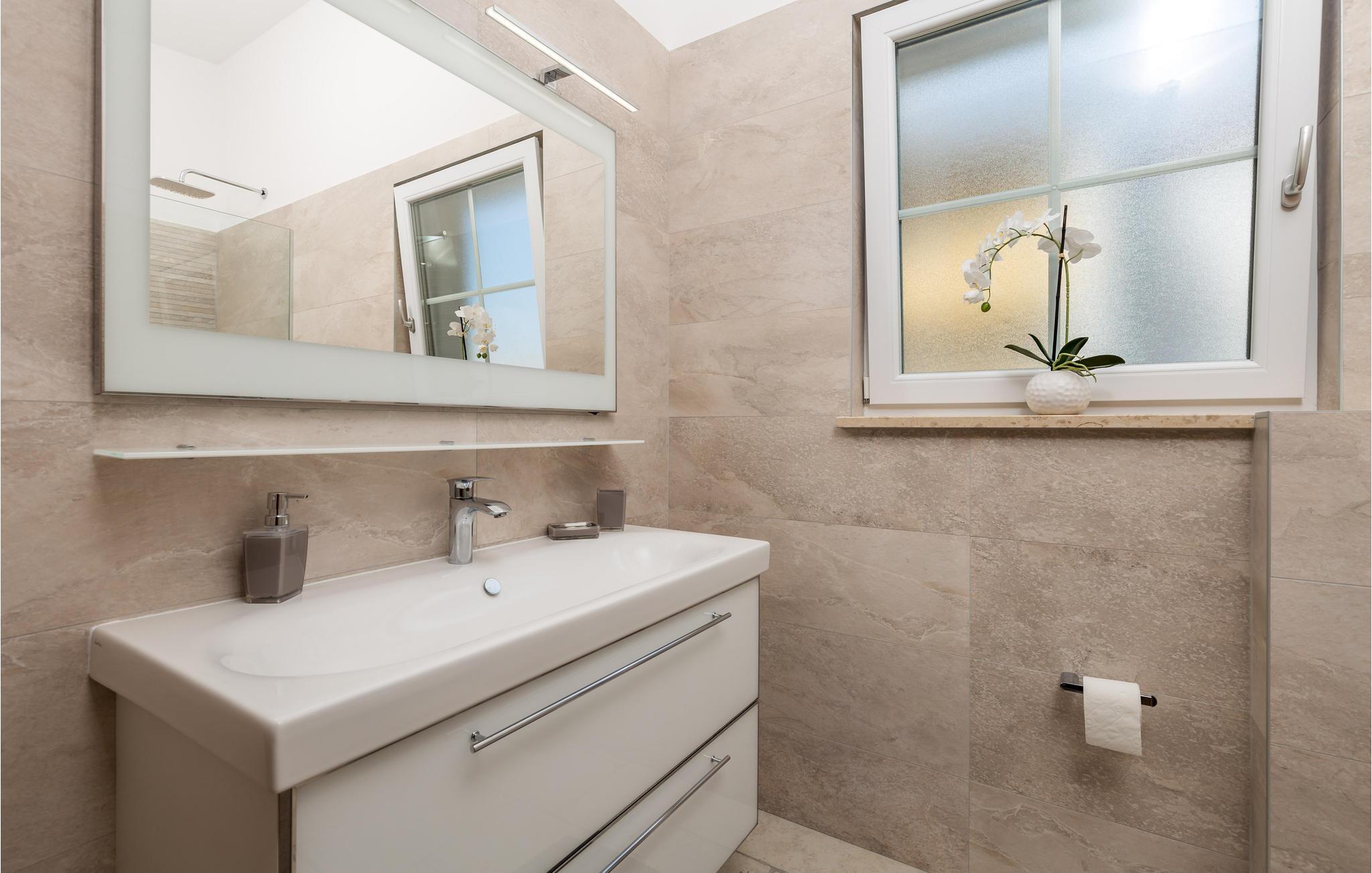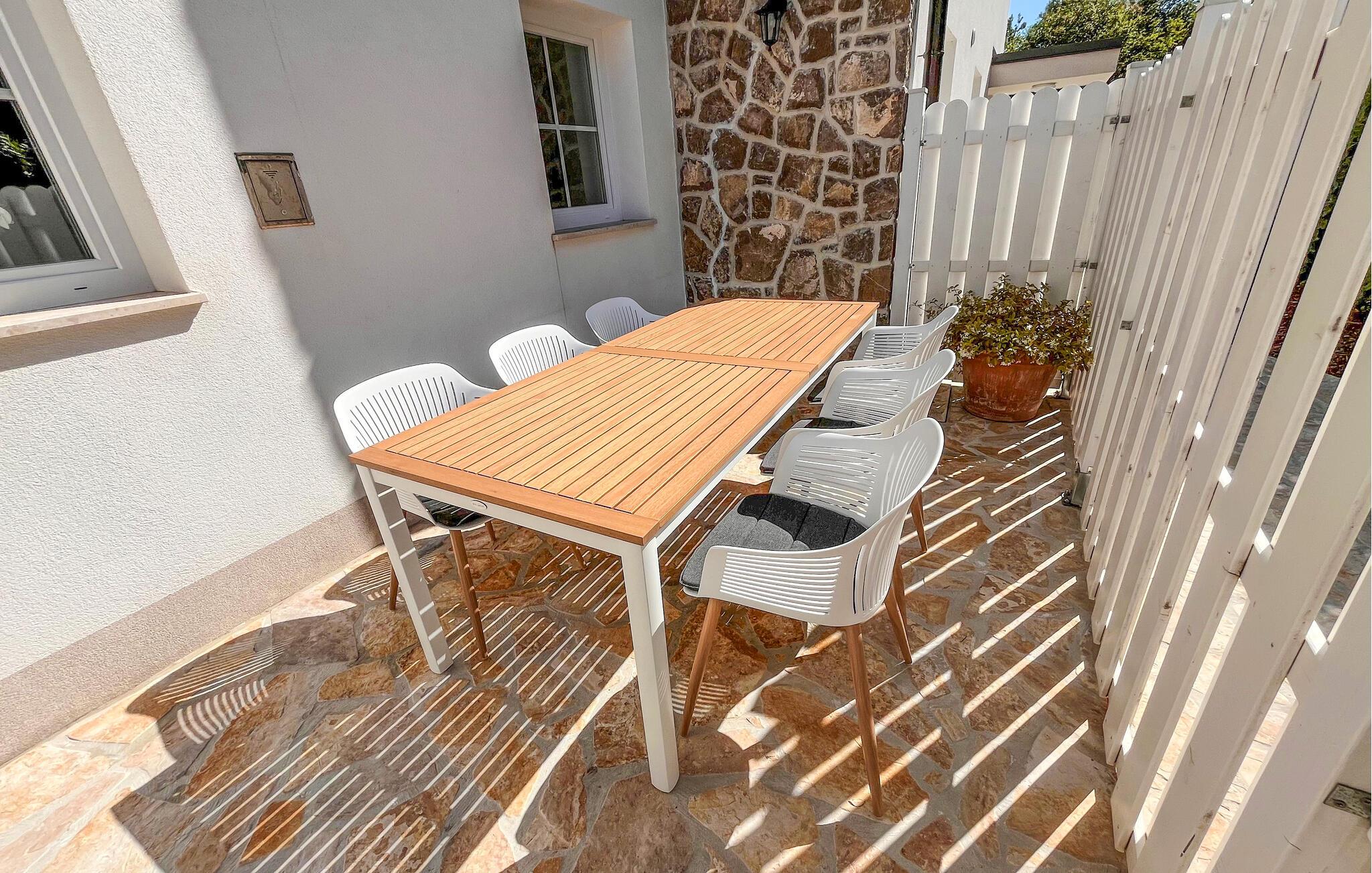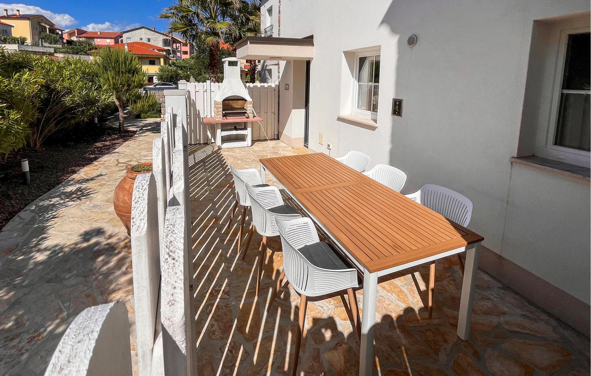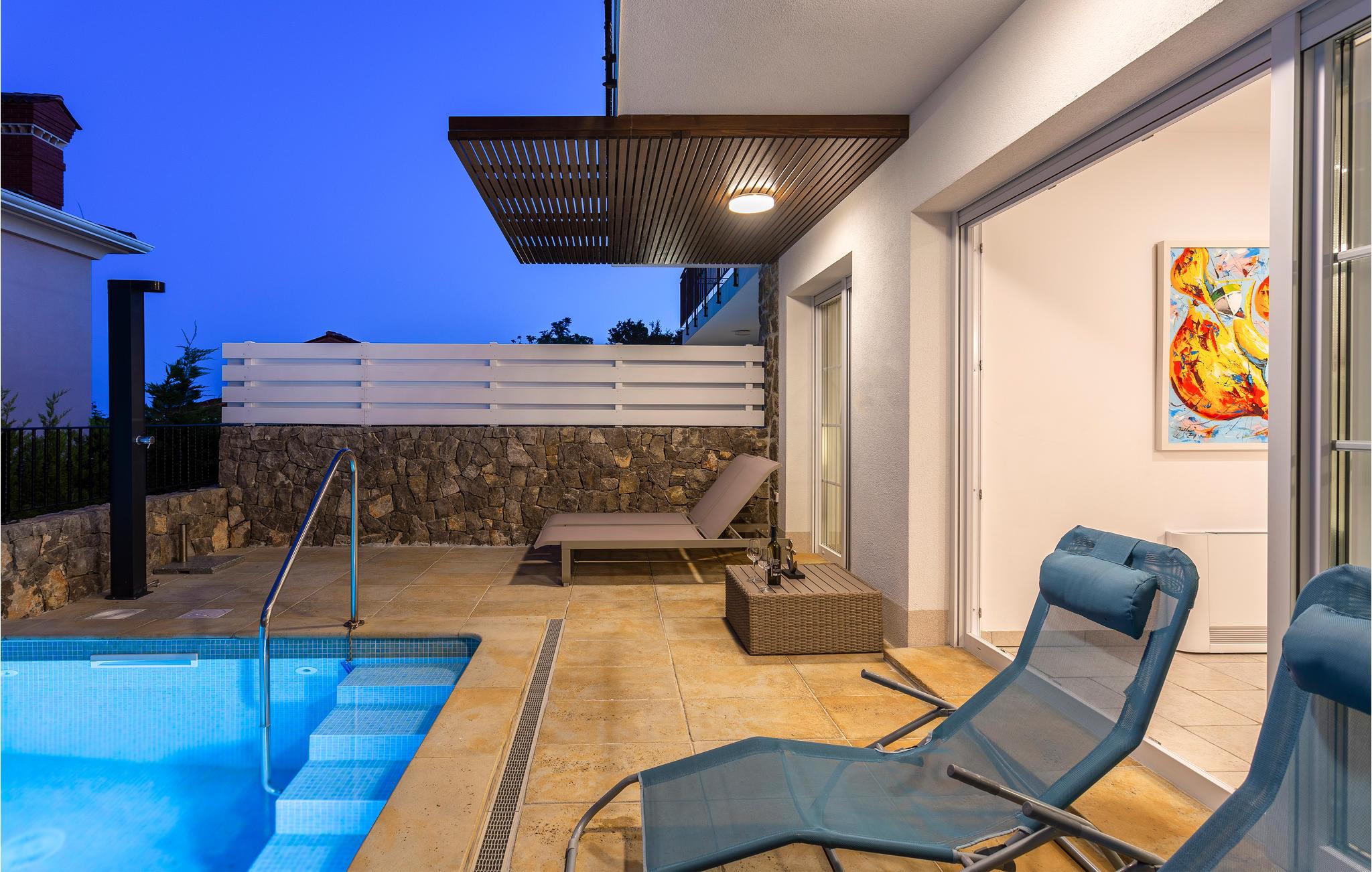 På øen Krk i den lille by Kornic ligger dette vidunderlige feriehus med egen privat pool. Det ligger kun fem minutter i bil fra den historiske by Krk og fra Punat med sin godt beskyttede havn. På grund af beliggenheden på en pakke er der en fantastisk udsigt over havet og de sølvgrønne olivenlunde, som denne region er så berømt for. Huset er indrettet med kærlighed helt ned i de små detaljer og bygget helt traditionelt, og indrettet med en vellykket blanding af gammelt og moderne. Fra stuen er der direkte udgang til terrassen med grill, loungehjørne og område til solbad samt til den opvarmede pool. Det største soveværelse ligger i stueplan og resten på første sal. I huset er der klimaanlæg, gulvvarme og I kan parkere på den store indhegnede grund.