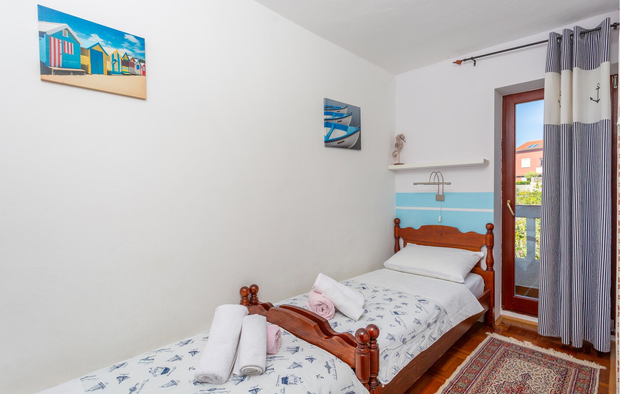 I en rolig bydel til Krk på øen af samme navn, ligger denne enkelt og funktionelt indrettede ferielejlighed. den ligger på første sal og består af opholdsrum, køkken, ekstra toilet samt tre soveværelser, tre badeværelser samt fler eterrasser. den indhegnede grund er dejlig grøn, og I kan slappe dejligt af her, men strandene ligger ikke langt fra lejligheden, og her findes et hav af aktiviteter til vands og på land; wakeboarding, ridning, cykling og vandreture på øens omfattende stisystem. Også de mange sommerarrangementer og lokale specialiteter er værd at undersøge.