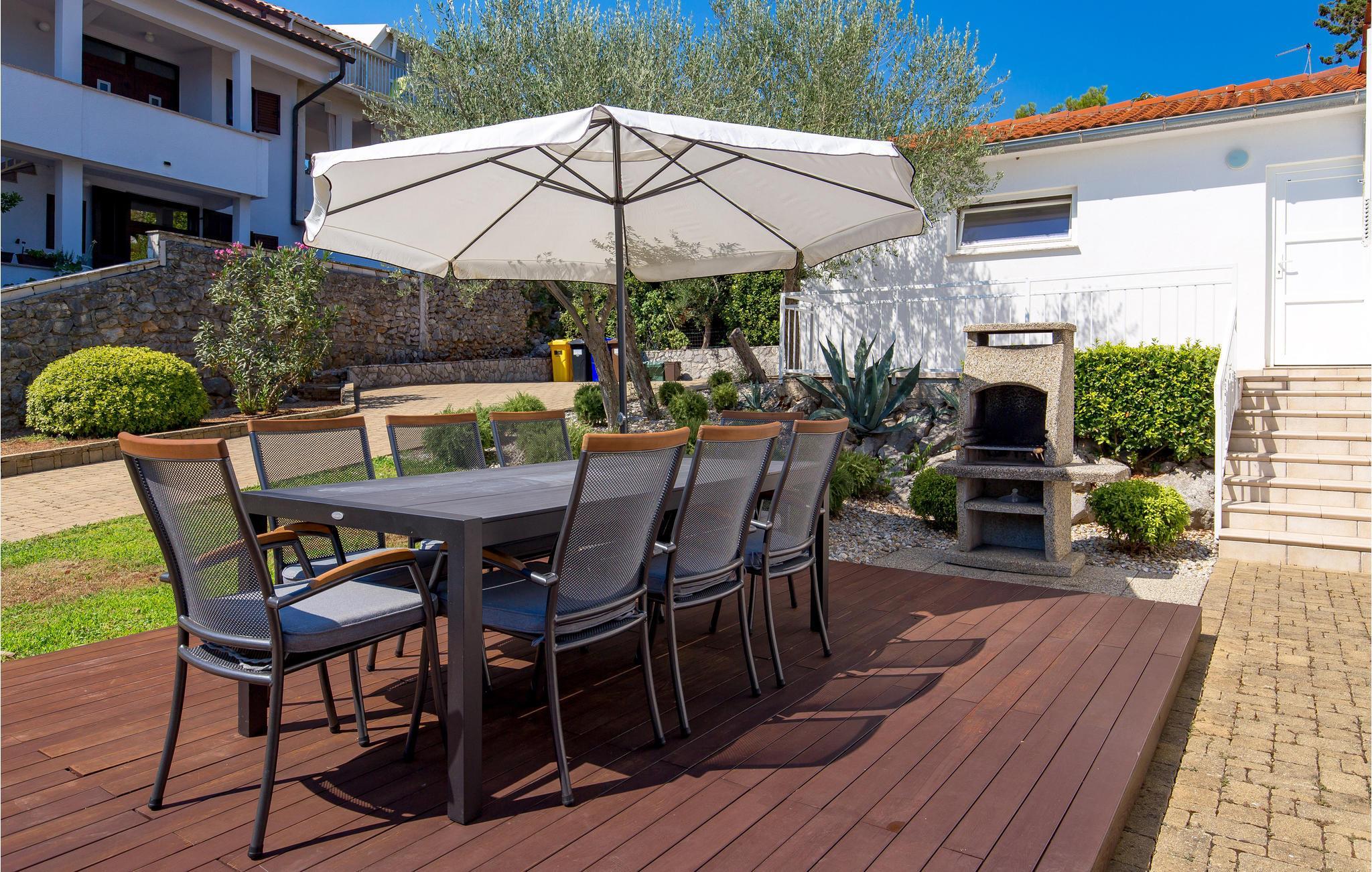 Det har en god beliggenhed i byen Krk, med stor indhegnet grund. Tre soveværelser, to badeværelser og et køkkenalrum udgør husets indre. Etagerne er forbundet via en udvendig trappe.