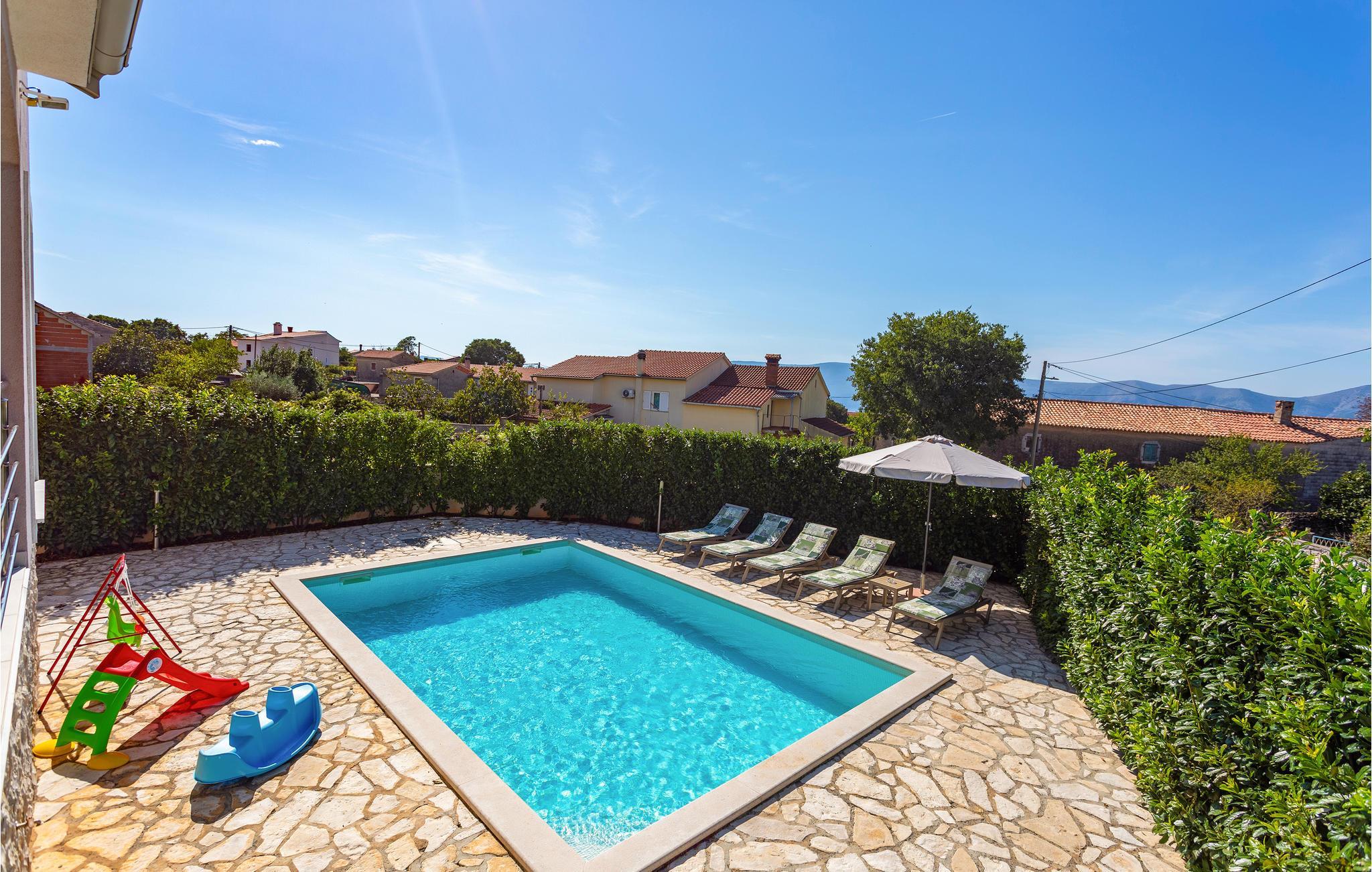 Dette komfortable feirehus ligger i Linardici på øen Krk. Huset er ideelt for store familier eller grupper, der vil tilbringe ferien sammen med god plads. Fra terrassen er der en flot udsigt over byen, landskabet og havet. Foran huset er der en pool med behagelige solsenge i kanten, hvor I kan tage en dukkert eller ligge og solbade. Der er også en grill, som I frit kan benytte til nem og lækker feriemad. Gå på opdagelse på øen Krk, besøg Baška, som byder på en af de skønneste strande ved denne del af Adriaterhavet, eller Vrbnik, som er kendt for vinen Vrbnicka Žlahtina tag en flaske med hjem til aftensmaden. Besøg også drypstenshulen Biserujka og byen Krk hvis I kan slide jer løs fra jeres dejlige hus.