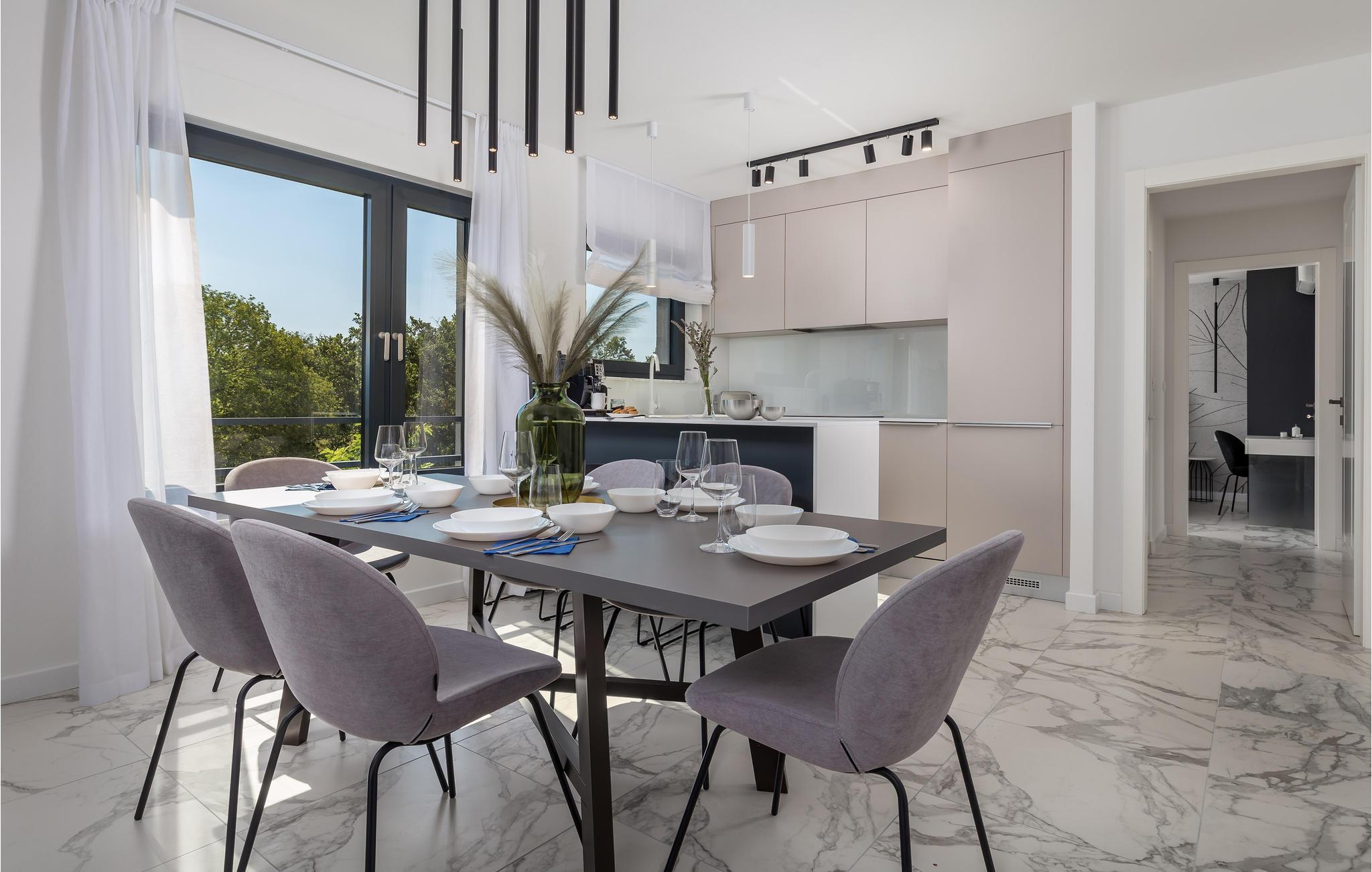 Det store, lyse køkken giver jer plads til at tilberede lækre måltider sammen med familien. Om morgenen kan I brygge en kop kaffe og sætte jer til rette på den rummelige balkon med udsigt til havet. Som alternativ har I den private tagterrasse med stort spisebord, som er oplagt til aftener med grillmad og kølige drinks. Jacuzzien har plads til fem personer, så her kan I forkæle jer selv med en rolig stund efter en lang dag på farten, nyde den fantastiske udsigt og måske en stjernehimmel, hvis I er længe oppe. I stuen kan I læne jer tilbage i sofaerne og se en film.
