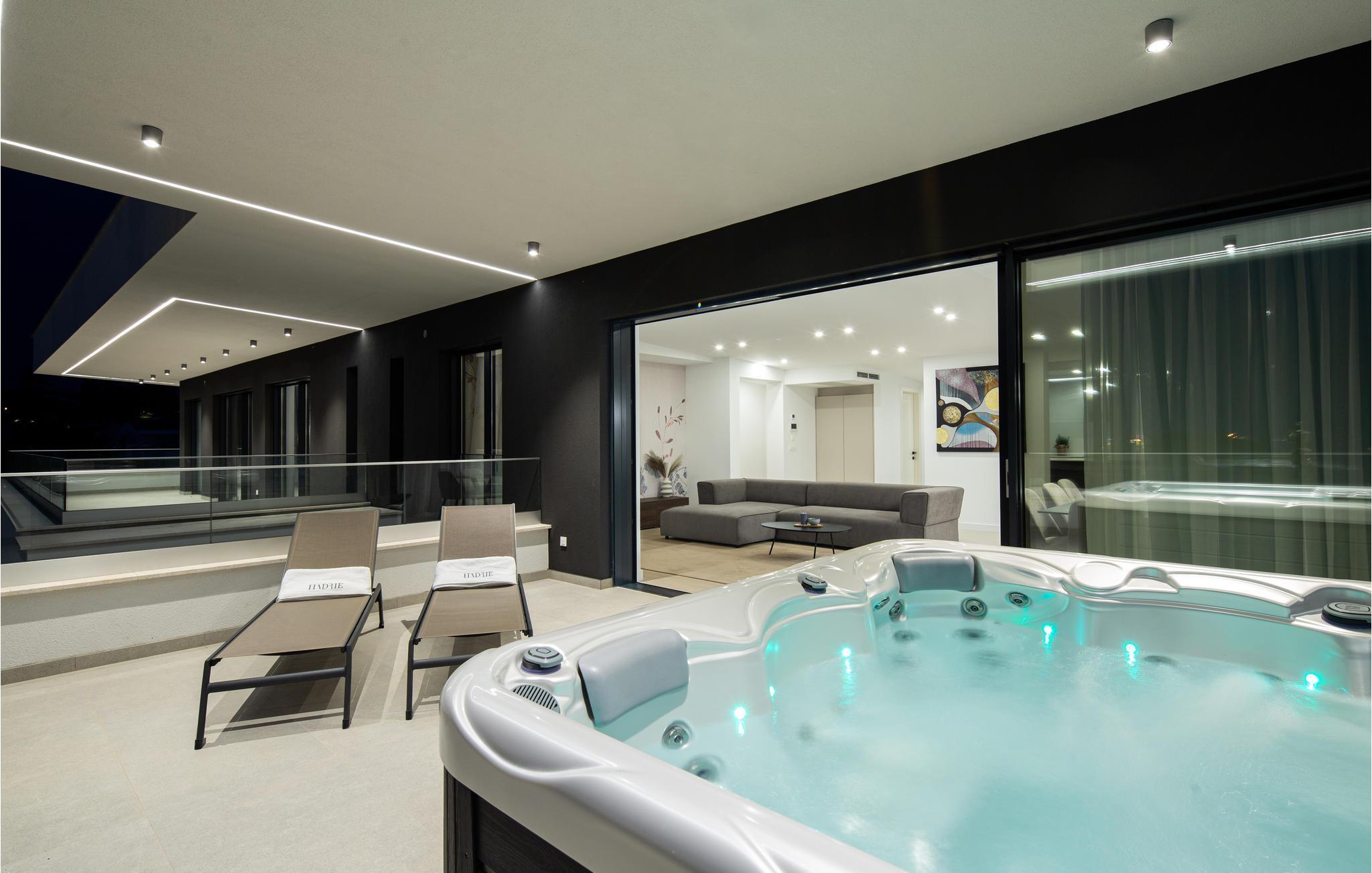 Udenfor er terrassen et vidunderligt sted at nyde solen i fulde drag. Her kan I bare dase i en liggestol eller koble helt af i jeres eget spa-bad.