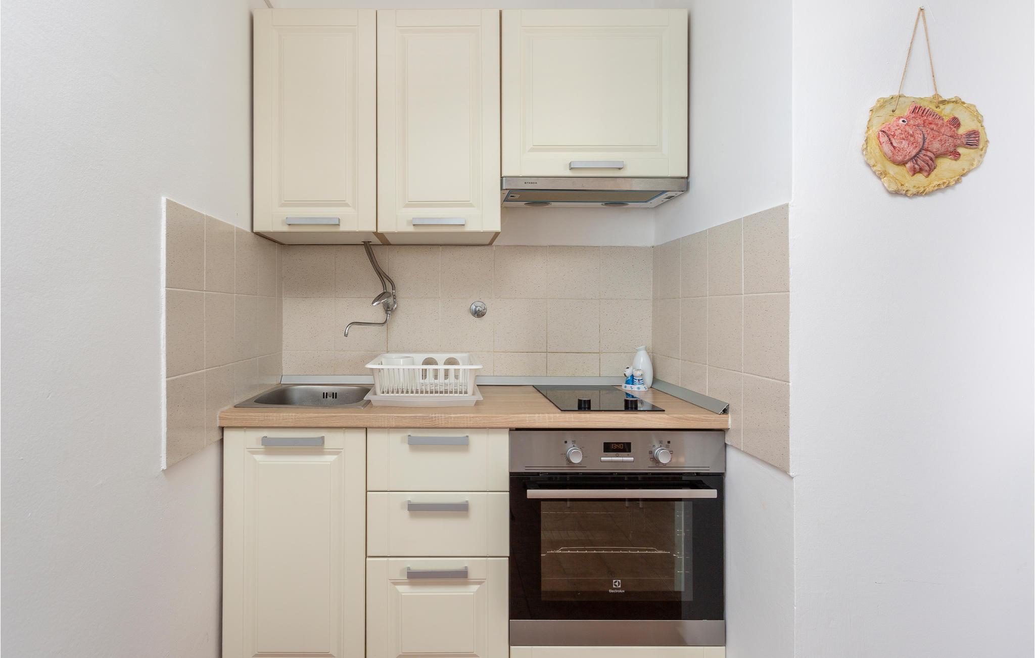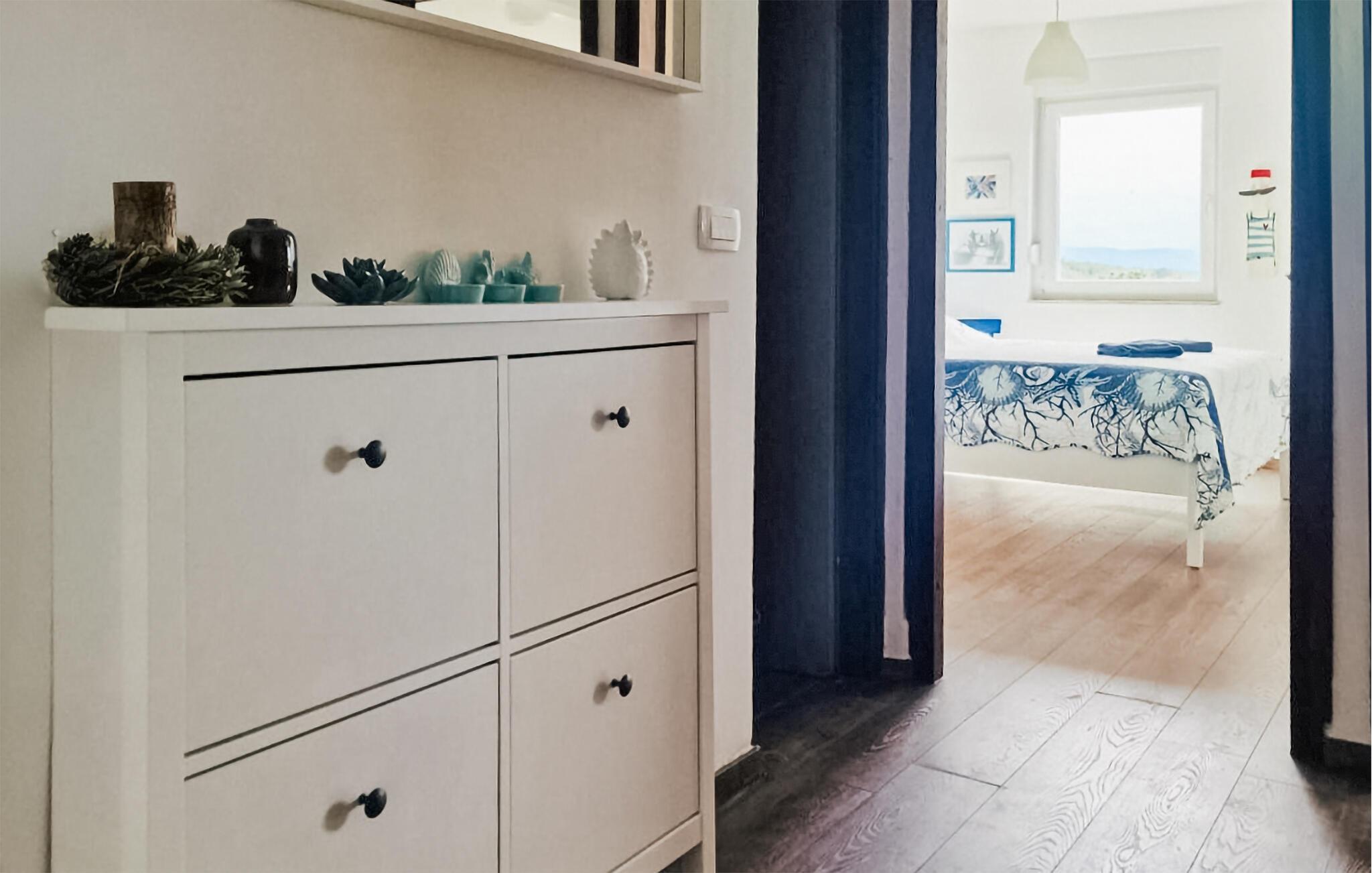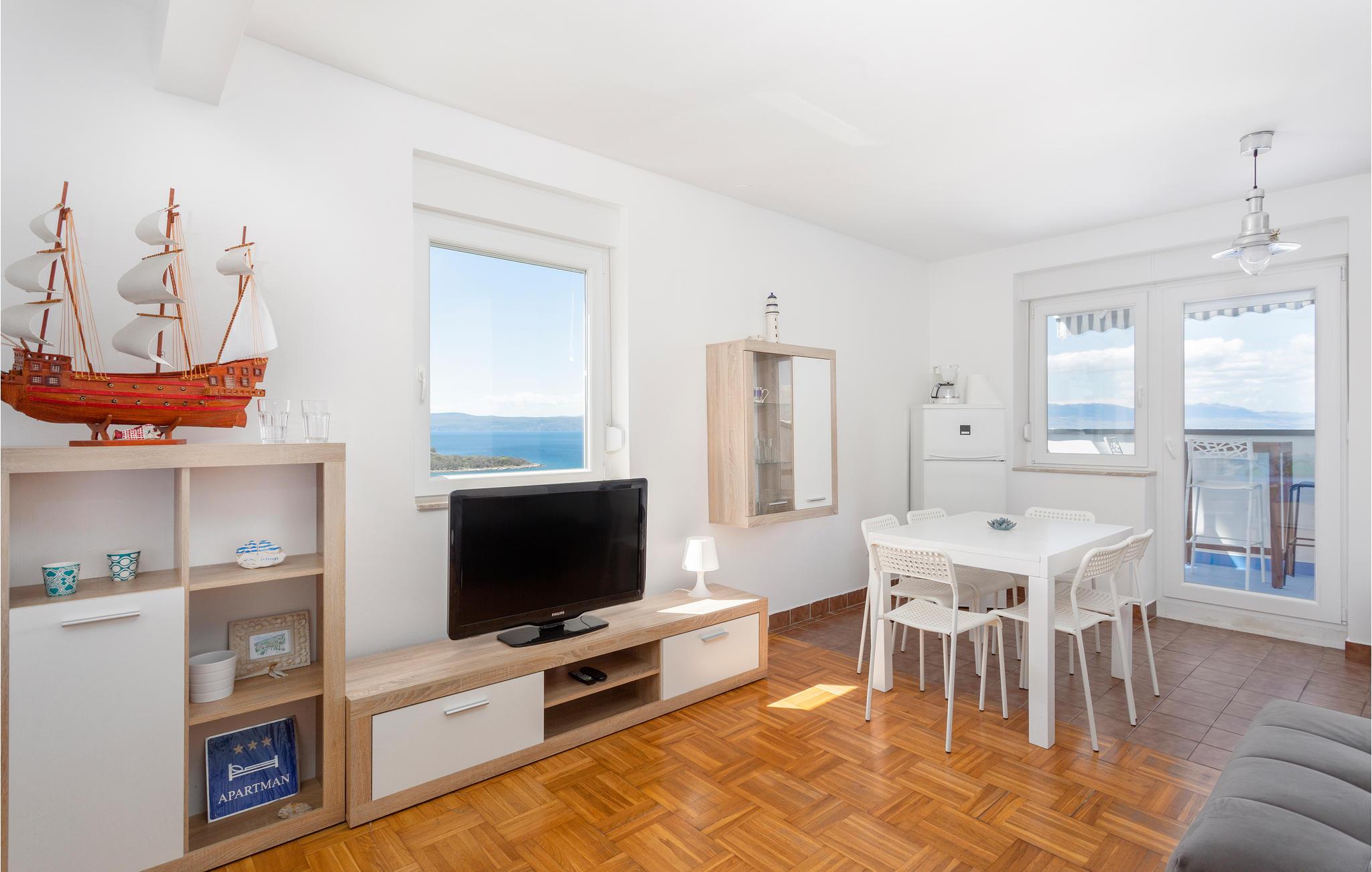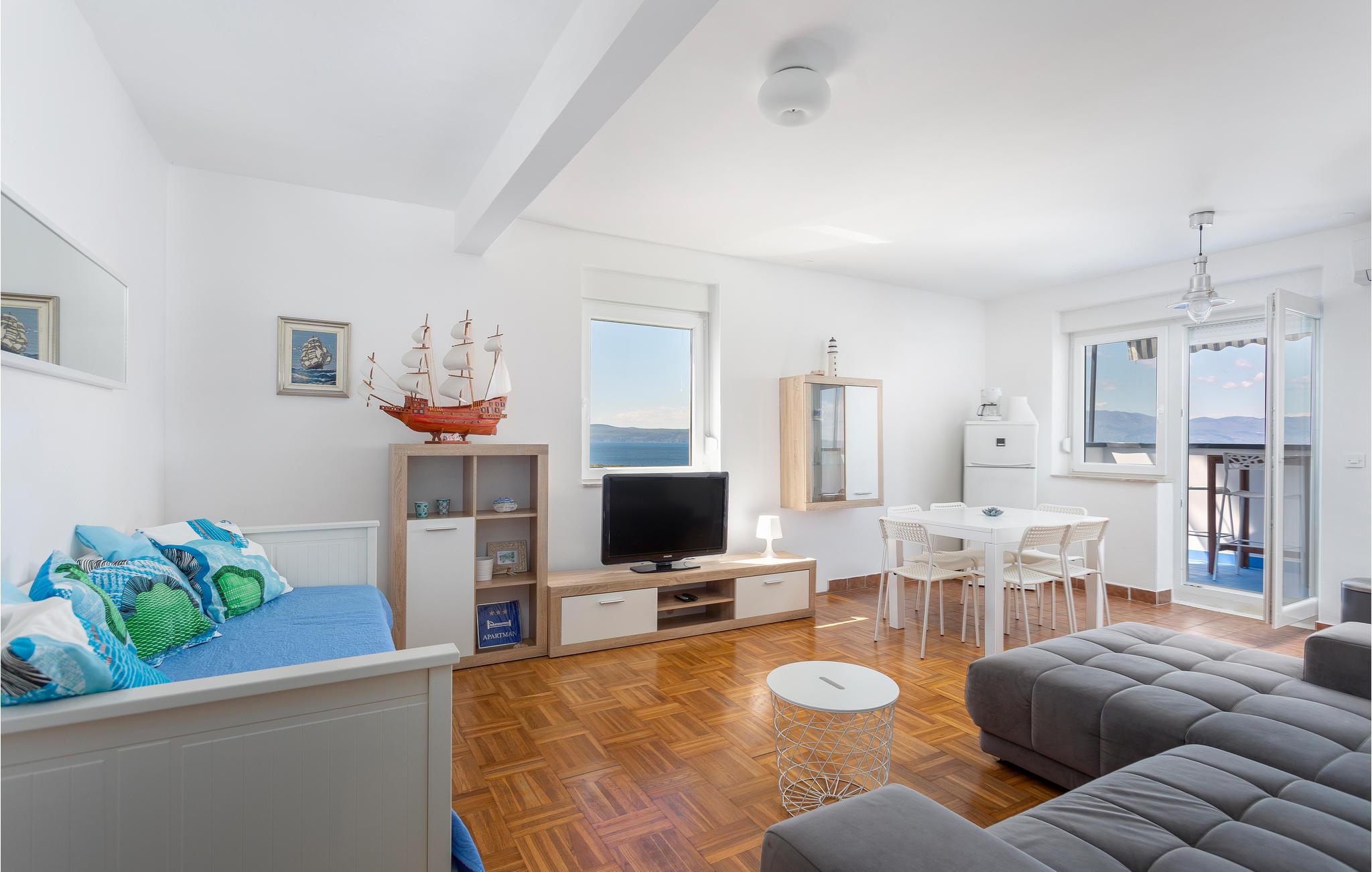 På den betagende smukke ø Krk ligger denne ferielejlighed, i en lille by uden for Njivice. Der er udsigt til det blå hav fra lejlighedens altan som ligger på fjerde sal. Kun få minutters gang skiller jer fra stranden. Den forhenværende fiskerby Njivice er i dag et populært mål for feriegæster fra foråret til efteråret, på grund af byens mange aktiviteter. Man kan f.eks. benytte øens vandre- og cykelstier til at nyde den rige natur, men der er også muligt at ride, og den aktive feriegæst kan finde adskilligt andre sportsgrene at fornøje sig med. Om aftenen byder byens restauranter jer velkommen til god mad, ligesom I får glæde af de mange koncerter og sommerarrangementer. I løbet af dagen anbefales det at besøge badestranden ved Baška eller byen Vrbnik som er berømt for sin vin žlahtina.