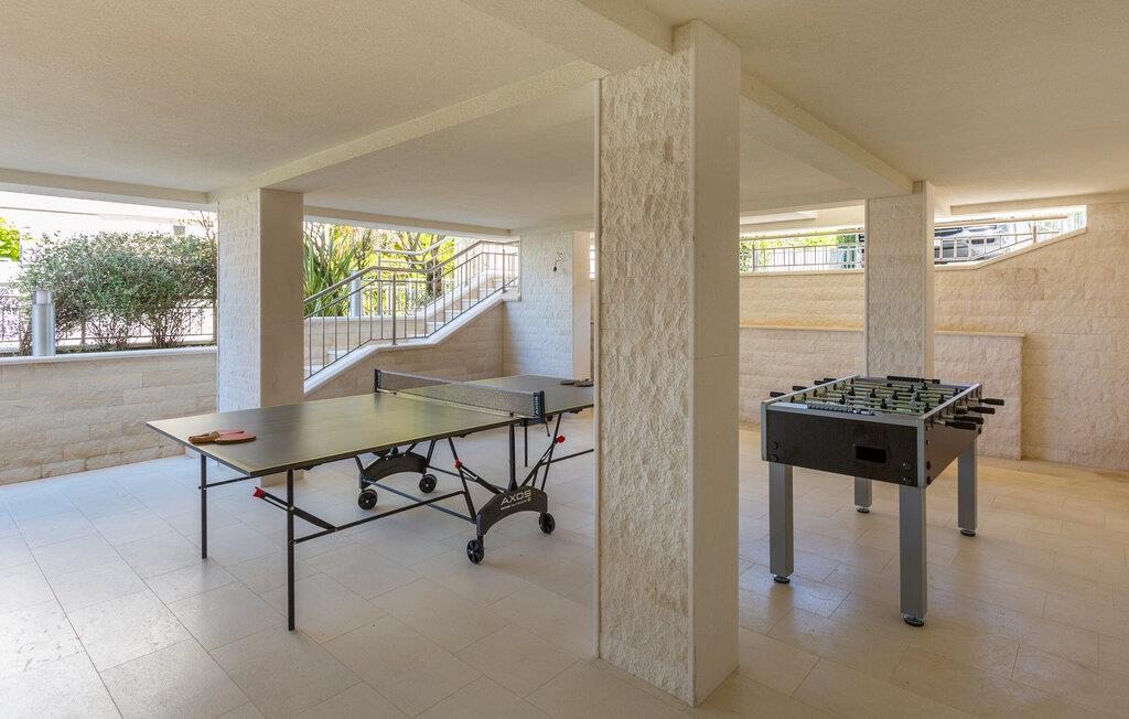 Udearealerne er lige så imponerende. Her kan I nyde solen fra morgen til aften på den smukke terrasse med en vanvittig panoramaudsigt over havet og udfordre flokken til et slag bordtennis eller bordfodbold i løbet af dagen. Når varmen er ved at få jer, kan I køle jer af i poolen og lufttørre på en af altanerne med en god bog.
