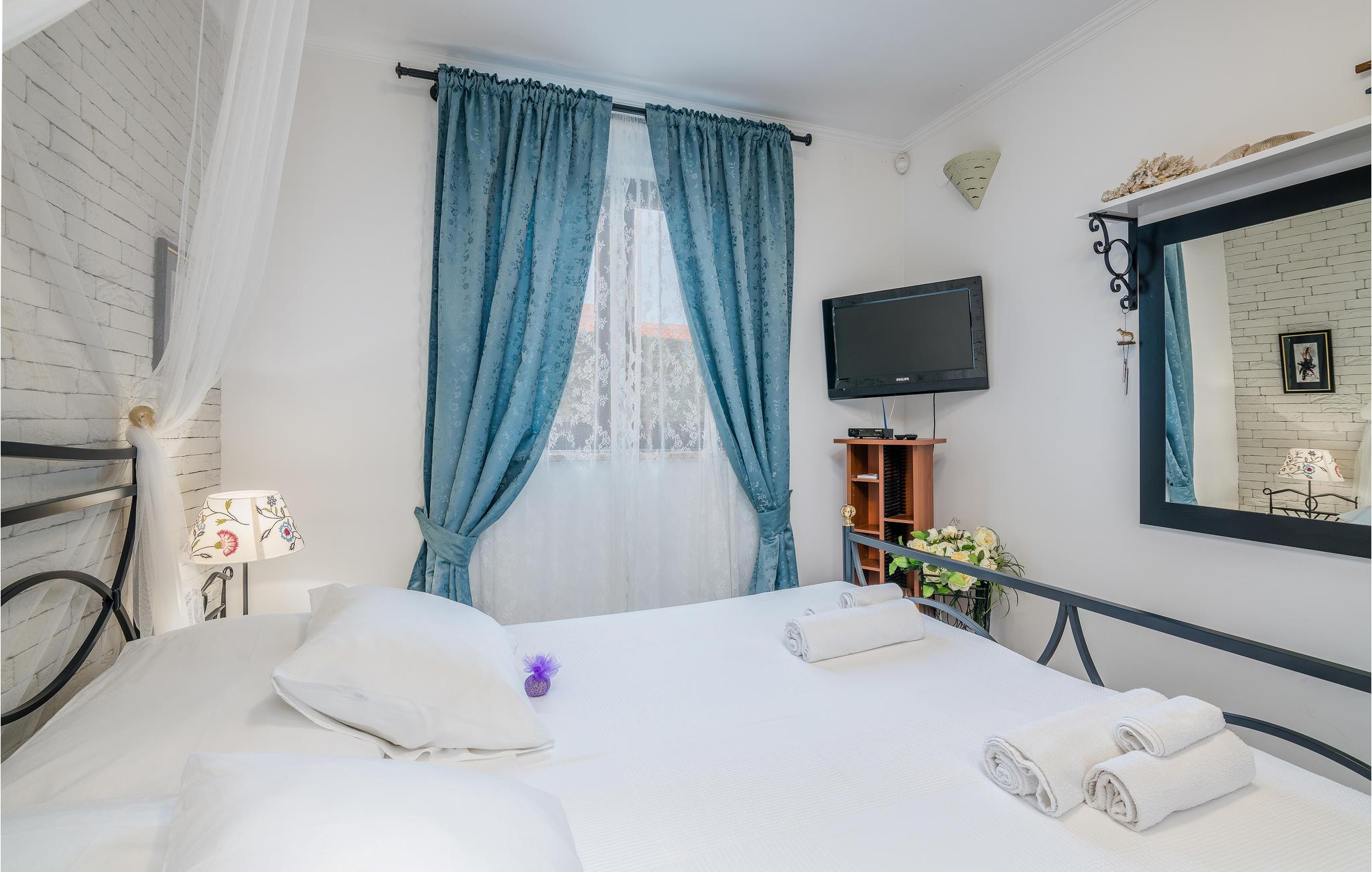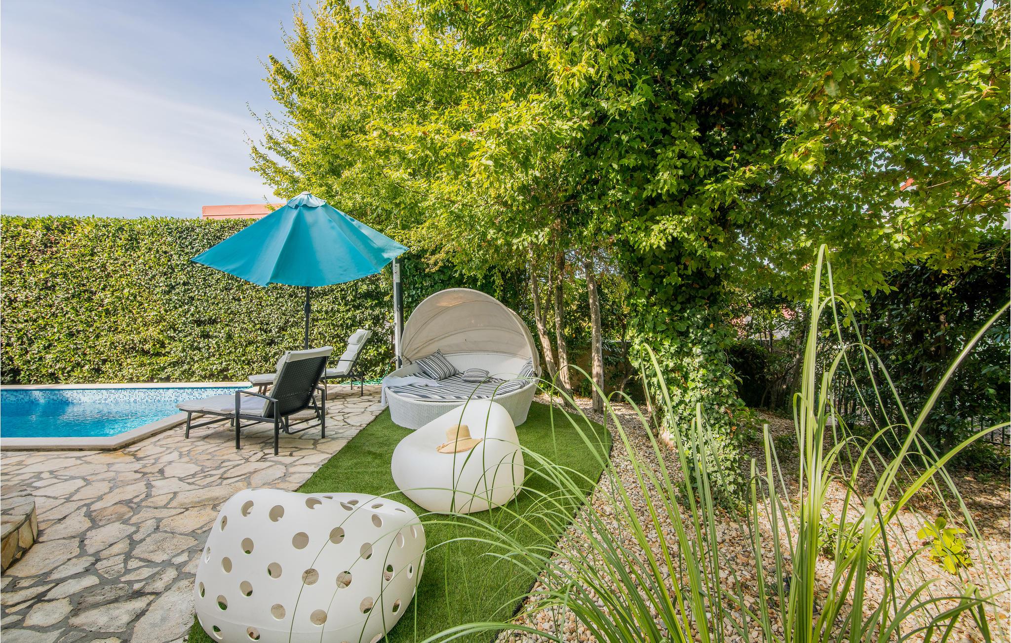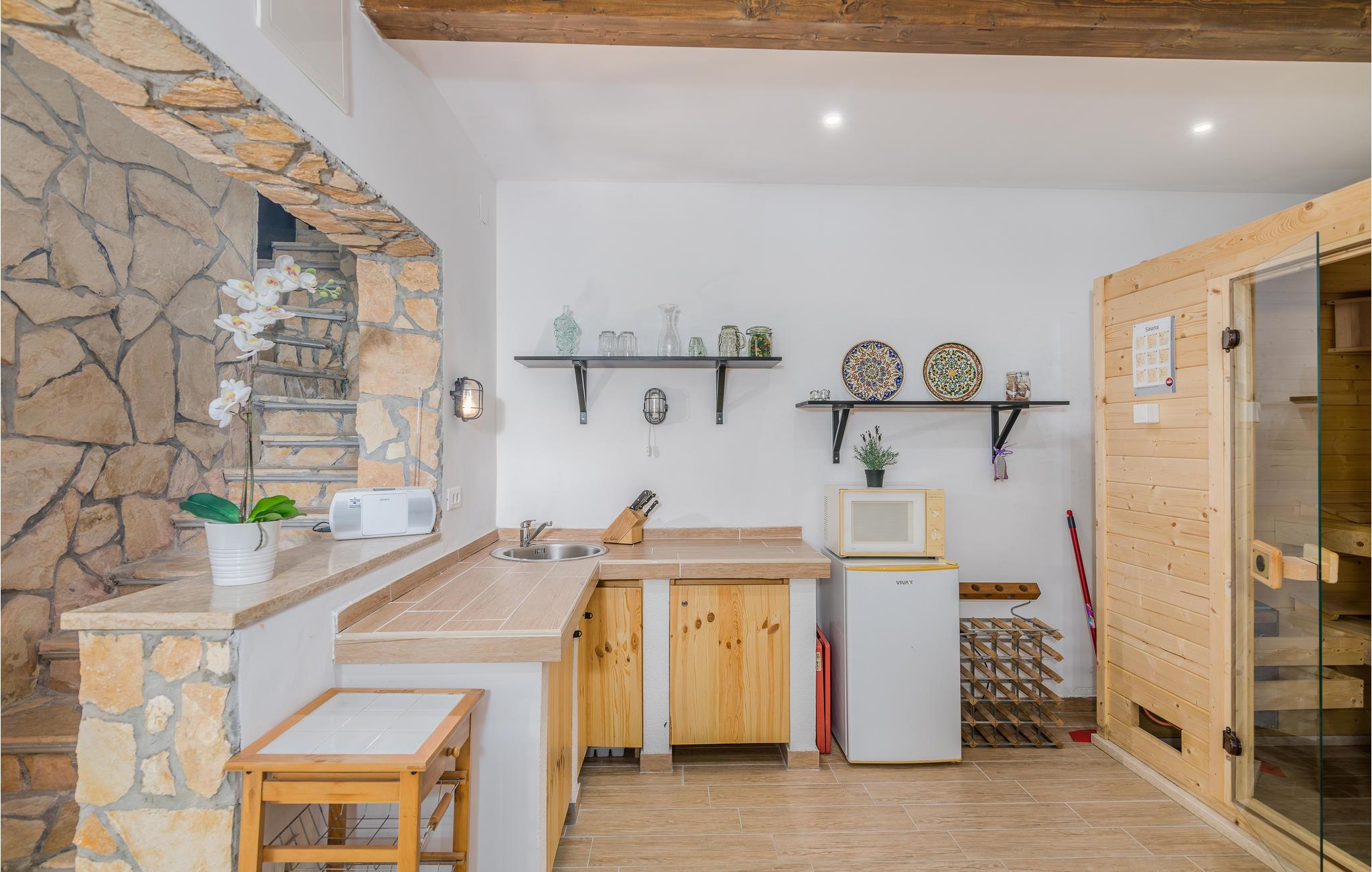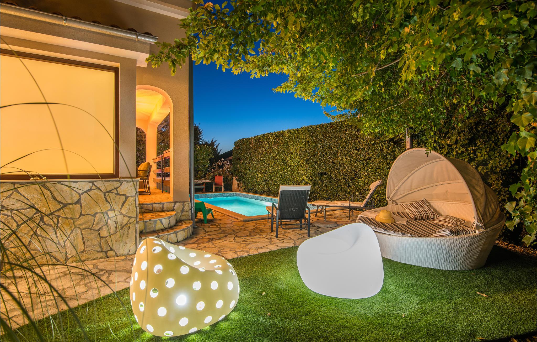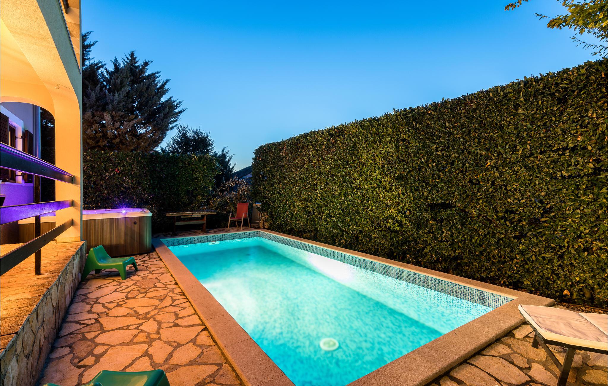 Dette venlige feriehus ligger i den forhenværende fiskerlandsby Njivice på øen Krk, der er vokset til en velrenommeret ferieby. Huset ligger dog i en mere rolig del af landsbyen, uden at være langt fra centrum og strandene. Der er en stejl trappe op til loftet, med laveste loftshøjde på 80 cm, hvor der er yderligere et soveværelse og badeværelse. I souterrain kan I tilbringe hyggelige stunder i fællesskab i opholdsrummet. Der ligger endnu en lille bungalow med køkken, badeværelse og stue på grunden. Forfrisk jer i poolen og slap af i solen, mens jeres børn leger.