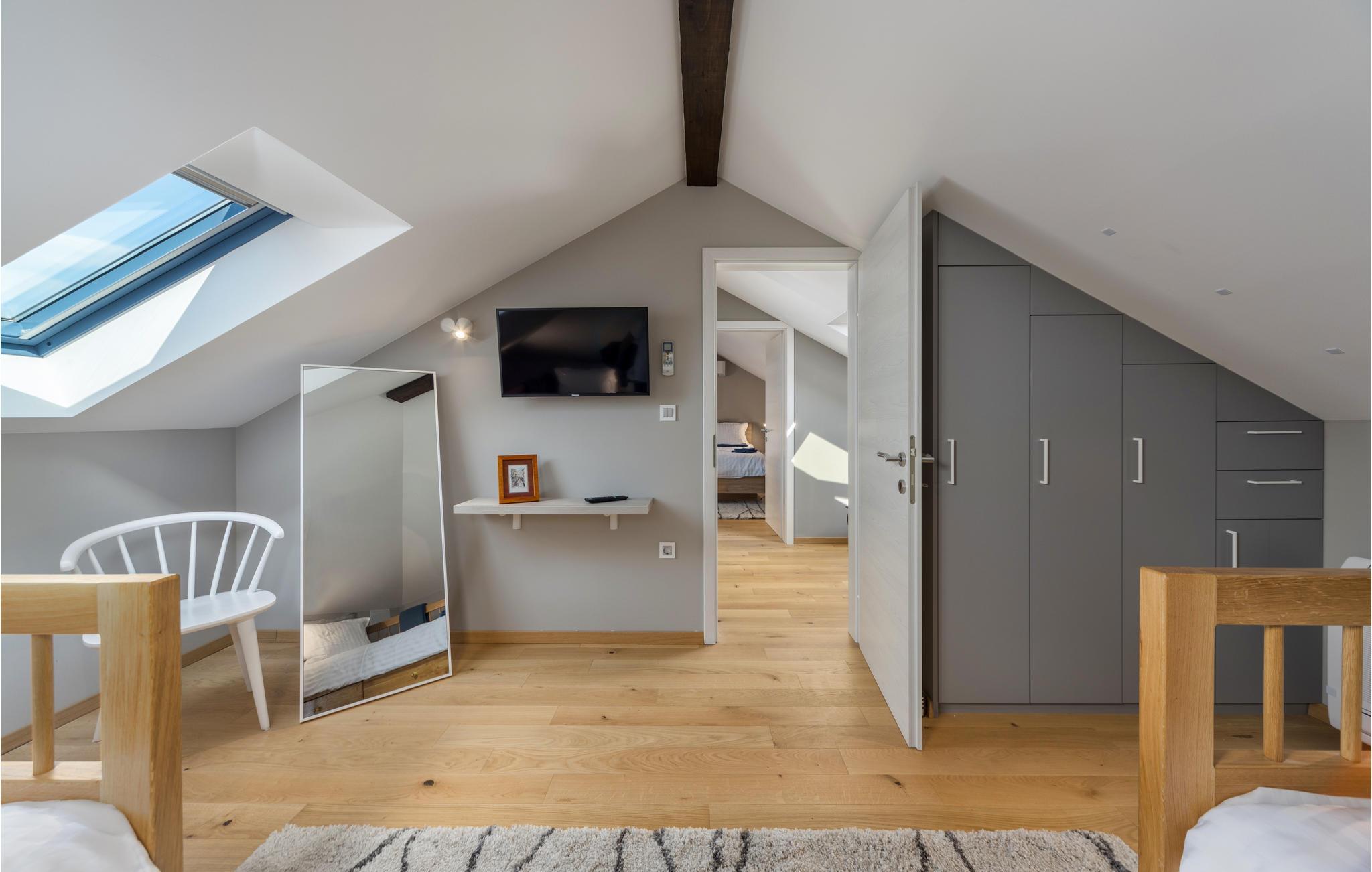 Huset har plads til 8 personer og et kæledyr. Det består af fire etager, der er forbundet med en intern trappe. I kælderen, som også er tilgængelig fra terrassen, er der et lille wellness-område med sauna og boblebad, et badeværelse og et rum, hvor børn kan lege og have det sjovt. Stuen og det veludstyrede køkken ligger i stueetagen, hvorfra man kommer til de to øverste etager med to soveværelser, hver med to badeværelser på første sal. Der er skråvægge ned til ca. 90 cm loftshøjde.