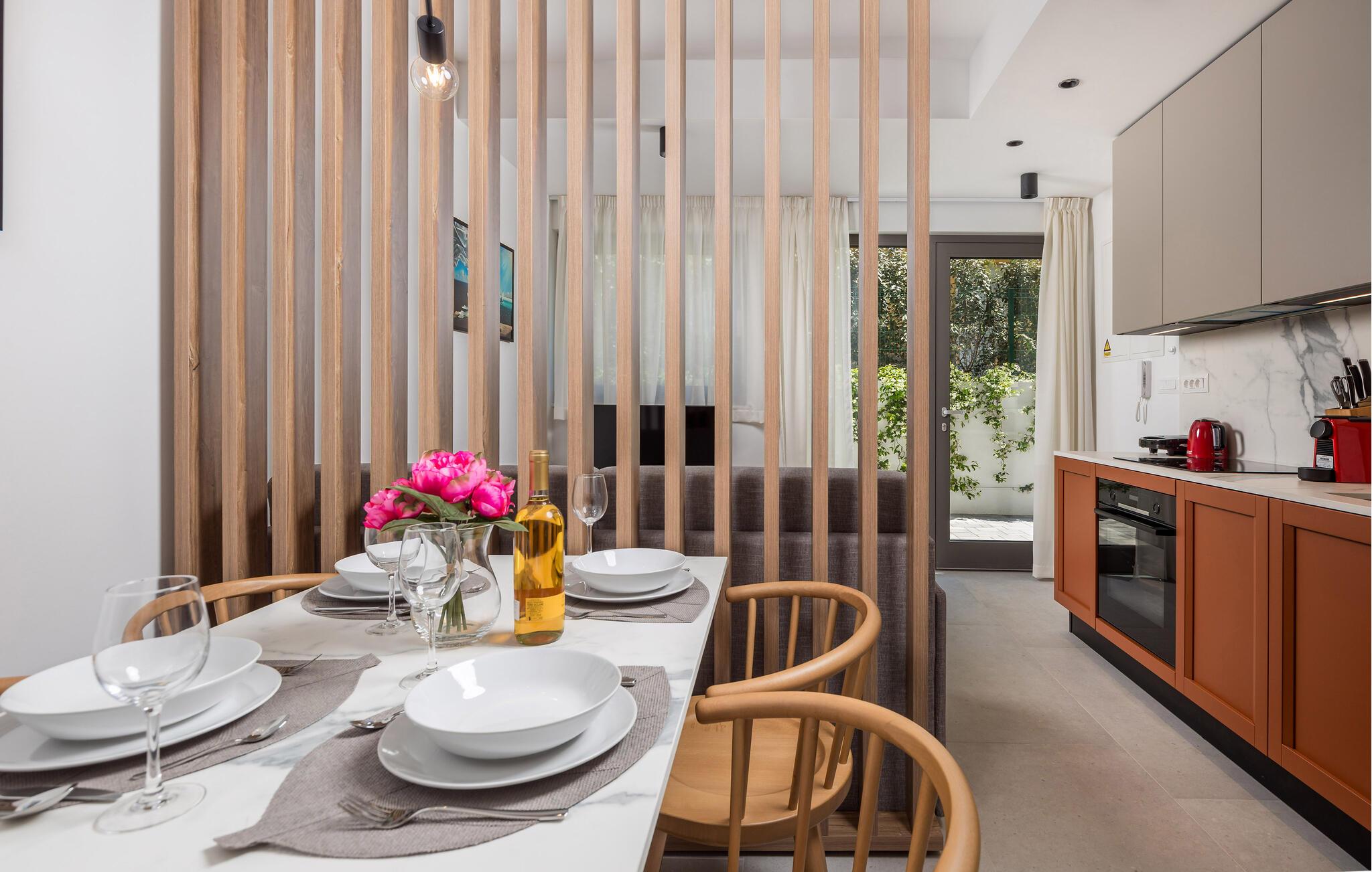 Tilbring jeres næste ferie i en luksuslejlighed med opvarmet fælles pool og privat have.